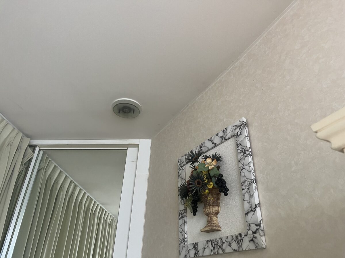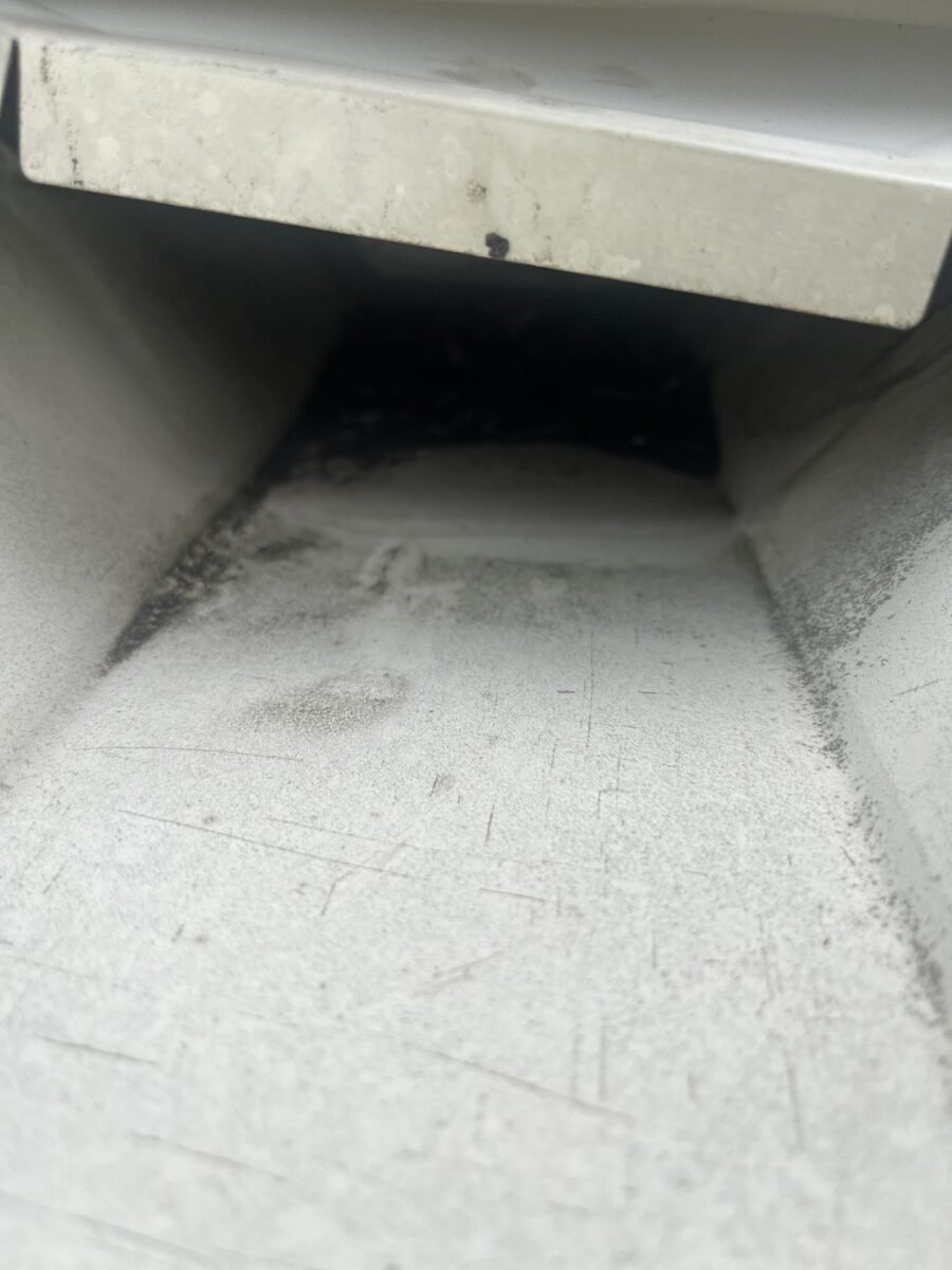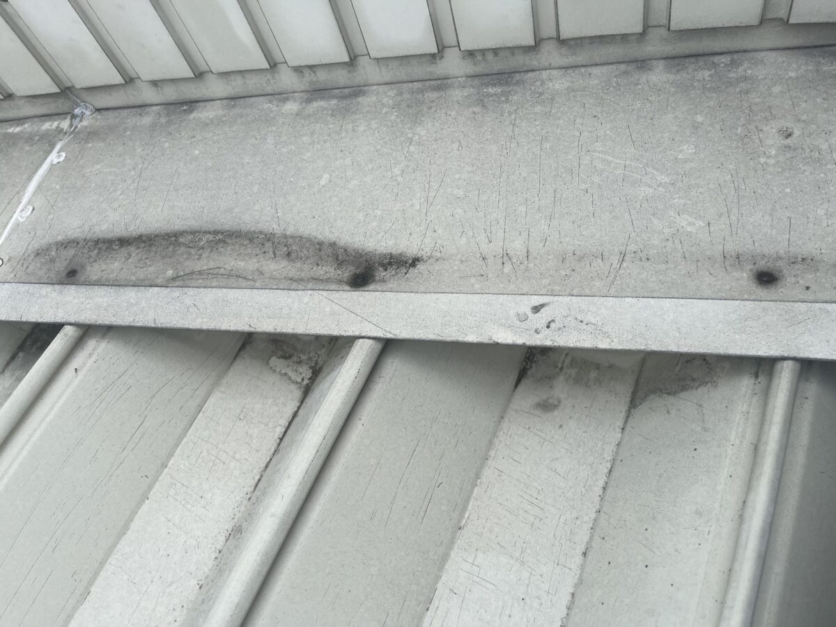 雨漏りの現場調査に伺ってきました、初めの聞き取り調査では壁際の照明器具からポタポタと水が落ちてきたそうです、築年数は20年程屋根は折板と言う情報と雨漏りした位置が水上部分に当たると言う事でほぼ折板の止め面戸のコーキングの劣化が原因だと思い屋根を確認しました。