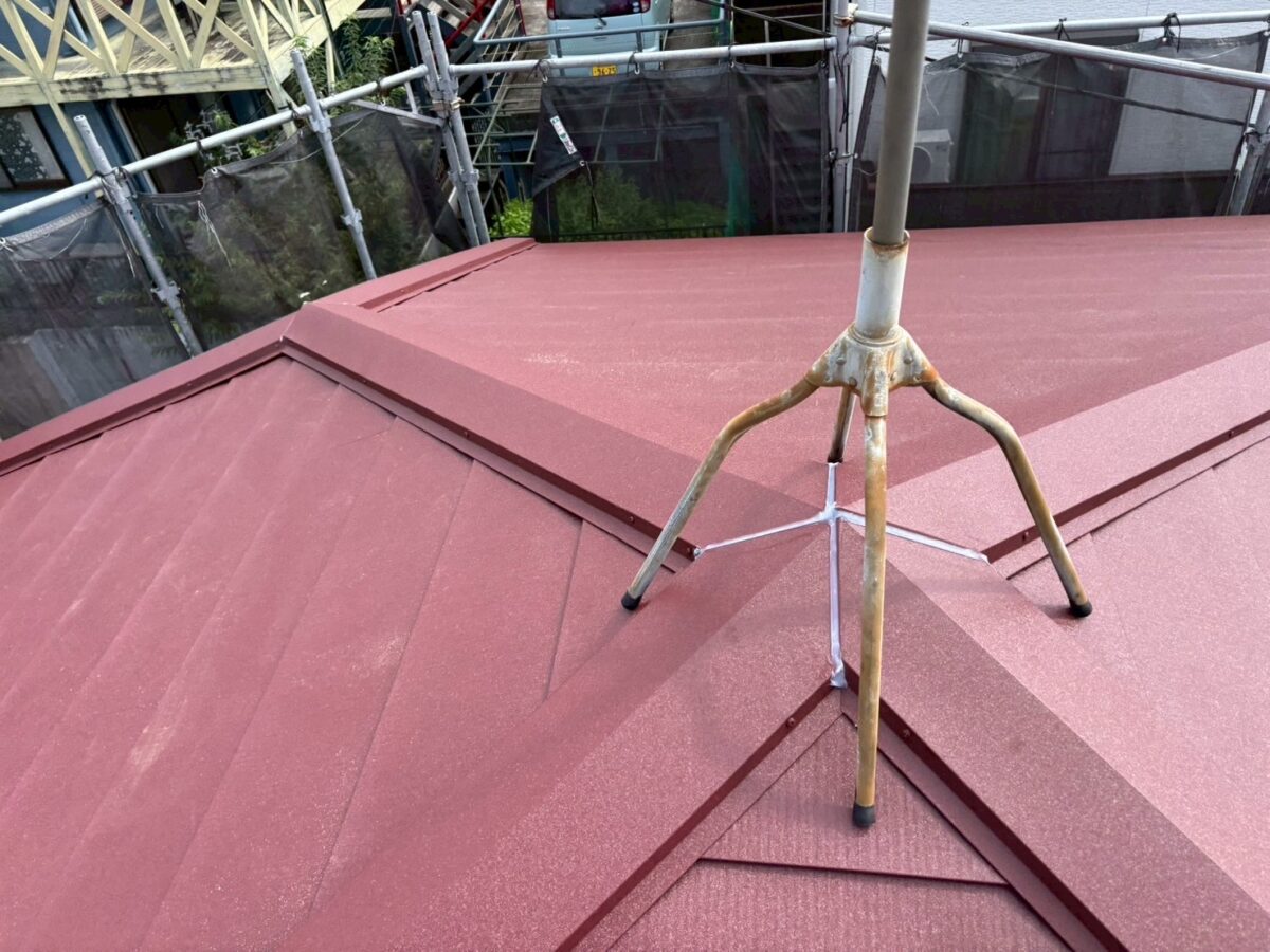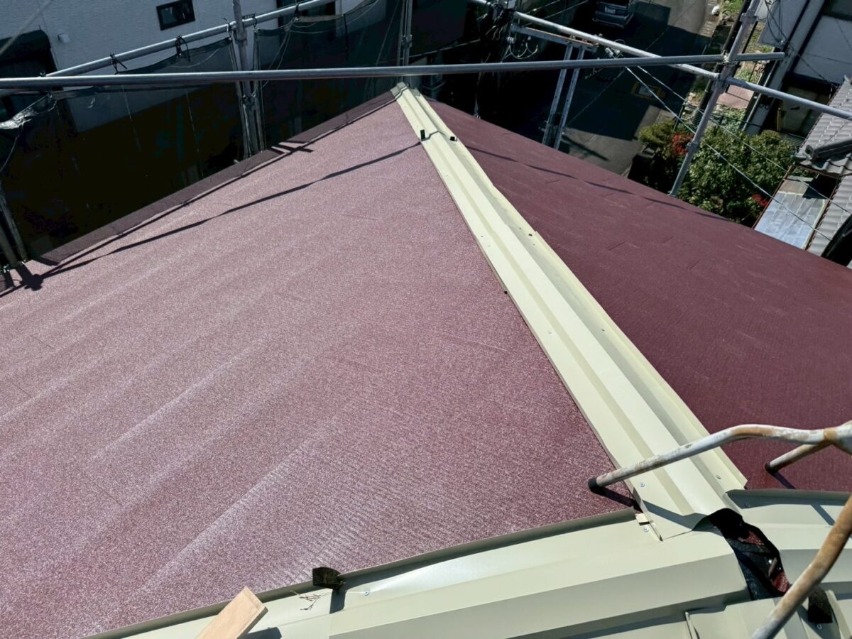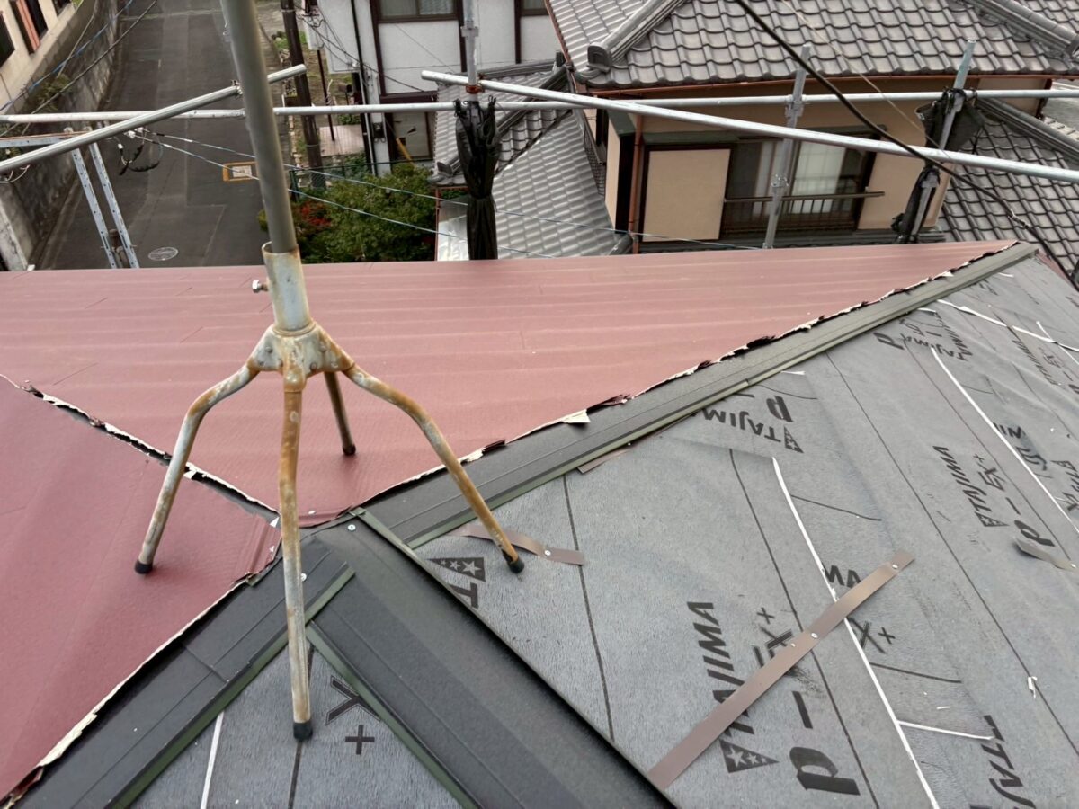 今までも何回かご紹介しましたが、我々は金属横葺き屋根では自社製のオリジナルの仕様で工事しています、画像の初めの方が既存の棟のを剥がして下地の貫板を撤去する所なんですがメーカー推奨の仕様も貫板か人工木材となっています、でも人工木材は熱に弱く腐らないけどモロくなります、木材は熱に強いけど湿気が籠ると腐ります、そこで考えたのが金属下地で木材を包み込んで水に接触させない仕組みです、この時の木の厚みも問題で通常貫板は15mm前後なのに対して25mmの木材を使用します木が厚い事によってビスを打っても割れにくいので強い強度が保てます、金属下地だけで棟板金とビスで絡めるでも良いのですが、その場合は太いビスを使わないと強度が出ないので屋根材の表面でビスを使わない金属横葺きではビス頭が目立ってしまうので木材を絡めて小さめの頭のビスを使用します、逆に石付き屋根等は元々表面がボコボコしていて屋根材同士もビスで打ってあるので太いビスを棟に打っても違和感が無いのでメーカーの標準仕様も金属下地のみで問題有りません。