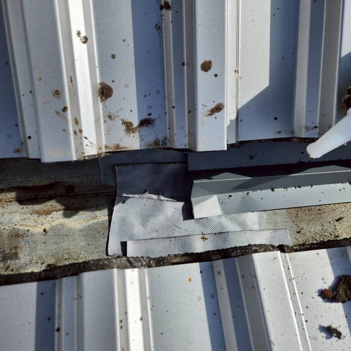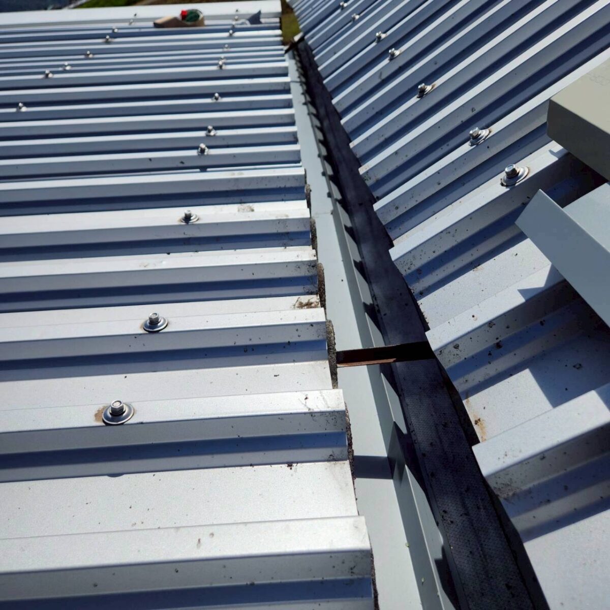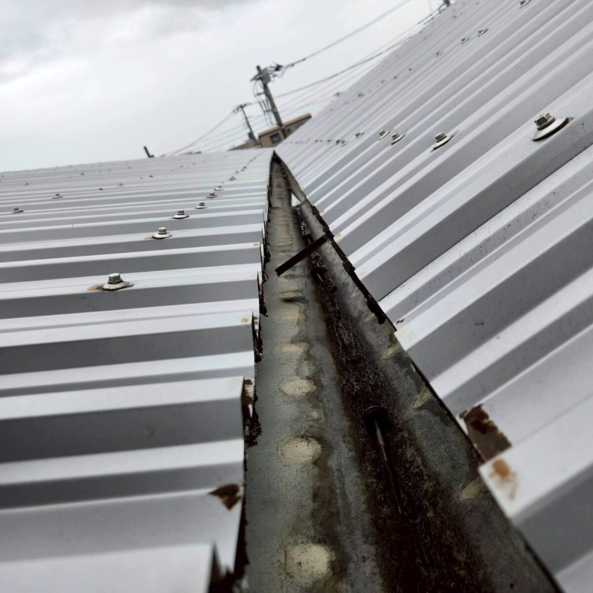 コチラは一年前に屋根カバー工事をさせていただきました工場なのですが、先日の大雨で谷から雨漏りしてきたとの事で伺いました、スレートのカバーの時は谷の取り替えが困難で雨漏りしていなければ現状維持な事が多く、この時も谷からの雨漏りは無いとの事で工事の項目に入れませんでした、そしてコチラの様に下地が無い谷はジョイントすると雨漏りの原因となるので一本物で現場で作り取り付けるのですが、16mの谷を3m毎に継いであったので重ねのコーキング頼りとなっていたので、コーキングの劣化が原因で漏れてしまいました、16mの谷を仕上がっている屋根の下に入れるのは不可能なので、谷の中央をV方に立ち上げ防水しながら半分づつ重ね合わせて嵌め込んで行きました,コレでもうどんな大雨が降っても大丈夫です。