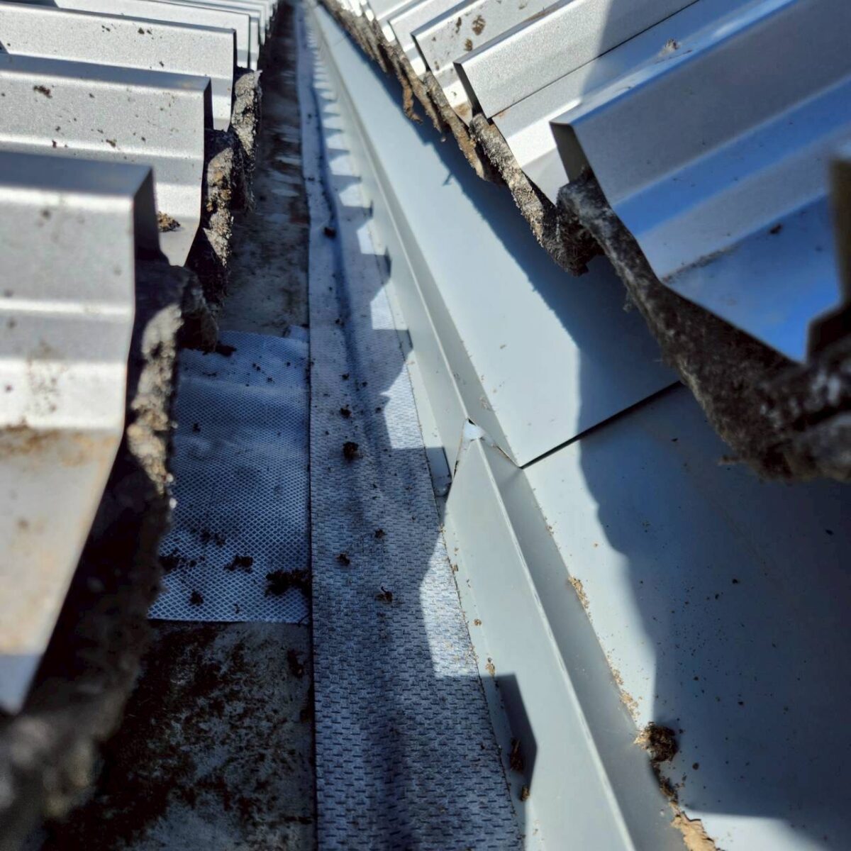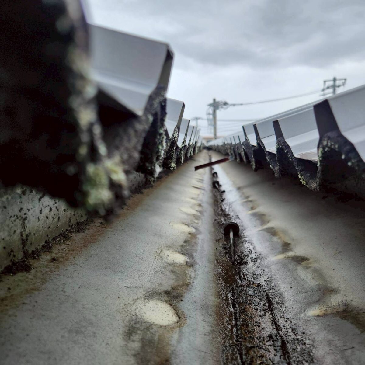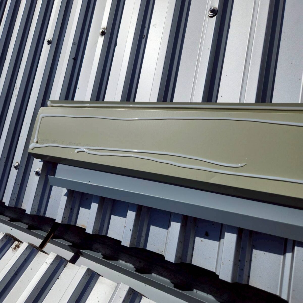 コチラは一年前に屋根カバー工事をさせていただきました工場なのですが、先日の大雨で谷から雨漏りしてきたとの事で伺いました、スレートのカバーの時は谷の取り替えが困難で雨漏りしていなければ現状維持な事が多く、この時も谷からの雨漏りは無いとの事で工事の項目に入れませんでした、そしてコチラの様に下地が無い谷はジョイントすると雨漏りの原因となるので一本物で現場で作り取り付けるのですが、16mの谷を3m毎に継いであったので重ねのコーキング頼りとなっていたので、コーキングの劣化が原因で漏れてしまいました、16mの谷を仕上がっている屋根の下に入れるのは不可能なので、谷の中央をV方に立ち上げ防水しながら半分づつ重ね合わせて嵌め込んで行きました,コレでもうどんな大雨が降っても大丈夫です。