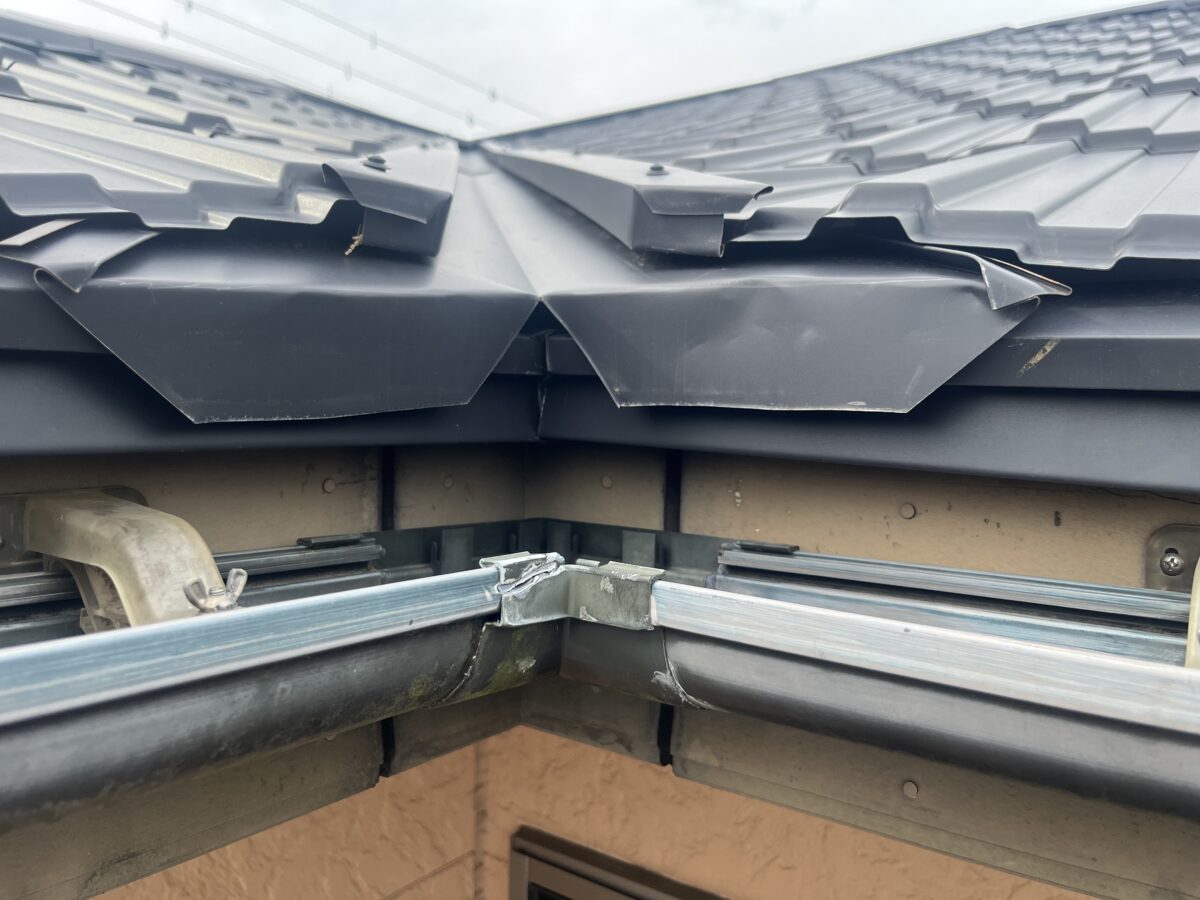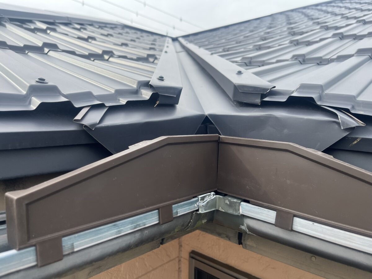 コチラは半年程前に屋根カバー工事が終了したお宅となりますが、1月位前に大雨があり谷の雨水が外に飛び出してしまうので、何とかなりませんか?とのご連絡がありました、屋根カバーは殆ど屋根の高さは変わりませんので、たまたま大雨で屋根カバーは関係無く雨水は飛び出したと思われます、また元々の雨樋が打った樋吊りよりも低い位置に雨樋の前が下がってしまうタイプでその影響が大きいです一般的な角樋は前高と言って水が飛び出し難い仕組みとなってますが、そう言ったタイプと違う雨樋でしたので余計に雨水が飛び出し易くなっていました、今回は水返しの入隅と言う部材を取り付けましたので強い雨が降っても水返しにぶつかり雨水は外に飛び出さなくなります、ですがこの商品は一つだけ懸念点がありまして、積雪地域では雪に押されて壊れてしまう事が多く積雪地域にはお勧め出来ません、今回は積雪地域では無いので大丈夫です。