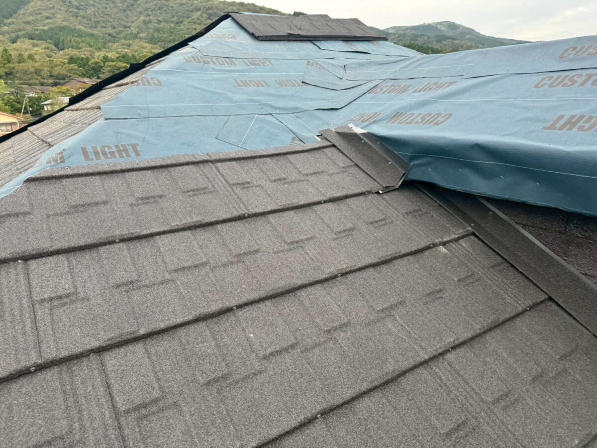 現在進行中の現場となります、屋根材はリクシルのTルーフモダンです、雨漏りがあった現場ですので合板を貼りルーフィングは粘着層付きルーフィングを使用しています、軒先が特殊なデザインで角度が変わっていますが石付きの役物を上手く使い収めています、少し大きめのドーマーが2箇所ありまして、コチラも大部分を屋根材で囲って行きます、元々がアスファルシングル葺きなので今回の屋根も同様に小さな石粒をまぶしてあるのは同じなので見た目は近いものがあるのですが、シングル葺きはアスファルトルーフィングに近い素材に石粒をまぶしているのに対して今回のTルーフの様な石付き屋根は金属屋根に石粒をまぶしているので根本の持ちが違いますので、絶対的にお勧めです。