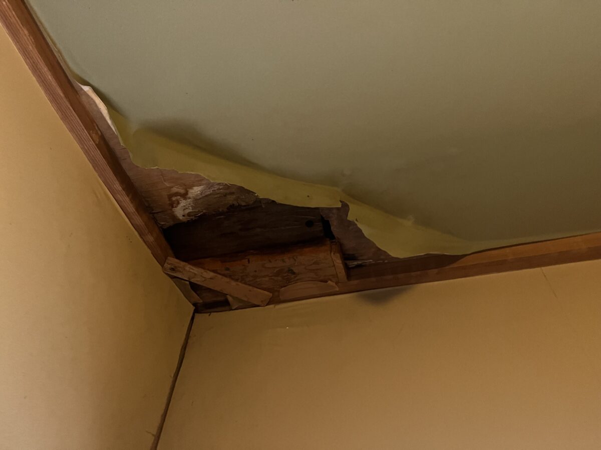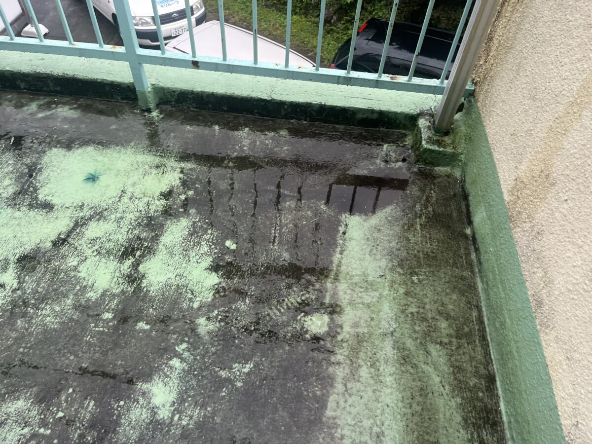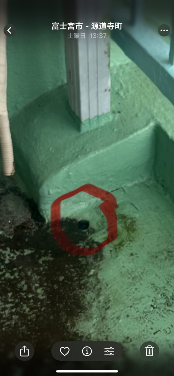 先日雨漏りの事でご相談を受けました御宅の画像です1枚目の画像が通常の陸屋根防水のドレンです、コチラのお宅もドレンの下辺りで雨漏りが発生していましたのでバルコニーを見させていただきましたらドレンが見当たりません!お施主様に確認すると前回の工事の時にドレンをモルタルで埋めて管を通したとの事でよく探すと赤丸の中の直径2センチ程の穴がありました、人様がやった仕事の事をどうこう言うのは好きでは有りませんが流石にコレには驚きました、こんな小さな穴では少しゴミが詰まれば機能は全て失われてしまいます、普通はドレンが悪かったとしても改修用ドレンと言う物がありますので、それで対応するので、現に雨漏りは直ってませんので謎の工事です仕上げに表面をトップコートで塗装したそうですが、それも雨漏りとは無関係です、これを直すには埋められたドレンを壊して掘り起こすしか無いので、初めからやらなかった方が良かったという感じです。