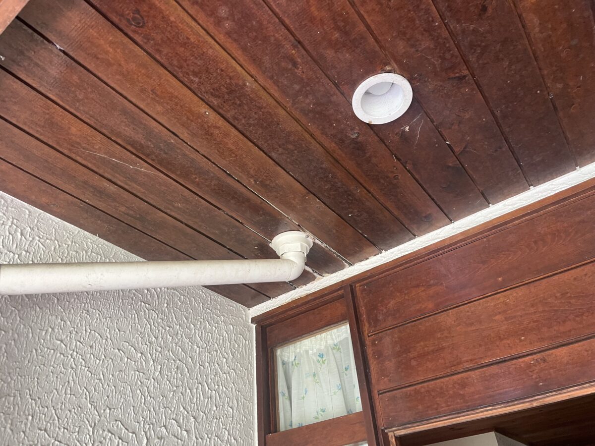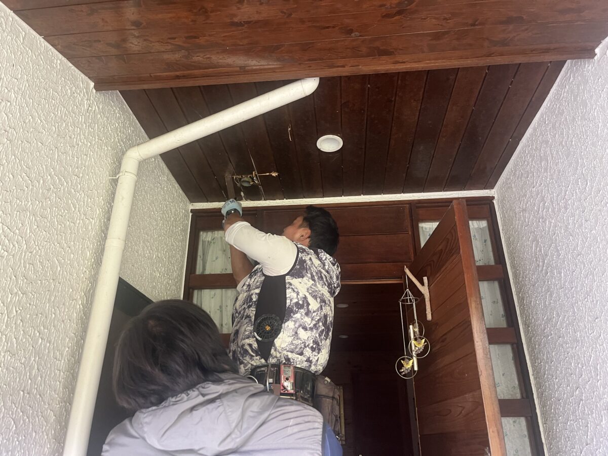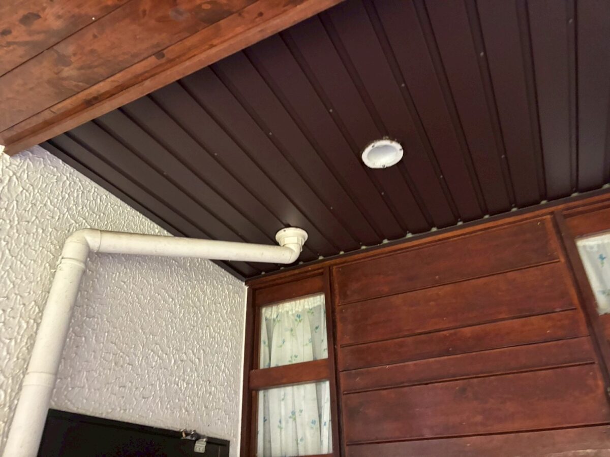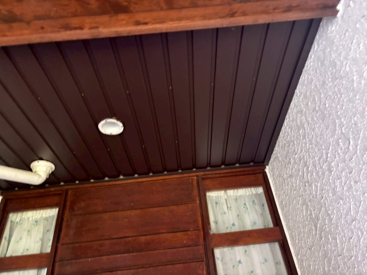 コチラのお宅は玄関の上がバルコニーになってまして、雨漏りが長らく続いていた為軒天の木材が腐食してきていました、水掛け調査を行うのに点検口を取り付けるのと板金を貼ってしまうのとでは差額も殆ど無かった為、今回は軒天に穴を開けて水掛けが終わった後に板金を貼る事となりました、板金は角波板金をビス留めしていますので、万が一雨漏りが再発したとしても簡単にインパクトさえあれば取り外し可能だし水に強い素材なので一石二鳥です、見た目も違和感が無く色も沢山の中から選べますので本来軒天は板金が最適だと私は思っています。