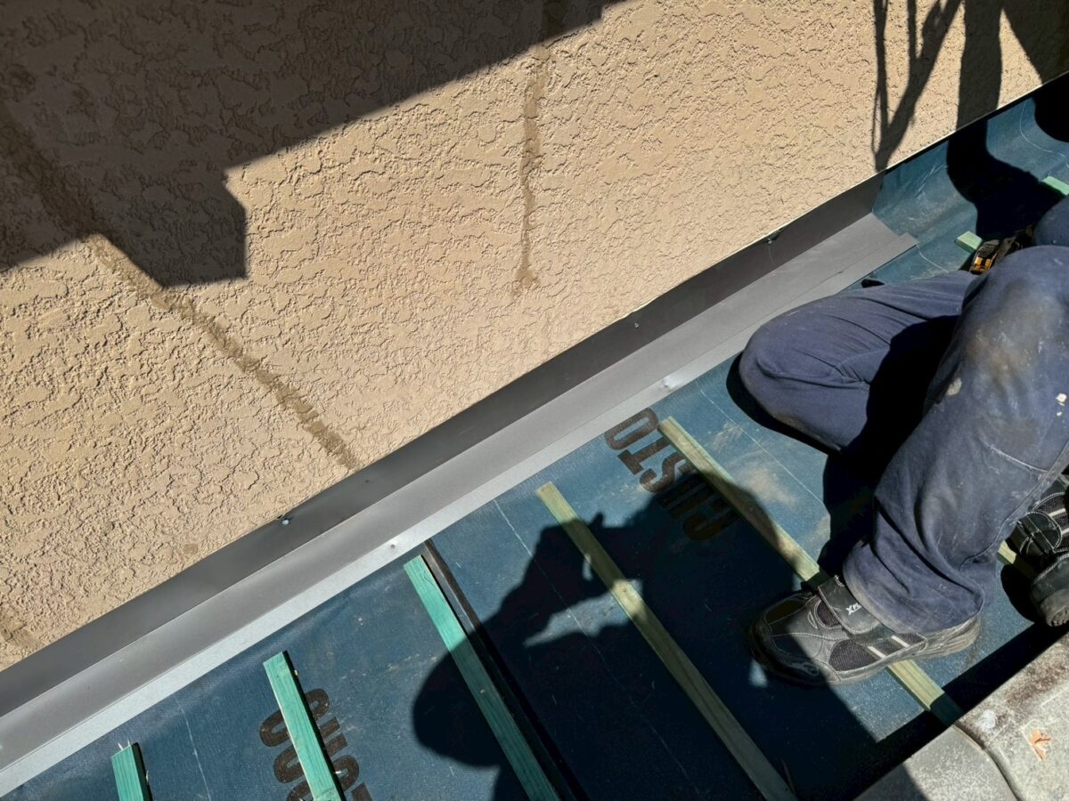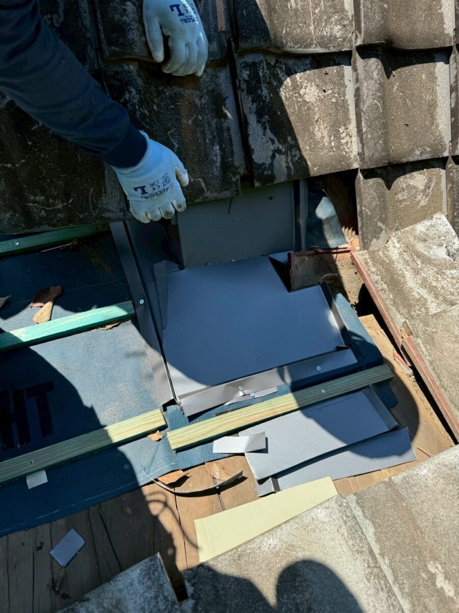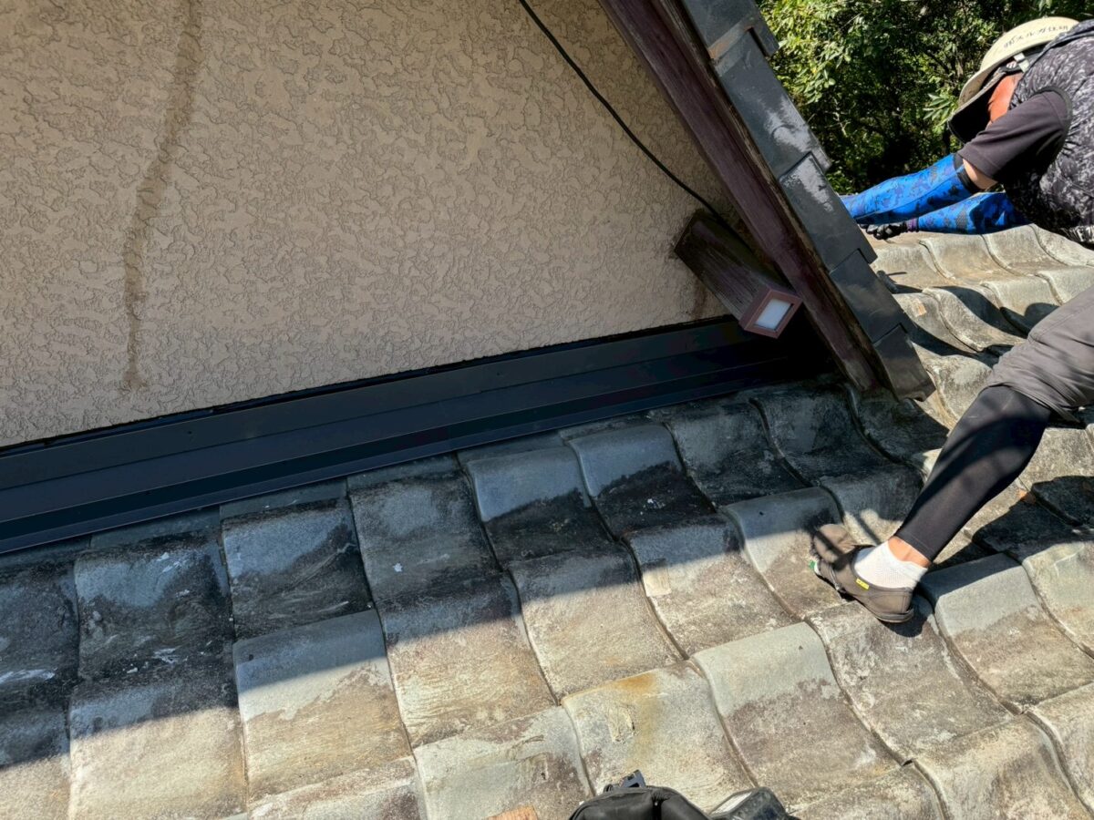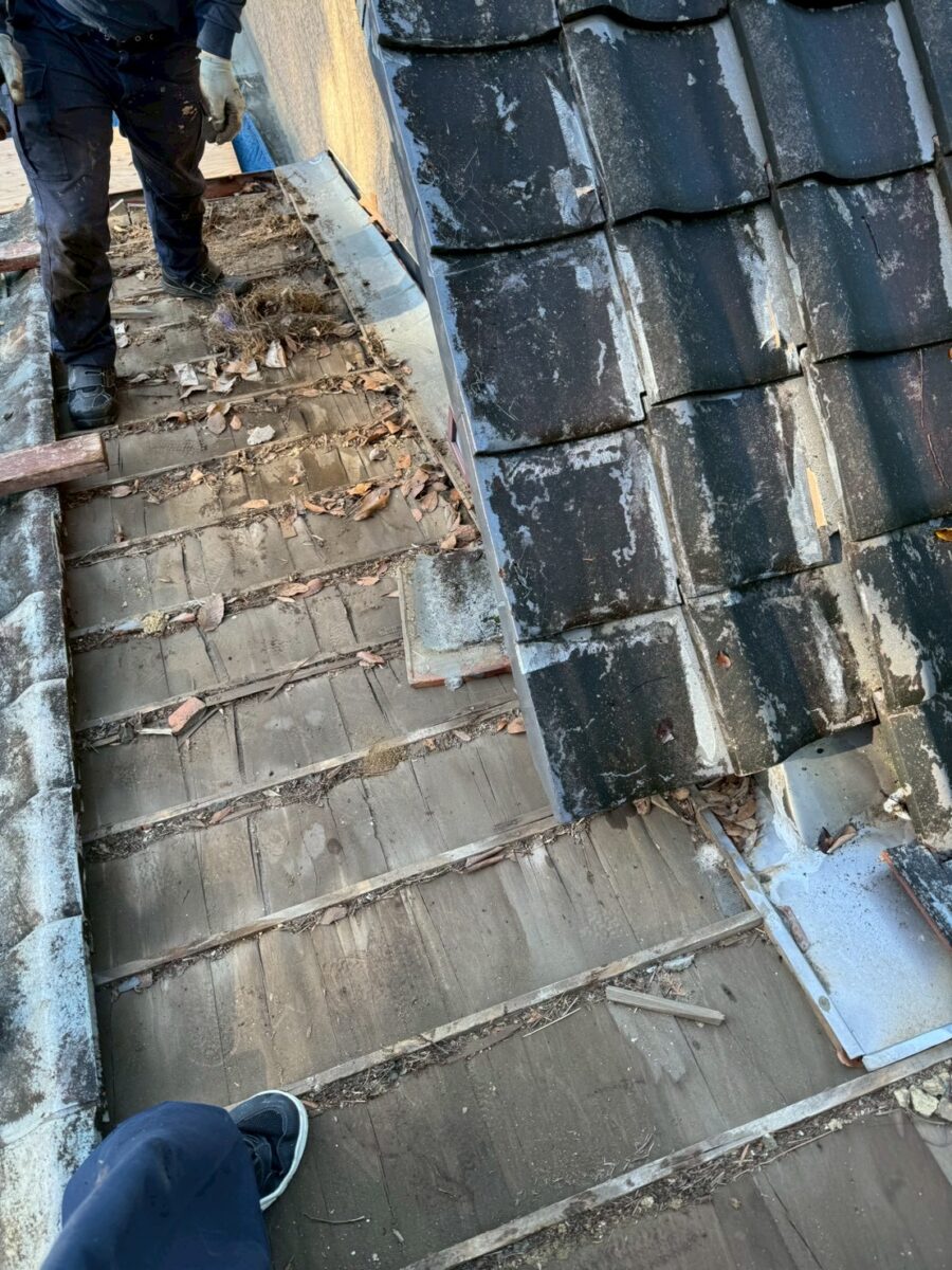 今回は瓦屋根の雨漏りの現場となります、増築した部分の壁際からの雨漏りなのですが、原因は屋根が互い違いになっている小さな谷部分にありまして、この水が壁際の捨て谷を通り軒先迄流れる仕組みとなっていますが壁際に雨押さえが付いて無かった為に枯葉が入り込み水が内部で溢れる現象が考えられた為、下地のルーフィングから粘着層付きルーフィングに替え瓦桟も水が流れる様に切り欠いた物を打ちオーバーフローに備えます、捨て谷と谷も新しく取り替え壁際には枯葉が入らない様に雨押さえを取り付けました、本来ならばこの雨漏りし易い仕組みごと変えたいのですが、それには大きな費用が掛かってしまうので今回は現状を維持したままでの最善の方法での施工を行いました。