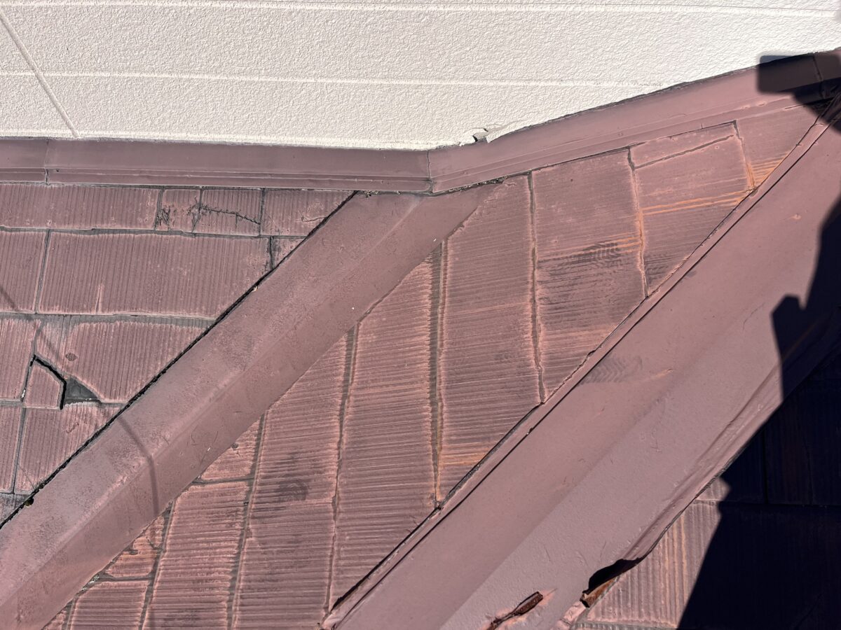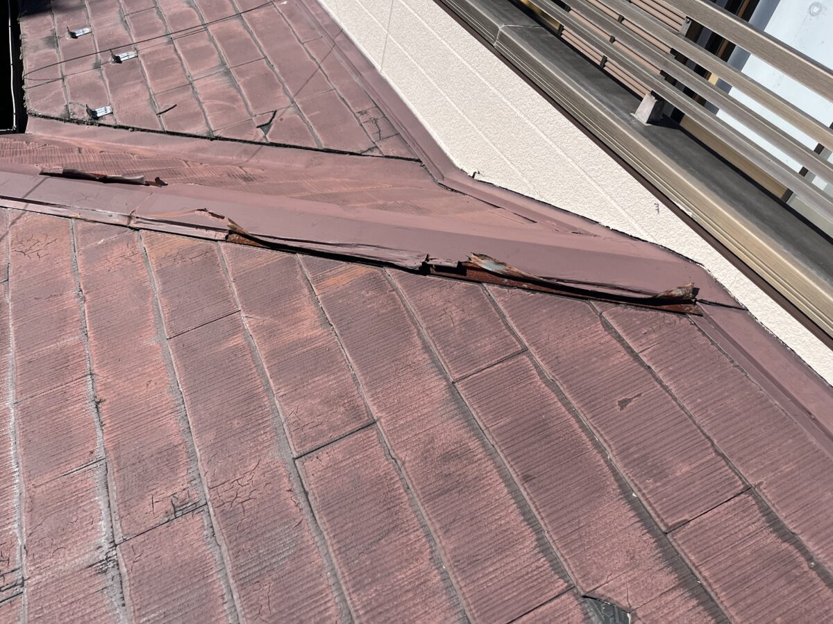 コチラの金属の棟の部分が皮が捲れた感じでビラビラしているので気になるとのご指摘で現場調査に伺いました、この鋼板は塩ビ鋼板と言ってスチール(鉄)に塩ビで表面をコーティングした鋼板で30年位前迄は結構出回っていました、今は板金を扱う建材店でも取扱いは無い商品です、コチラは通常は中のスチールが錆びててボロボロになってしまうのですが今回は逆で中は錆びてはいるものの腐っては無く塩ビだけが捲れています、コレは前回の塗装業者が塩ビ鋼板用の下塗り材を使用していなかった事が原因かと思われます、一般的には30年程前の物件の方は注意が必要ですが、大手ハウスメーカーでは私が現場調査を行った現場で20年位前のものでも屋根や部材に使われていましたので、大手ハウスメーカーのオリジナル商品は最近でも使用されていてもおかしくないので、塗装の際には業者さんにしっかりと確認を行って貰う事を呼び掛ける事は大事です。