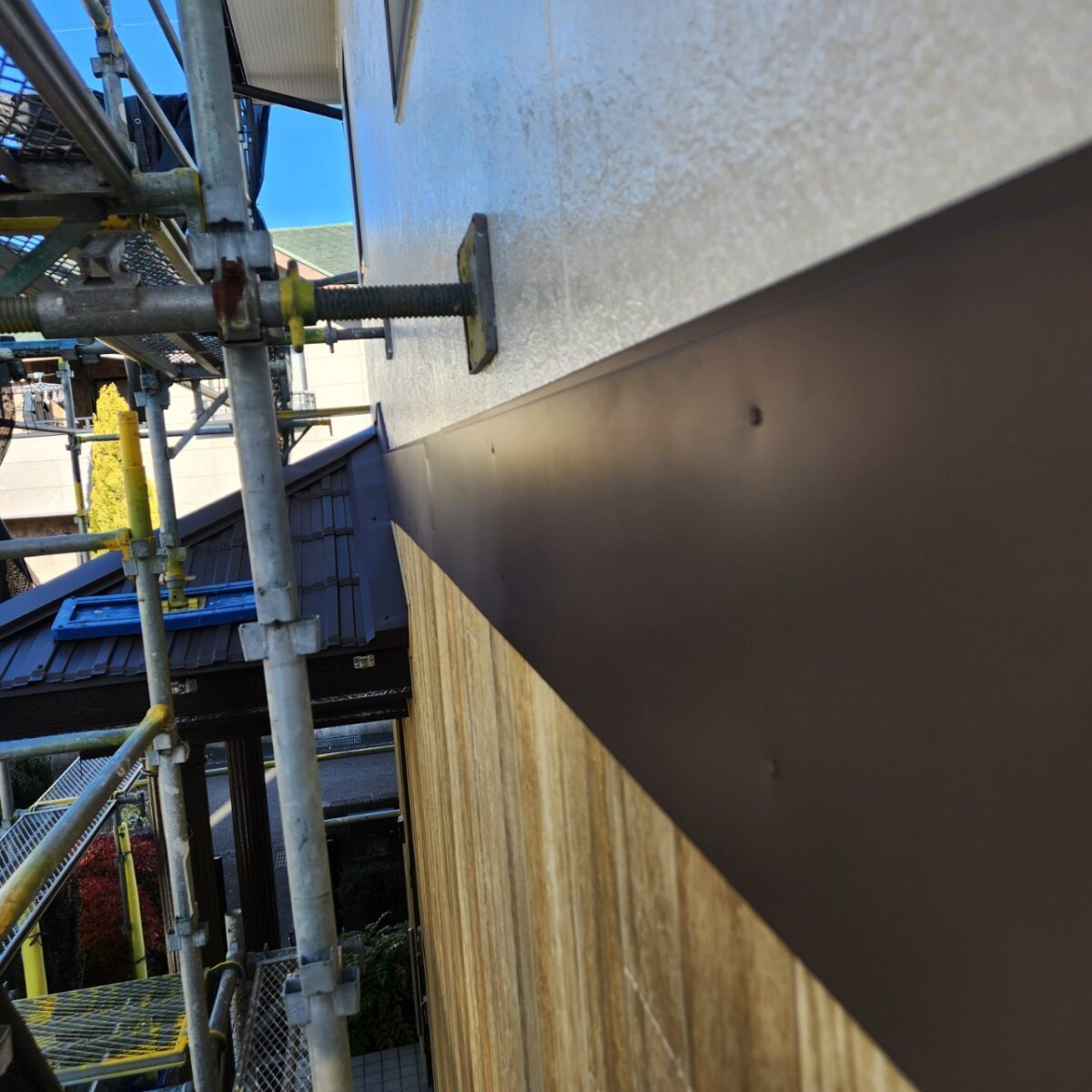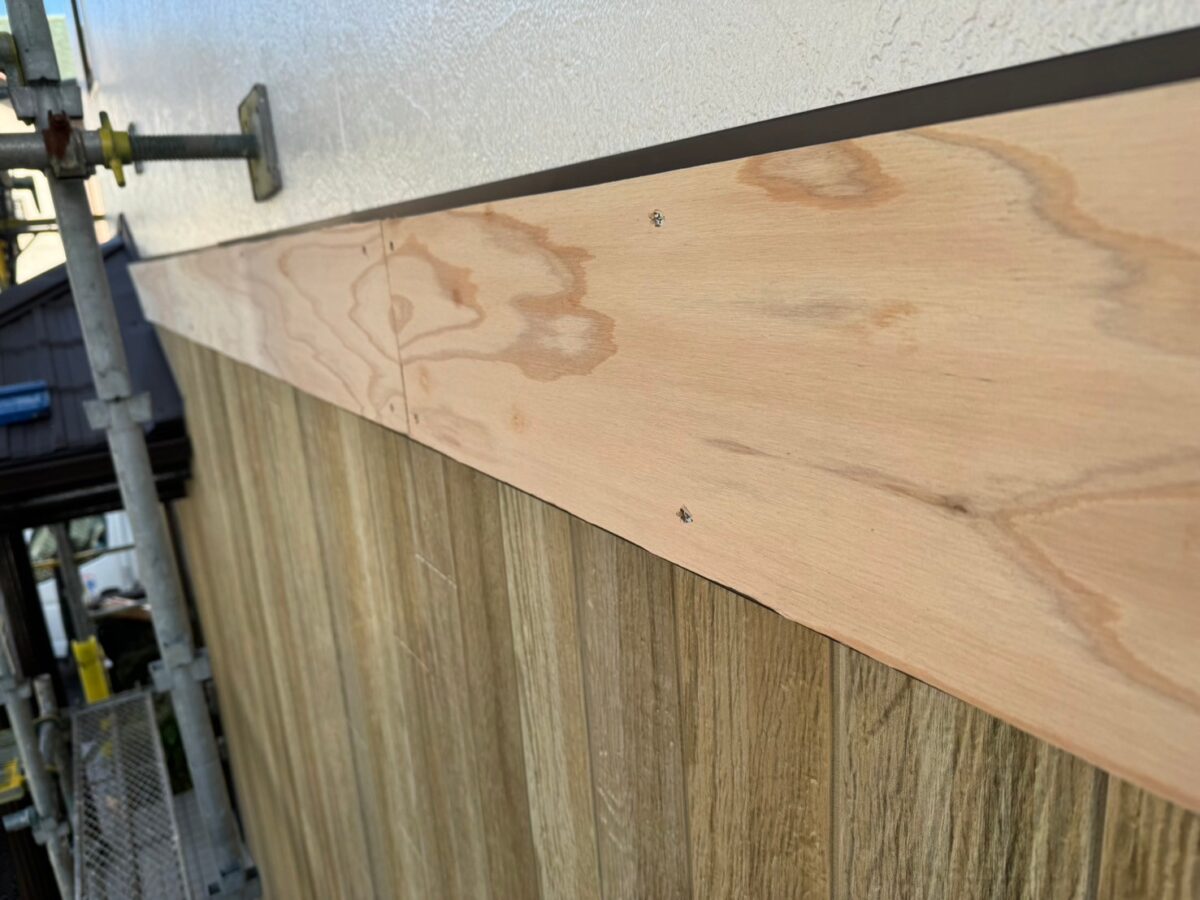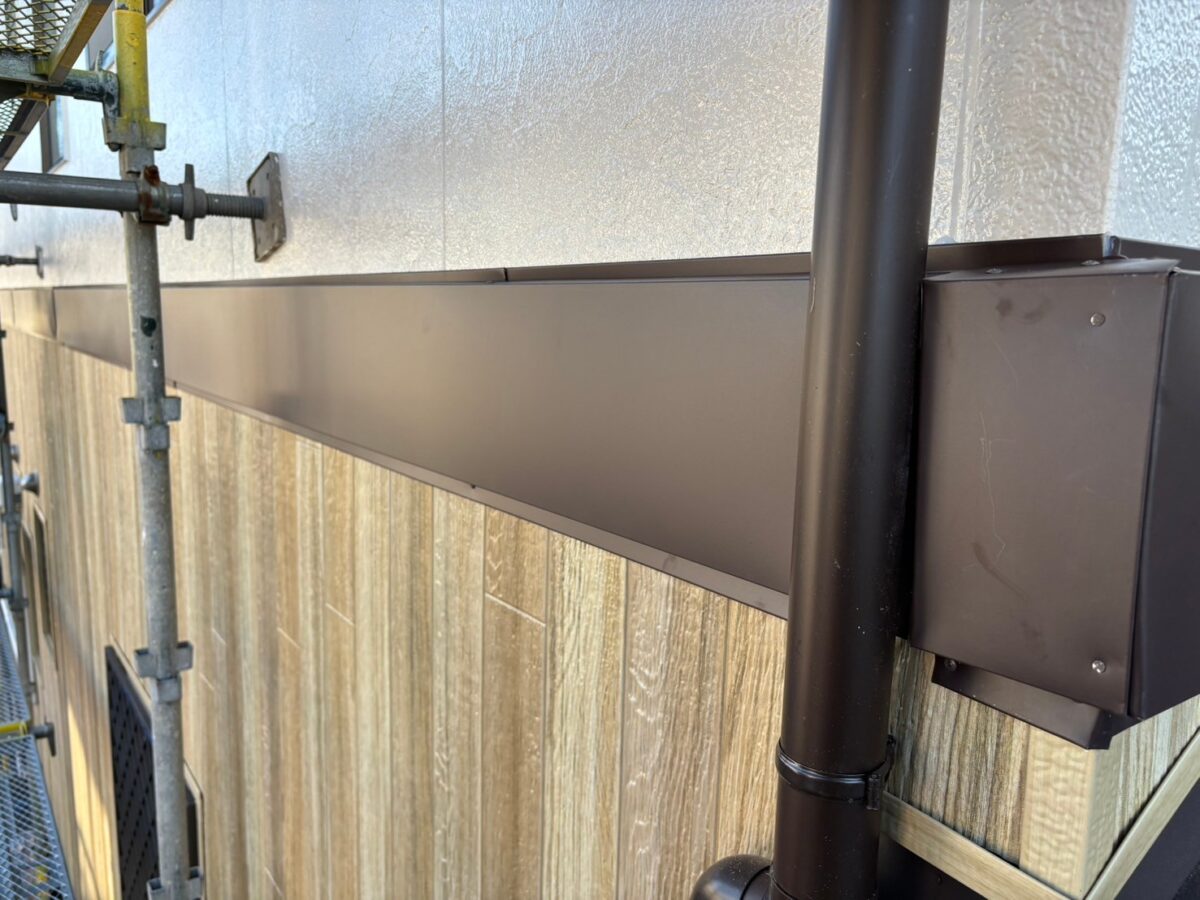 外壁工事の最終確認の日に幕板板金を確認したところ画像では分かりにくいのですが、外壁サイディングと幕板板金の出幅が同じで平面の様になっていました、これは私の職人に対する説明不足からのミスです、特に幕板の定義がある訳も無く上の板よりは出っ張っているので見た目的にも、そこまで違和感がある訳でも無く施主様から指摘があった訳でも有りませんが、ちょっと私的に納得がいかずに施工した幕板板金の上に木材で下地を入れ出幅を増やして、やり直しをして貰いました、最後の画像を見てもらっても、そんなに変化は無いと感じると思いますが私からしたら大満足で枕を高くして眠れます、勿論直した事もお客様は気付いて無いくらいのレベルですが、これ大事です。