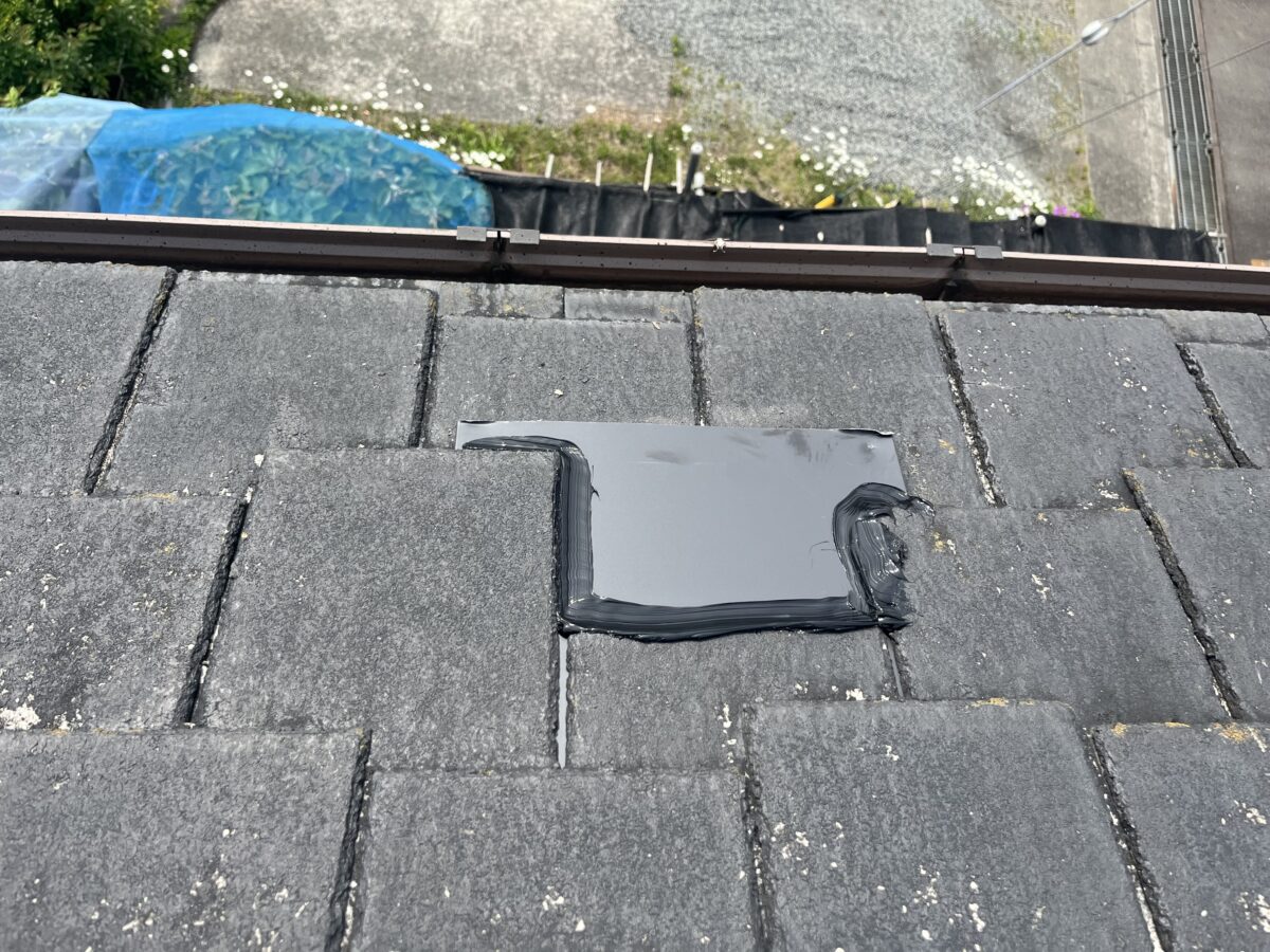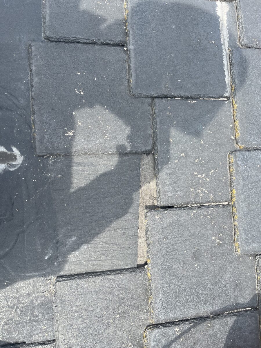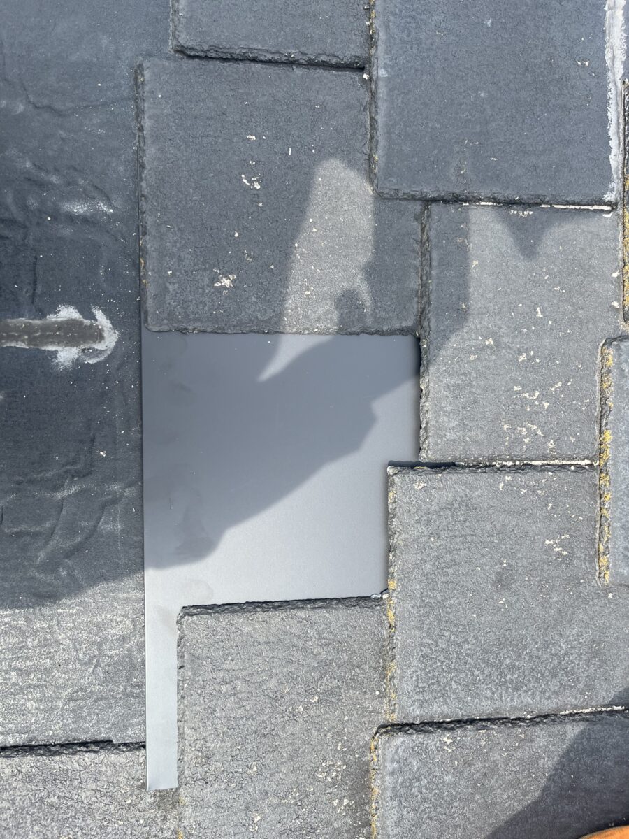 今回は化粧スレート屋根のアーバニーの補修工事です、このアーバニーと言う商品は鱗状のデザインが通常の化粧スレートと違い高級感があり化粧スレートの上位モデルとして一時人気の商品でした、デザイン的に縦スリットとの多い商品なので割れ難いように一般の化粧スレートよりも厚く作られています、アスベストが含まれているアーバニーは現在でも割れは少ないのですが、ノンアスになってからは割れが多く発売も中止となりました、今回のアーバニーも割れの多さからノンアスと見られます、お施主様からは今までに何回も補修してきたけど結局取れるので見た目は気にしないから水が入り難い様にして下さいと言う御依頼で板金を差し込む事となりました。見た目は良く無いのですがコレが1番安心で安全です。