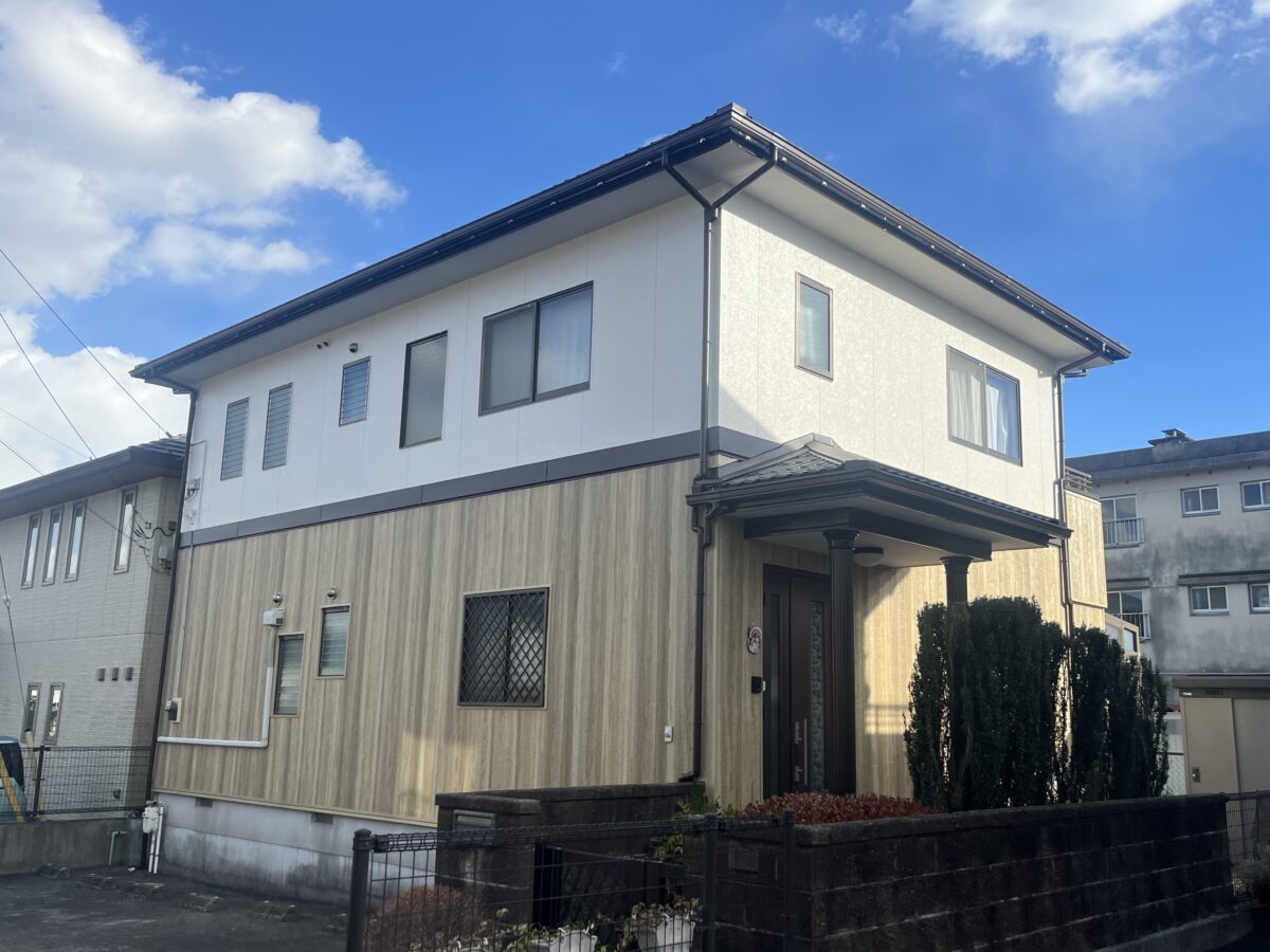 お客様への施工後のイメージを作る事のシュミレーション画像ですが、実際の仕上がりとはやはり差が出ます、コチラの現場は下が金属サイディングで上が塗装です、この場合金属サイディングのシュミレーションはメーカーしか作れないので一旦下だけメーカーで作って頂き、それを元に今度は塗装部分を業者に依頼します、特に塗装部分は塗る外壁の質感で見た目も変わってきますので正確になる時もあればシュミレーションとかけ離れる事もありますので最後は現物見本での想像力に頼っていただくしかありません、金属サイディングは塗装と違いサンプルが正確になりますので想像は楽だと思います、でもシュミレーションは少し濃いめなのが分かると思います、なのでシュミレーションは作るとしてもあくまでも参考程度と考えて下さい、色というのは少しの光の加減で大分変わってしまうのでシュミレーション画像と見比べる時間帯によっても変わります。