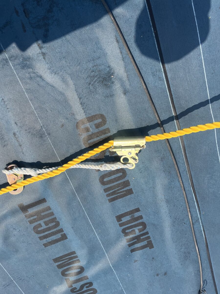今回の屋根は6寸勾配なのですが屋根足場を掛ける目安が大体6寸勾配からで今回も屋根足場を掛けるかのジャッジは難しく屋根足場を掛けたら掛けたで屋根工事の邪魔になり効率が悪くなるし今回は立体感のある金属屋根なのでキズや凹みが気になるので親綱と小綱で安全対策を取る事となりました、職人からは既存の屋根が滑り難いのでロープも要りませんと言われてしまいましたが最近は朝になると結露があるのでと私が半ば強引に取り付けてしまいました、白いロープが親綱で少し太くて、とても硬いです、黄色いロープが子綱で少し細くて柔らかいです、子綱には更に安全帯に引っ掛け易くする為のアタッチメントの様な物も取り付けます、職人は現場の効率を最優先に考えがちなのですが私は安全性を第一に考えるので少しだけ考え方にギャップがどうしてもできてしまいます。