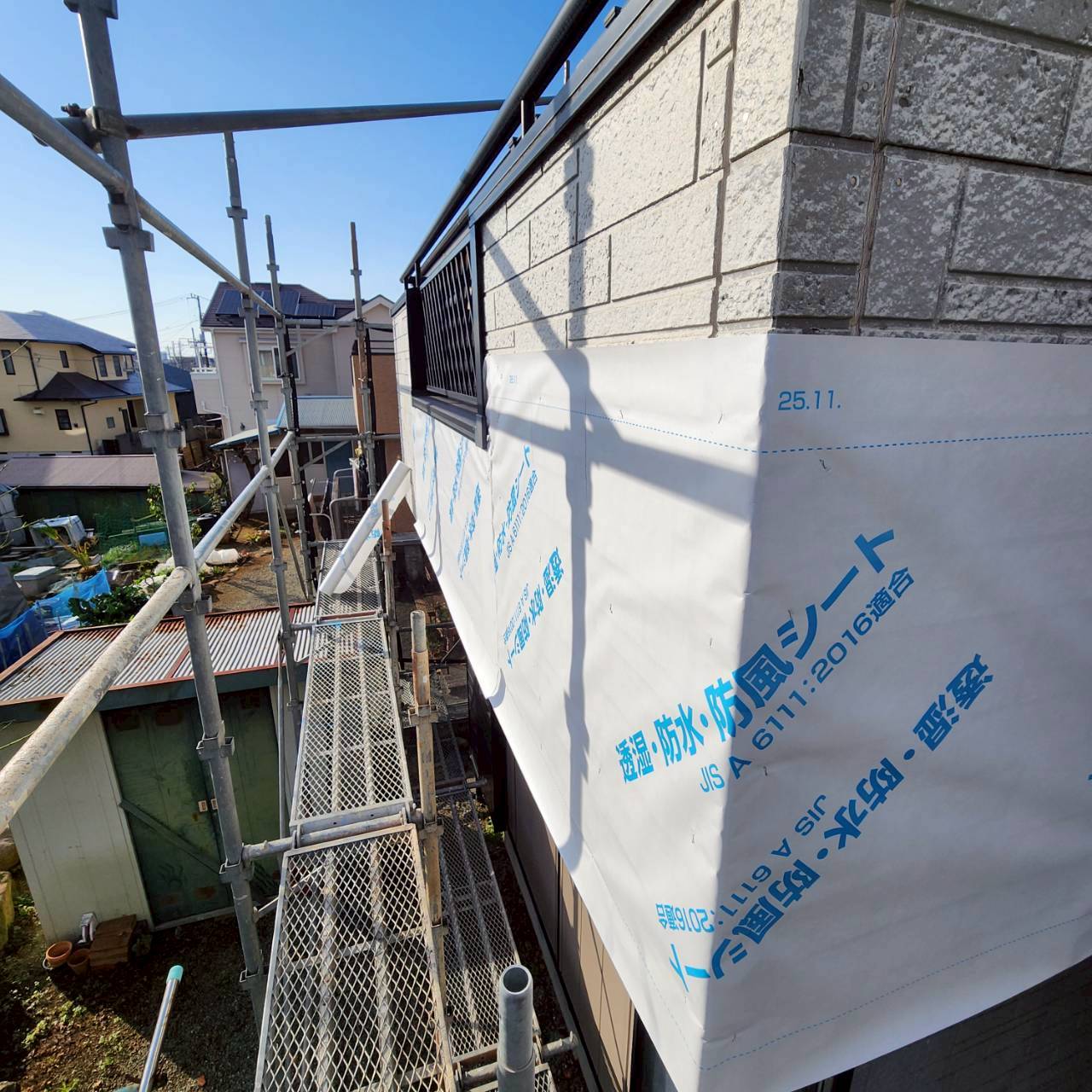 現在進行中の外壁金額サイディングカバー工事の下地工事です、白いのが透湿防水シートです、この金属サイディングカバーでの下地に透湿防水シートを貼る貼らない問題は賛否両論ありまして、貼る事のデメリットとしては予算が上がる事しか無いのですが全国的にシートが貼られる割合は5割程度だそうです、私共は必ずシートを貼る事を推奨し、窓廻りなどもブチルテープで防水しますのでシート無しは考えられません、胴縁は木材、コレも最近は木材では無く人工木材が流行っていますが私共は人工木材はビスの効きも良く無かったり耐久性に疑問があるので使用いたしません、下地が終わればリクシルのフッ素塗装の金属サイディングを施工していきます。
