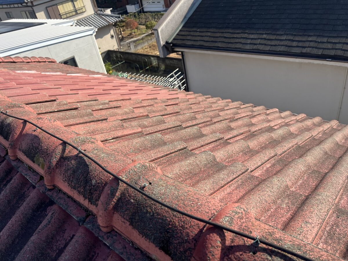 セメント瓦の現場調査に伺いました、前からお付き合いのある業者様との相見積もりという事で前業者さんが天井裏にあがり雨漏りがある事から葺き替えの見積もりとなったので私共も葺き替えの見積もりを作成致します、セメント瓦は雨漏りしていた場合は瓦が割れての雨漏りならば割れた瓦をコーキングすれば直りますが画像の様に一枚も割れて無いので下地のルーフィングの寿命となりますがルーフィングを替えるには瓦を全部外す必要があり、外した瓦をまた戻すにも割れた場合には発売終了商品なので替えが無く厄介なので、必然的に違う屋根材への葺き替えとなります、勿論屋根カバー工事も出来ません、塗装も割れる可能性もあり絶対に勧められませんが、そもそも雨漏りしてますので屋根替えしか無いです。