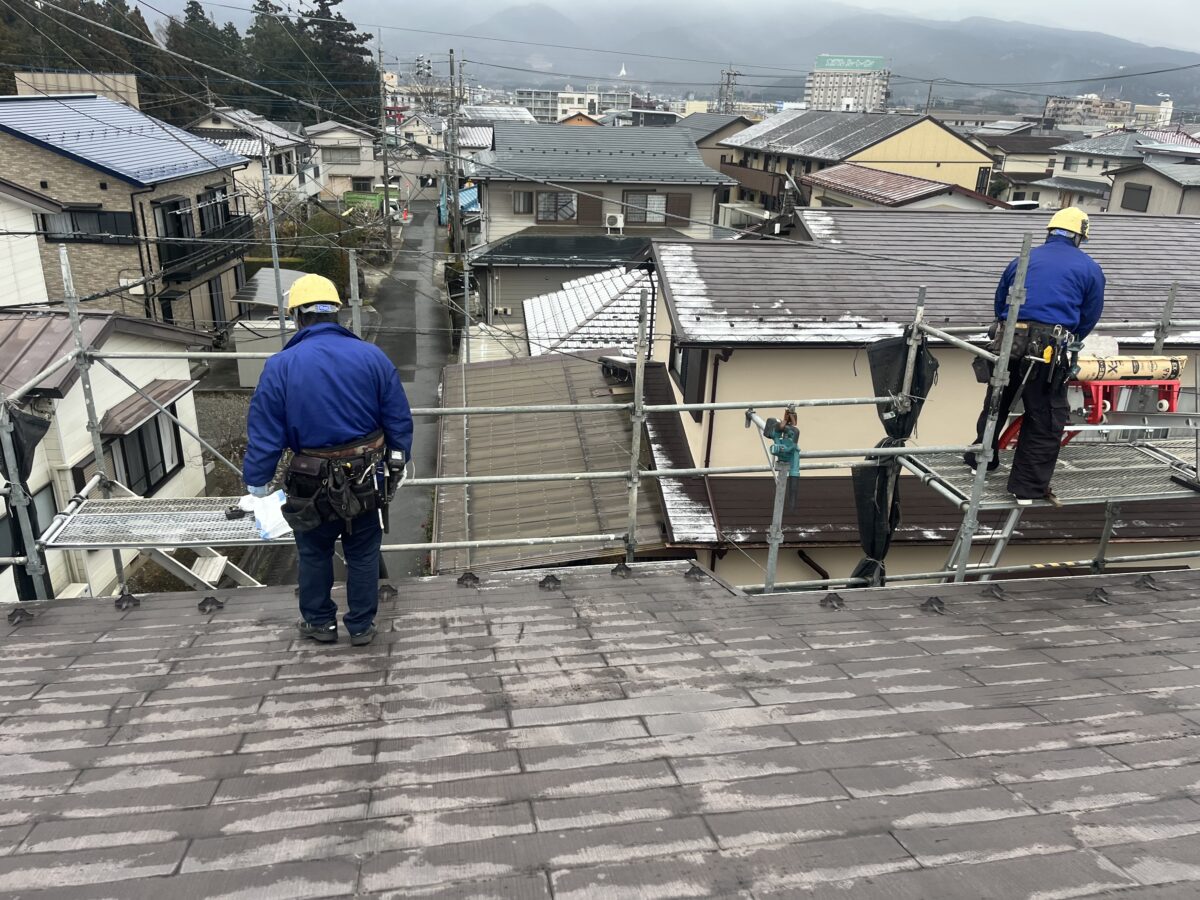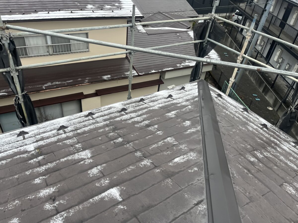 今年初の屋根カバー工事は御殿場市です、屋根の上には薄っすらと雪が積もってました、地元の富士宮市ではなかなかありえない光景です、ブロアーで雪を払い除けて現場での打ち合わせを済ませました、本日は既存の棟を撤去してルーフィングを貼り役物等を取り付けるのですが、その前に既存の雪止め金具を撤去します、サンダーで切断するのでキリコが近隣に飛び散らないように1人が切断、1人がシートで火花をカバーしながら撤去していきます、今年は第二週からのスタートですが同じ週で3現場、御殿場市での足場掛けがあり、御殿場市からのスタートという事となり寒さとの戦いになりそうです。