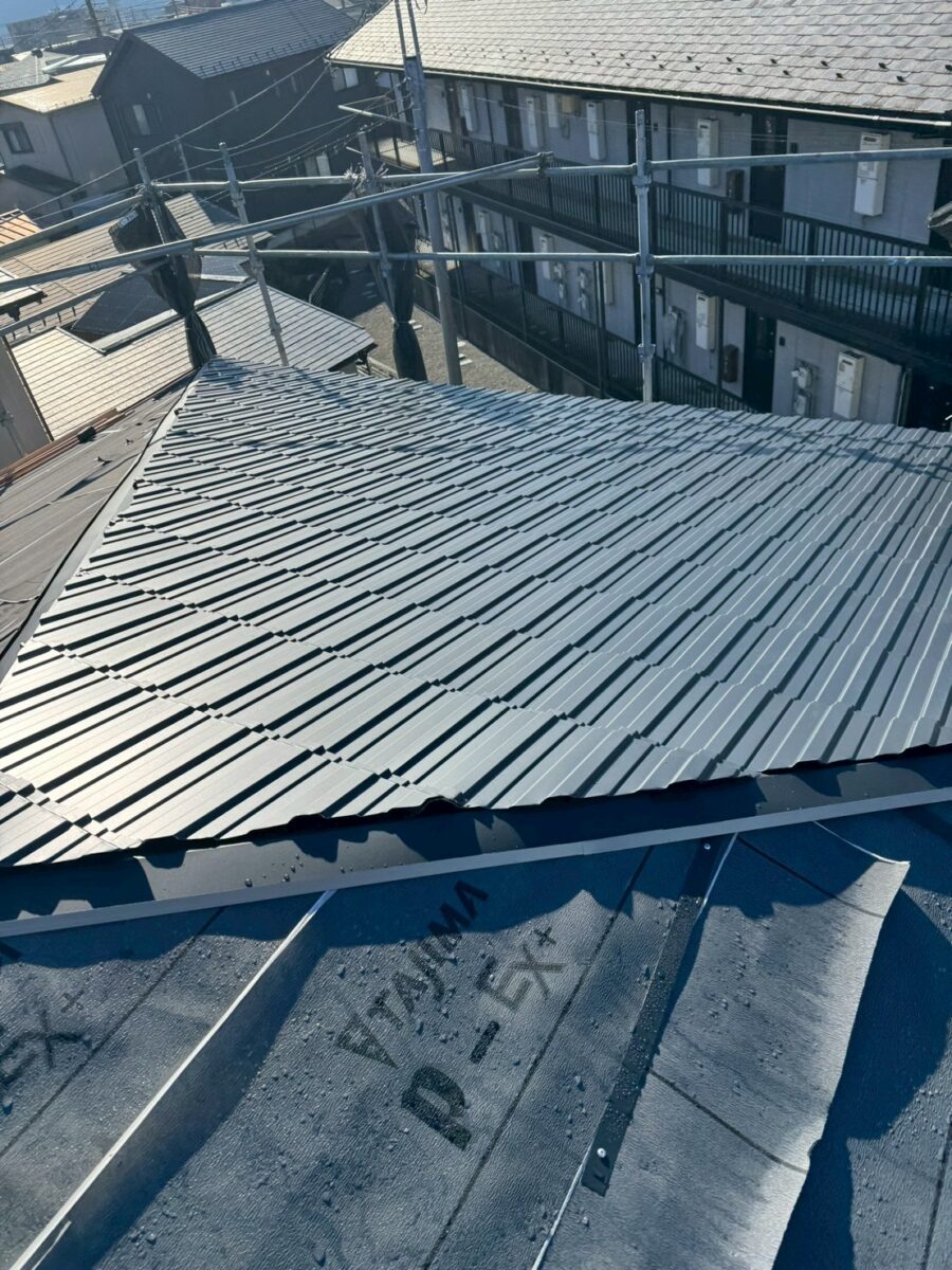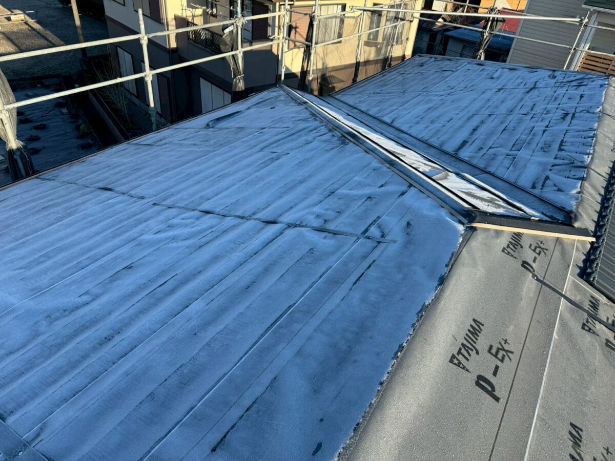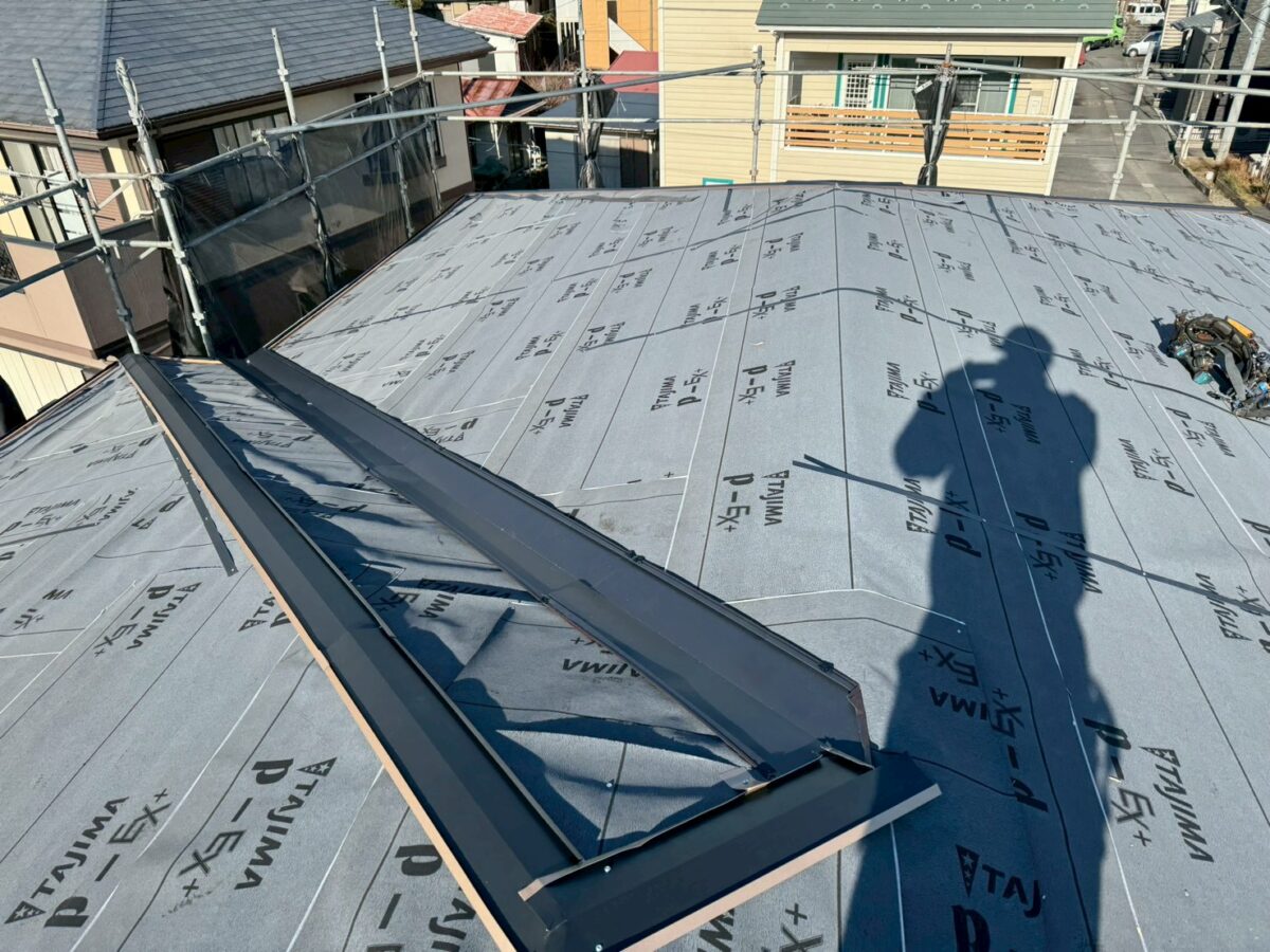昨日の現場の続きとなります、レクトプルーフの本体屋根工事です、一枚目が前日の様子で2枚目が次の日の朝ですが北面は霜が張ってます、いつもの屋根材では本体屋根を全て張り上げてから降り棟を取り付けるのですが何故か本体の途中で施工できる箇所は降り棟を施工しています、これは私も初めてみたので何故だか分かりませんが私の予想だとレクトプルーフはフッ素塗装なので滑りやすいからかな?と言う事か、本体を前日全て張り上げてしまうと翌日凍るので棟の取り付けが出来なくなる事を察したのか定かでは無いのですが、順番はさほど重要では無いので現場の職人のやり易い方法が一番です。