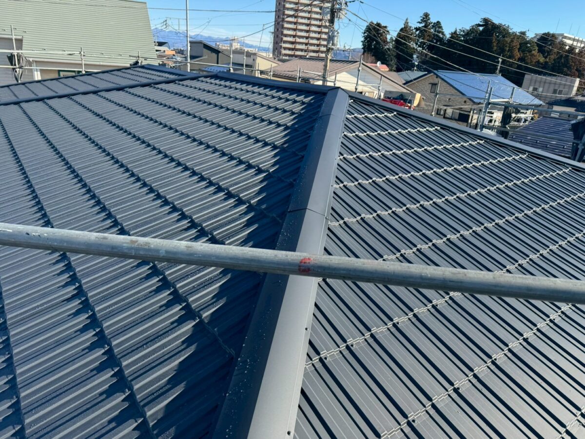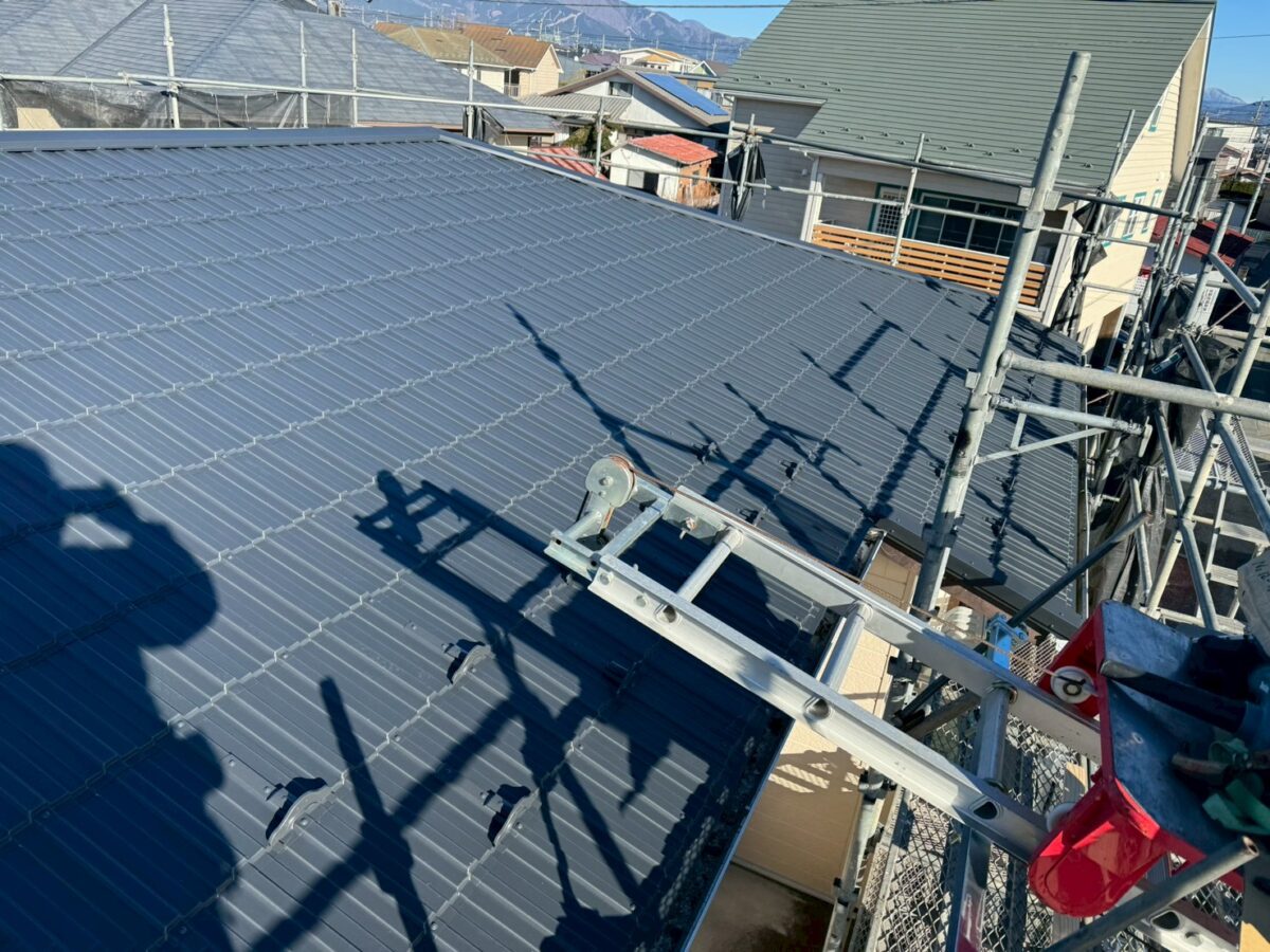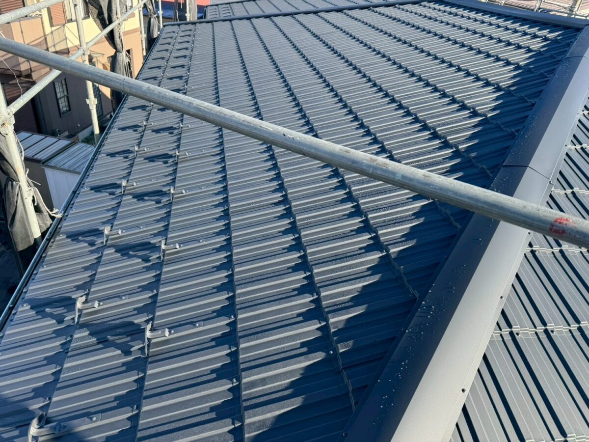 施工中の金属屋根材レクトプルーフが仕上がりました、現場的にはこの後も雨樋の取り替えや外壁の雨漏り箇所の補修工事がありますが、メインの屋根カバー工事は完成です、また後日施工事例でご紹介しますが最後の画像が施工前となります、見た目的に立体感が増したのが分かるかと思いますが、これ大袈裟で無く画像よりも実物を見ると全然違って見えます、特に足場の上からでは無く家の下から見た場合に既存の化粧スレートは、より平らに見えてしまうので立体感のあるレクトプルーフは凹凸の光の当たり方で陰影がハッキリとして、より立体感がある様にみえますので施工したお客様は皆様驚かれます、私共もお客様の喜ぶ顔が大きいのでお勧め商品として一推ししています。