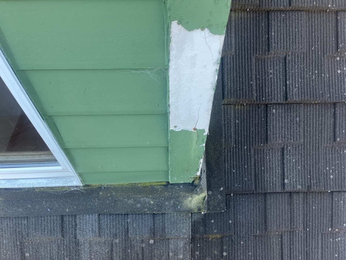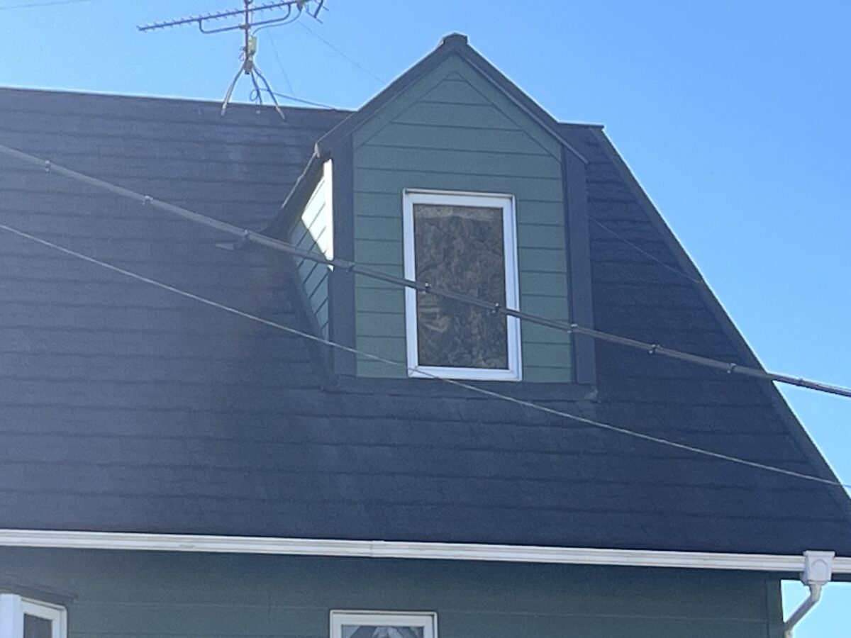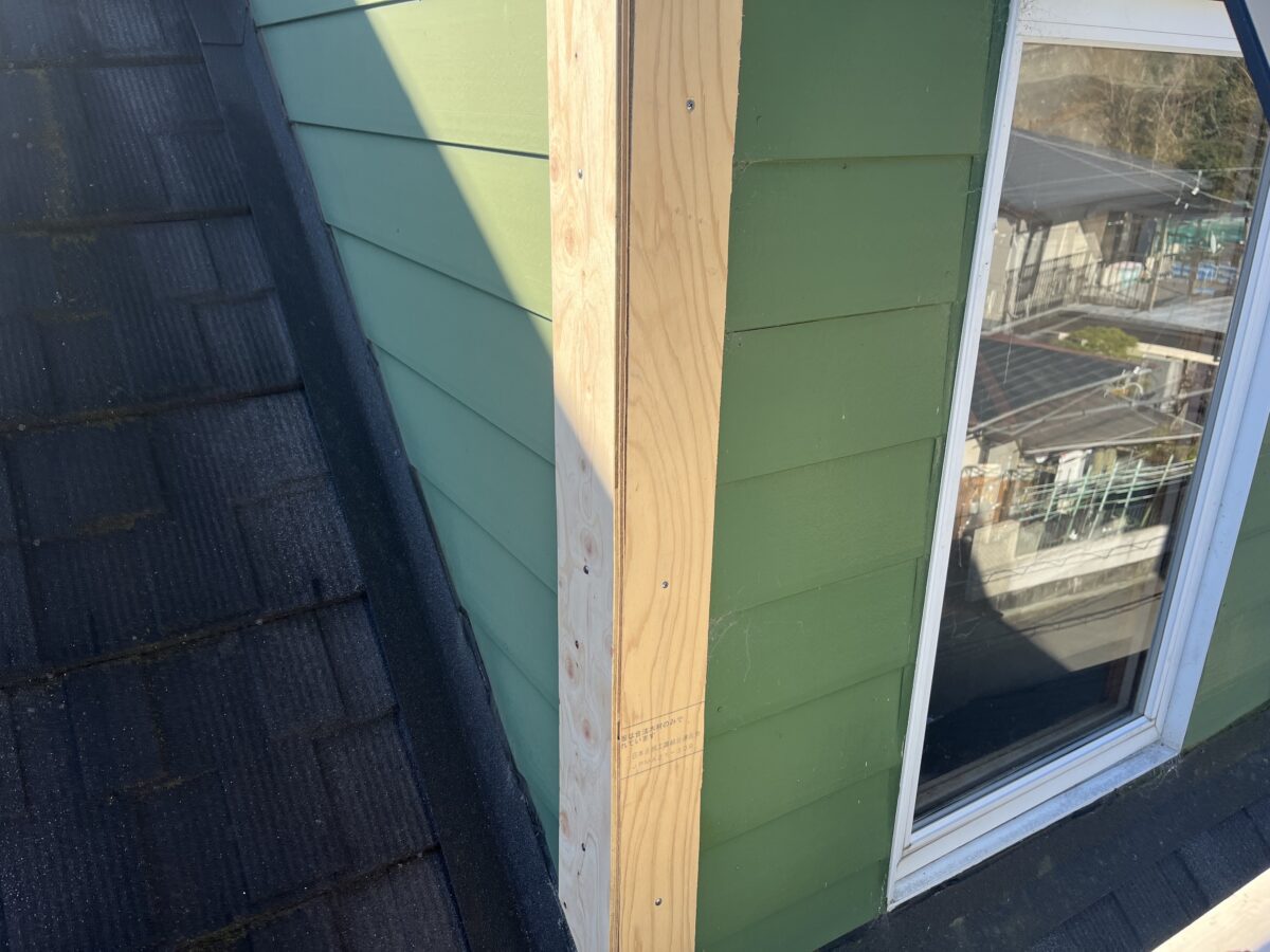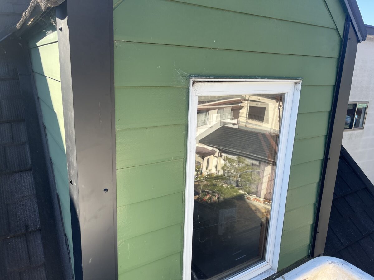 今回は屋根勾配のきつい屋根のドーマーの外壁の補修工事です、45度のカネ勾配と言う角度で、頂点の棟の所が直角になっております、屋根上で水がかかり易い事に加えてドーマー自体が軒ゼロなのでやはり痛み安いです特に劣化が進んでいた場所は外壁材では無くケイカル板を加工した物が取り付けられていました、補修といっても取り替えるのは手間がかかるので水に強い板金でコーナーを作り上から被せます、でも直接板金を打つと薄いのでボコボコになるので下地に12mmのラーチ合板を打ち、その上に前日作業場で加工しておいた板金役物を寸法を取り加工して取り付けます、この作業量で足場を組むのは申し訳ないので高所作業車で作業し無事に完了致しました。