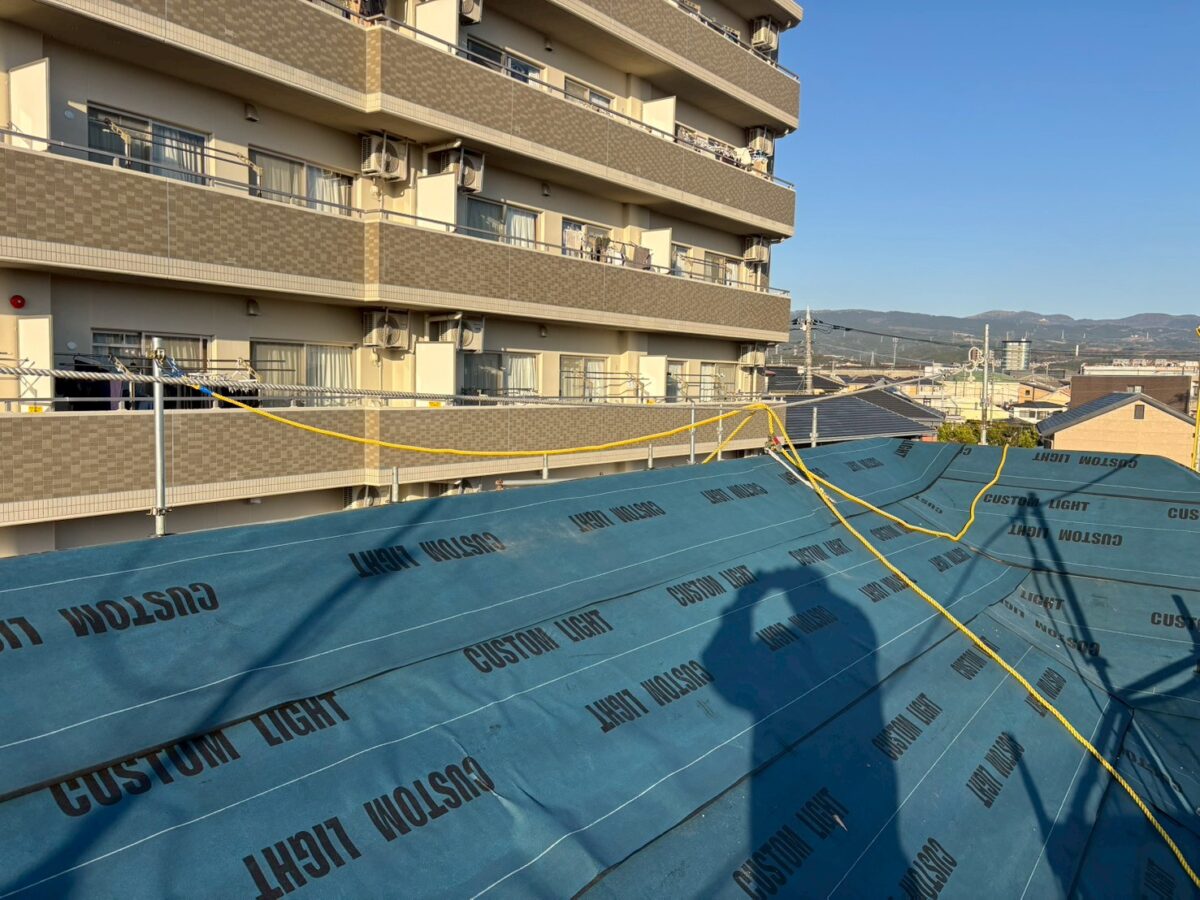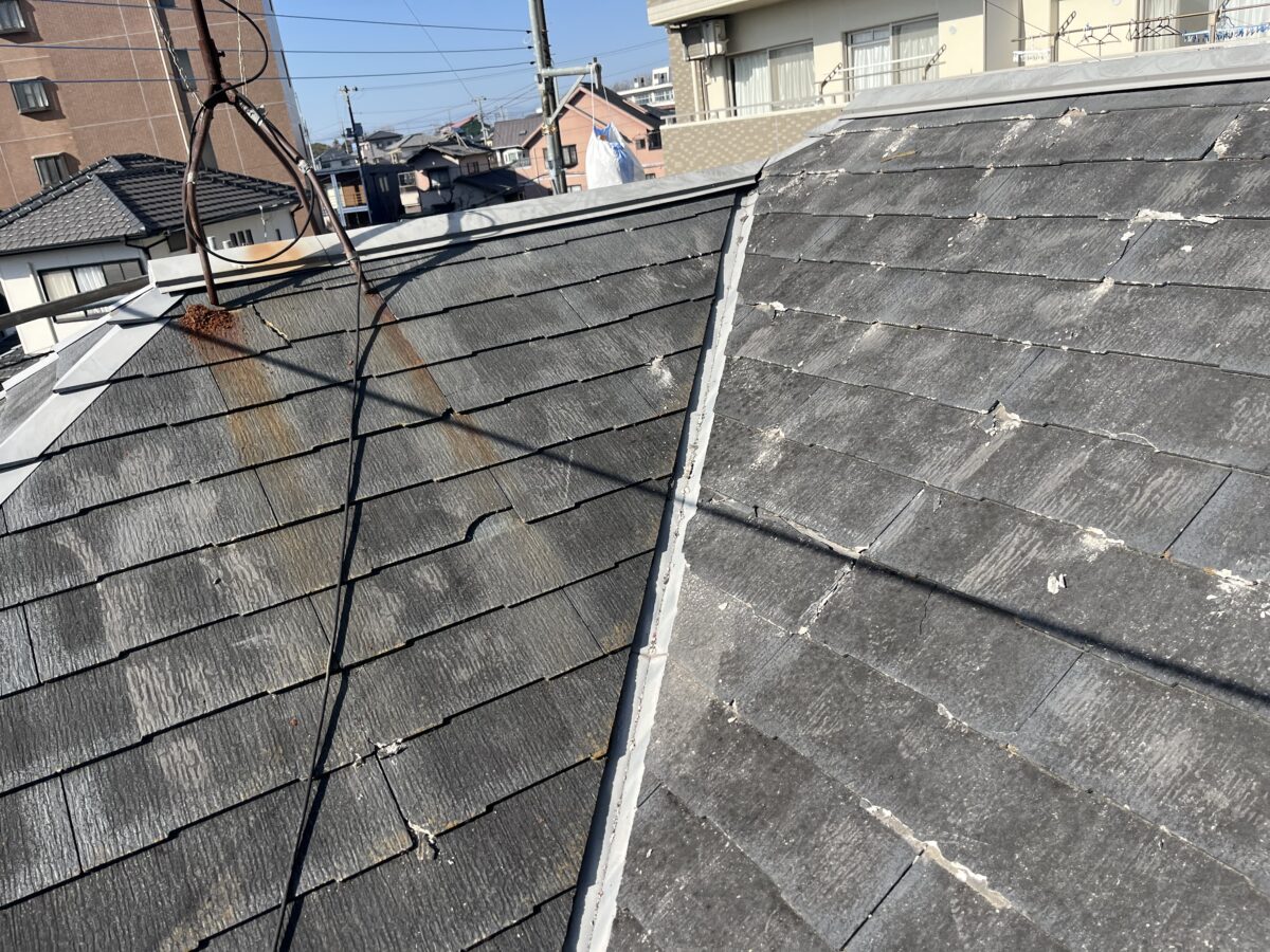 マックスハイプルーフを施工する現場の初日です!コチラは勾配が6寸勾配と屋根足場を設置するかどうかの微妙なところで、屋根足場を設置すれば滑る事を気にせずに出来るのですが作業がやり難いし足場解体の時にキズや足場屋さんが滑るしと、なかなか難しいジャッジでしたが親綱と子綱を張り巡らせて慎重に作業する事にしました、化粧スレートも年数が経つと表面に粉が吹いてきて、それにより凄く滑ります私も現場調査の時には非常に怖かったです、でも一旦ルーフィングを貼ると滑らなくなります、問題はマックスハイプルーフを施工した次の日です初日は何故か滑らないのですが、2日目は滑りますフッ素塗装特有の習性ですが、施工前の粉の状態よりは良いかな?位の滑り具合です、天窓も2箇所撤去し後日施工して行きます。