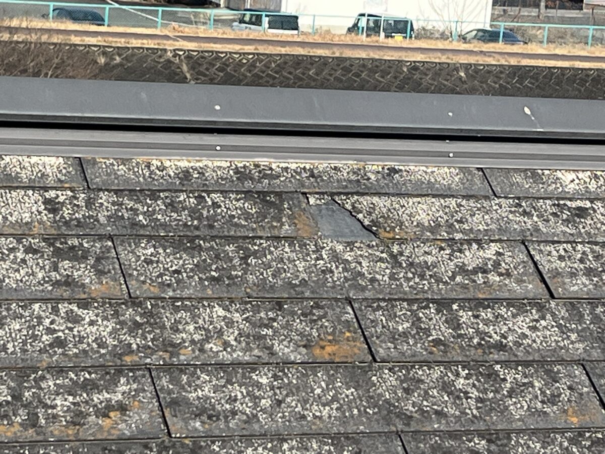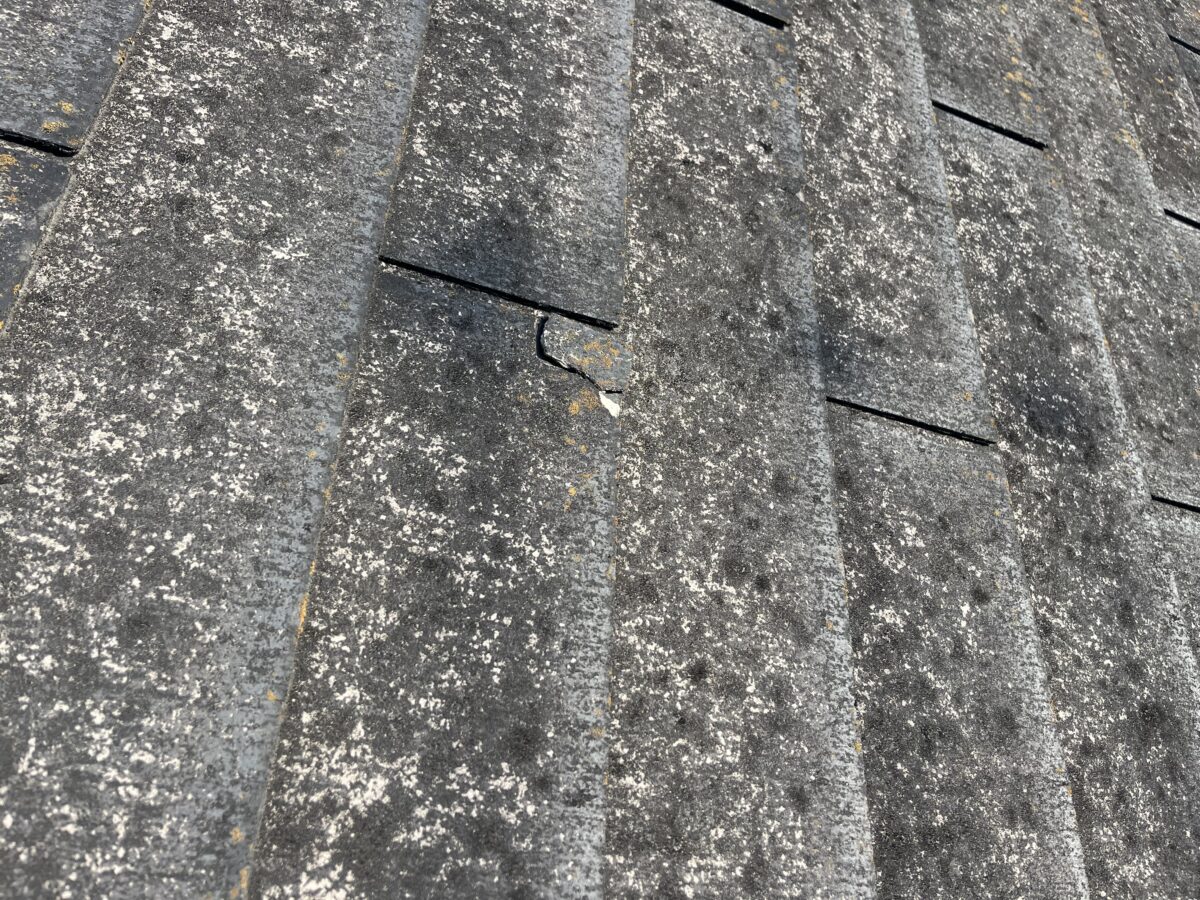 屋根全体を見ると、小さなヒビが多数入っていたり、屋根材が反って隙間ができていたり、場所によっては割れて欠けてしまっている部分もありました。最悪の状態とまではいきませんが、正直なところ、かなり傷みが進んでいる印象です。商品としては、パミールやコロニアルネオと比べると、まだ少しマシかな、というレベルですね。