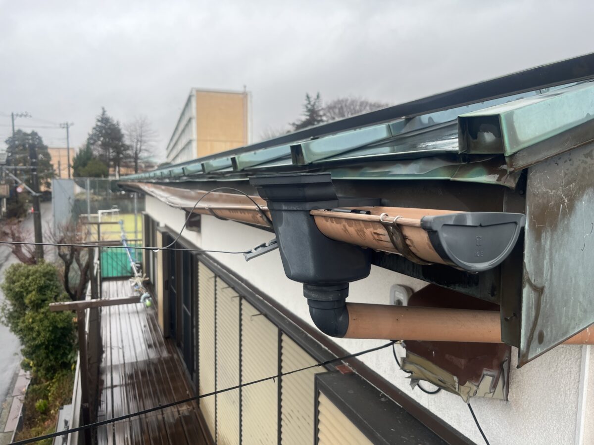御殿場市という土地柄もあり、雪止めは設置されていましたが、何年かの積雪の重みで雨どいが傾いてしまったようです。