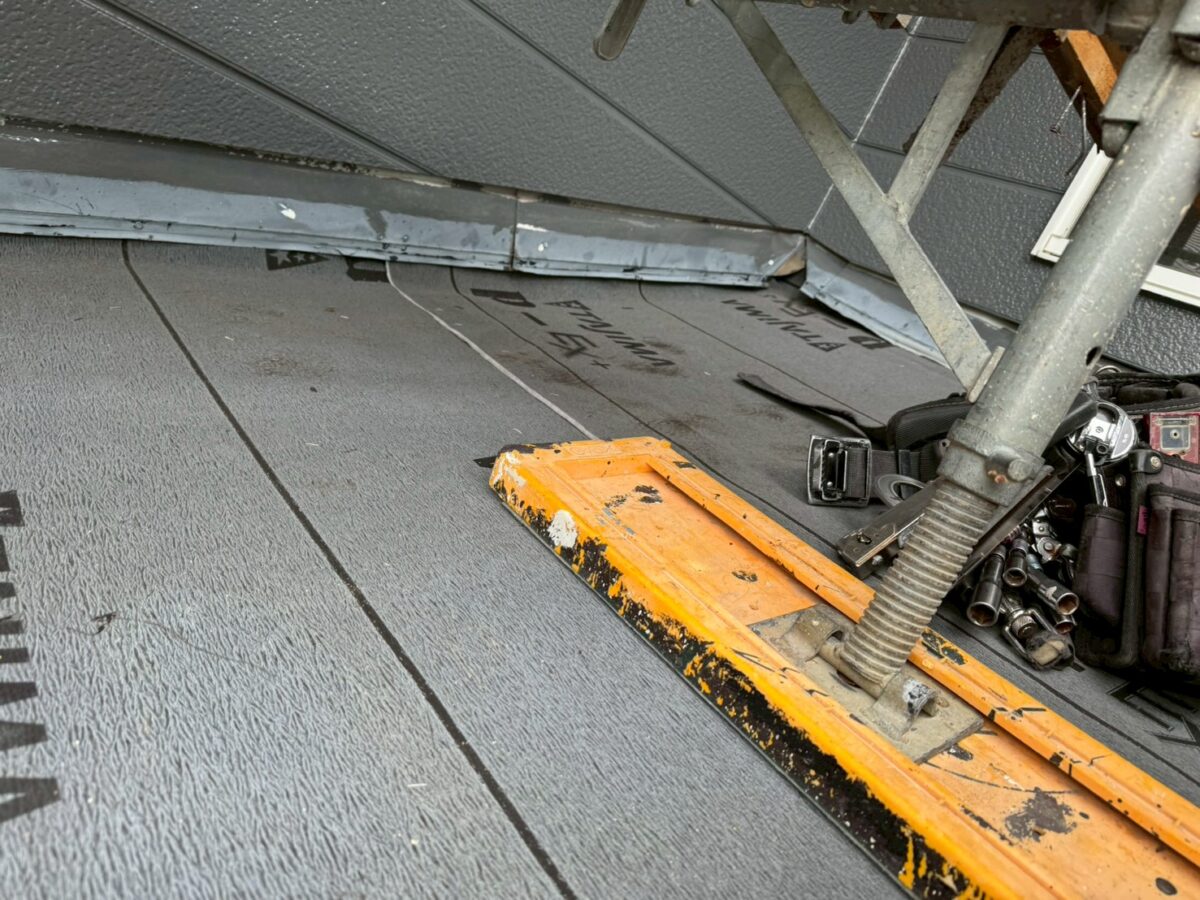 こうしておくことで、万が一壁際から水が侵入したとしても、その水はルーフィングの上を流れて外へ排水される仕組みになります。