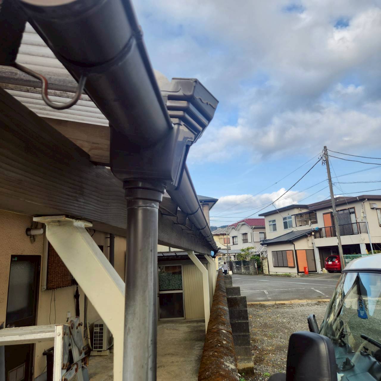 雨どいの取り付け作業です。