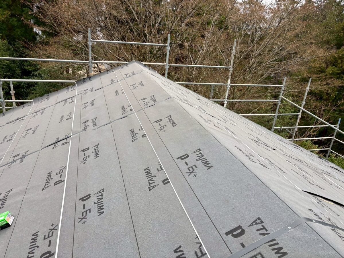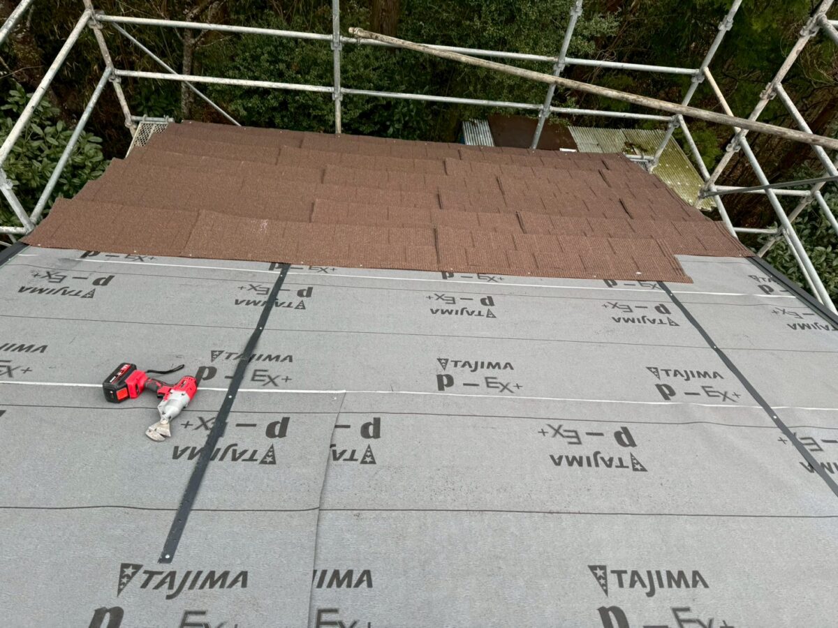 この日はルーフィング施工と、施工可能な範囲で石付き屋根材「セネター」の施工を行い、初日の作業を完了しました。