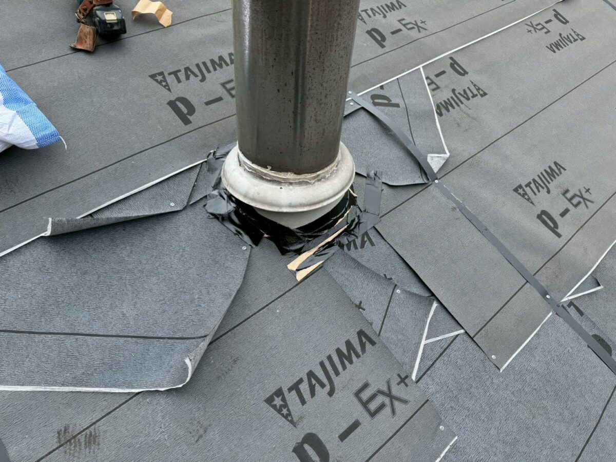 また今回のお宅は、屋根の途中から煙突が立ち上がっているため、納まりについて事前に打ち合わせを行い、次回の施工で板金による処理を行う予定です。
