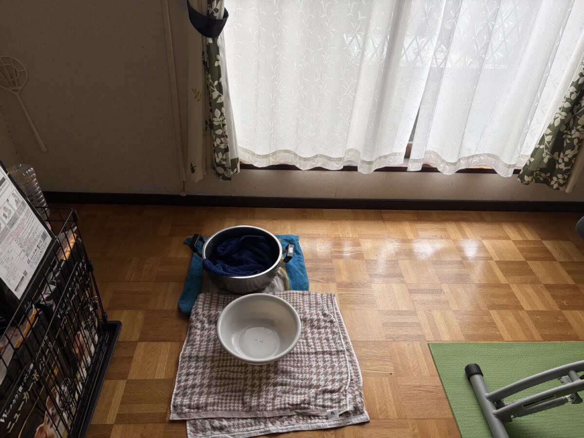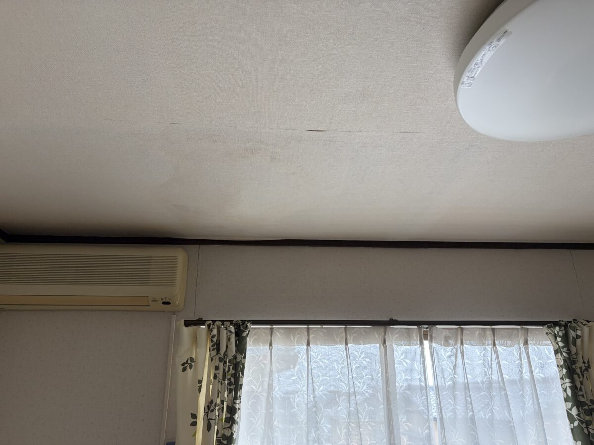 現場で漏れている箇所を確認させていただくと、天井のクロスにたっぷりと水が溜まっており、そこからポタポタと洗面器に水が落ちている状態でした。かなりの量の雨漏りで、お客様も大変ご不安だったと思います。