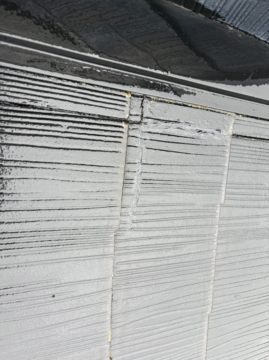 屋根に上がって確認すると、1か所屋根材が割れており、以前に塗装屋さんがコーキングで補修していた跡が見られました。