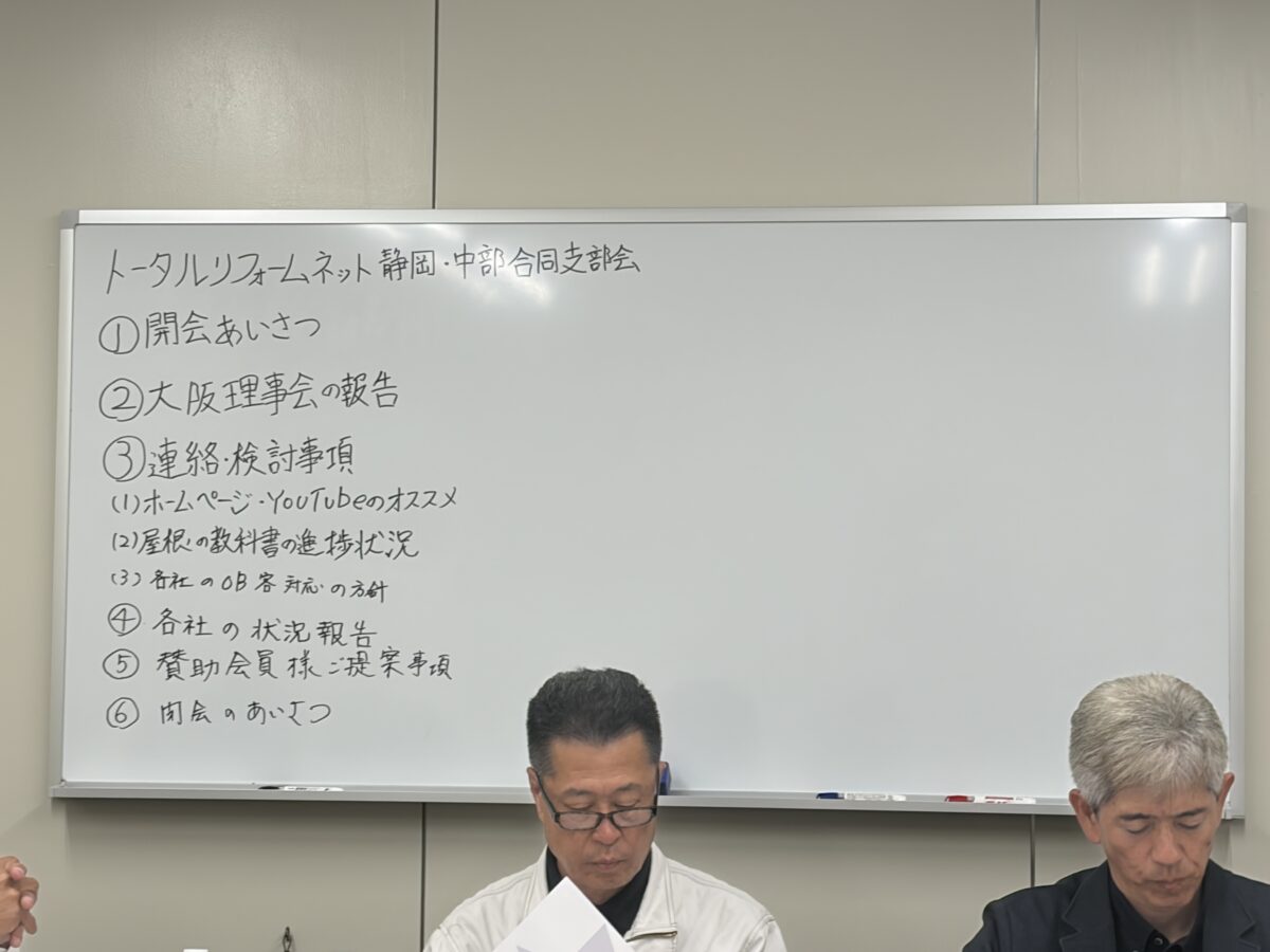 この日は、名古屋の会場で静岡支部と中部支部の合同支部会がありました。今回は広島からも東洋建設の川口社長が参加してくださり、遠方からのご参加もあって、会場はとても活気のある雰囲気となりました。
