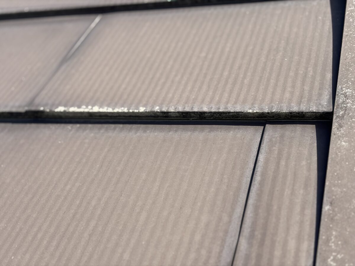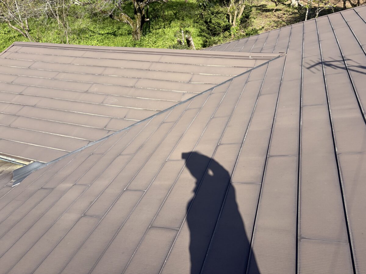 実際に屋根へ上がって確認してみると、屋根材の破損や大きな変形などは見られず、見た目には非常にきれいな状態を保っていました。ぱっと見では雨漏りにつながるような異常がなく、すぐに原因を断定できるような状況ではありませんでした。
