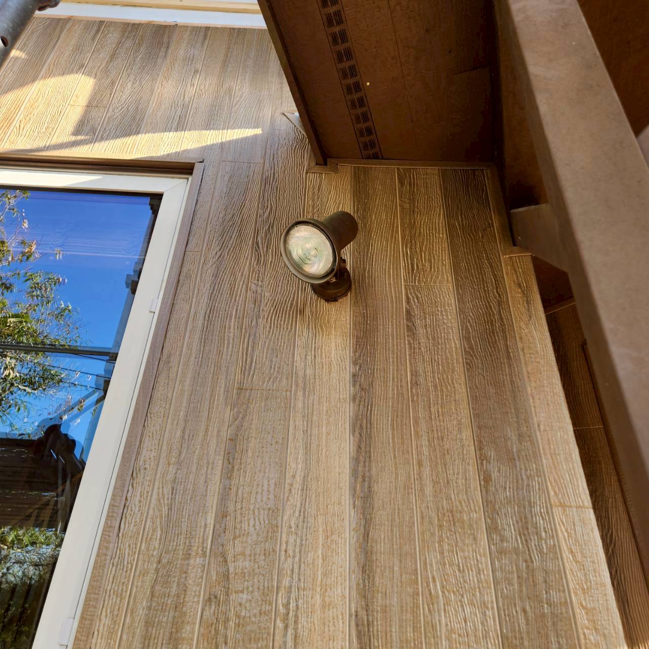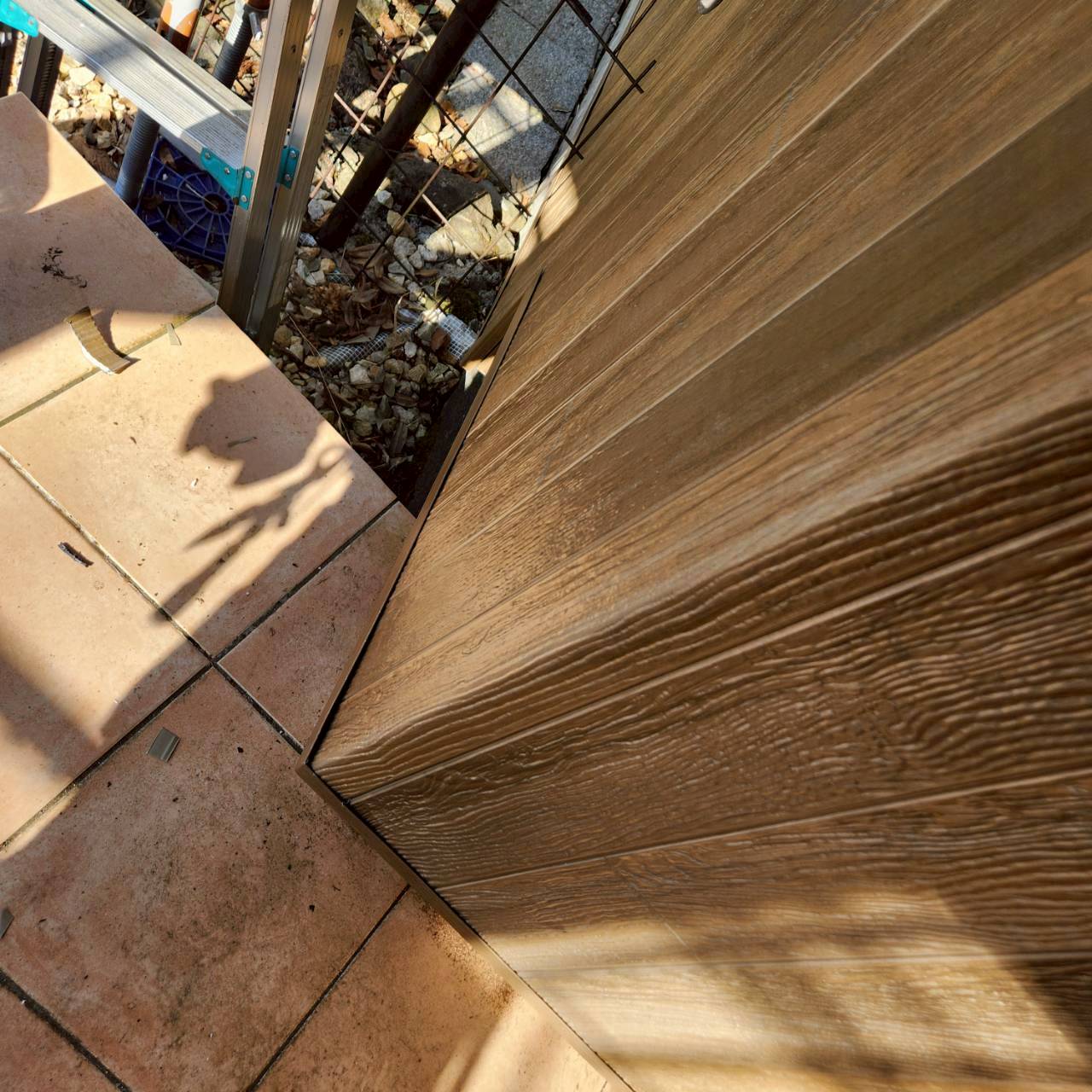 ところが、実際にiD塗装の現物をご覧になった瞬間に、お客様から、やっぱりこれを見てしまうとこちらの方が良いですね、というお言葉をいただき、今回はこちらのよりリアルな木目調の外壁材をお選びいただくこととなりました。