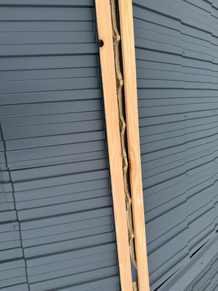 屋根工事の時には屋根本体を施工する前に必ず役物を取り付けます今回のレクトプルーフは軒先やケラバ板金と同時に木材も使用するのが特徴です。