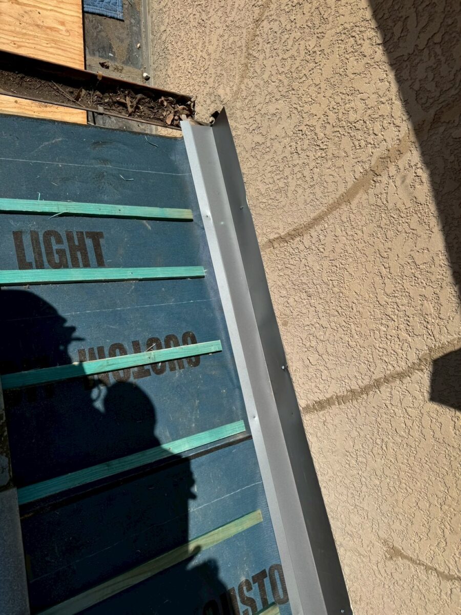 透湿防水シートを貼り木下地を打ち板金役物を取り付けていきます、木下地を打つ時にビスを打つので建物の腐食具合が分かります、ビスが効き難い箇所は壁を壊して下地を補強するのですが、コチラのお宅は大丈夫でした。