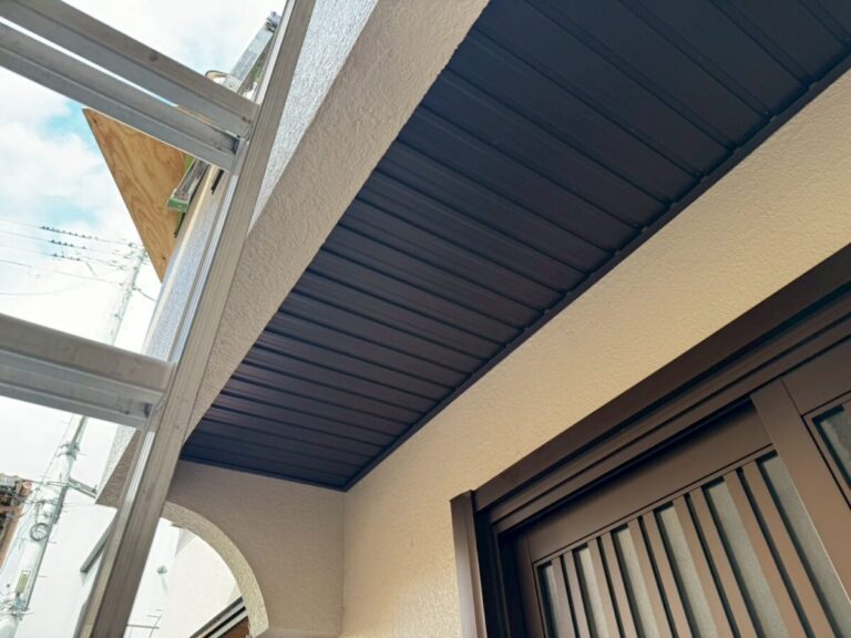 下地の木材を打ち壁際に板金役物を取り付け角波板金を取り付け今回の工事は完成です、もう雨漏りする事は有りませんが万が一雨漏りした場合でも板金ならば水に強いし隙間から雨水を逃す事が出来るので軒天はベニアよりも板金がお勧めです、コレにて完成です。