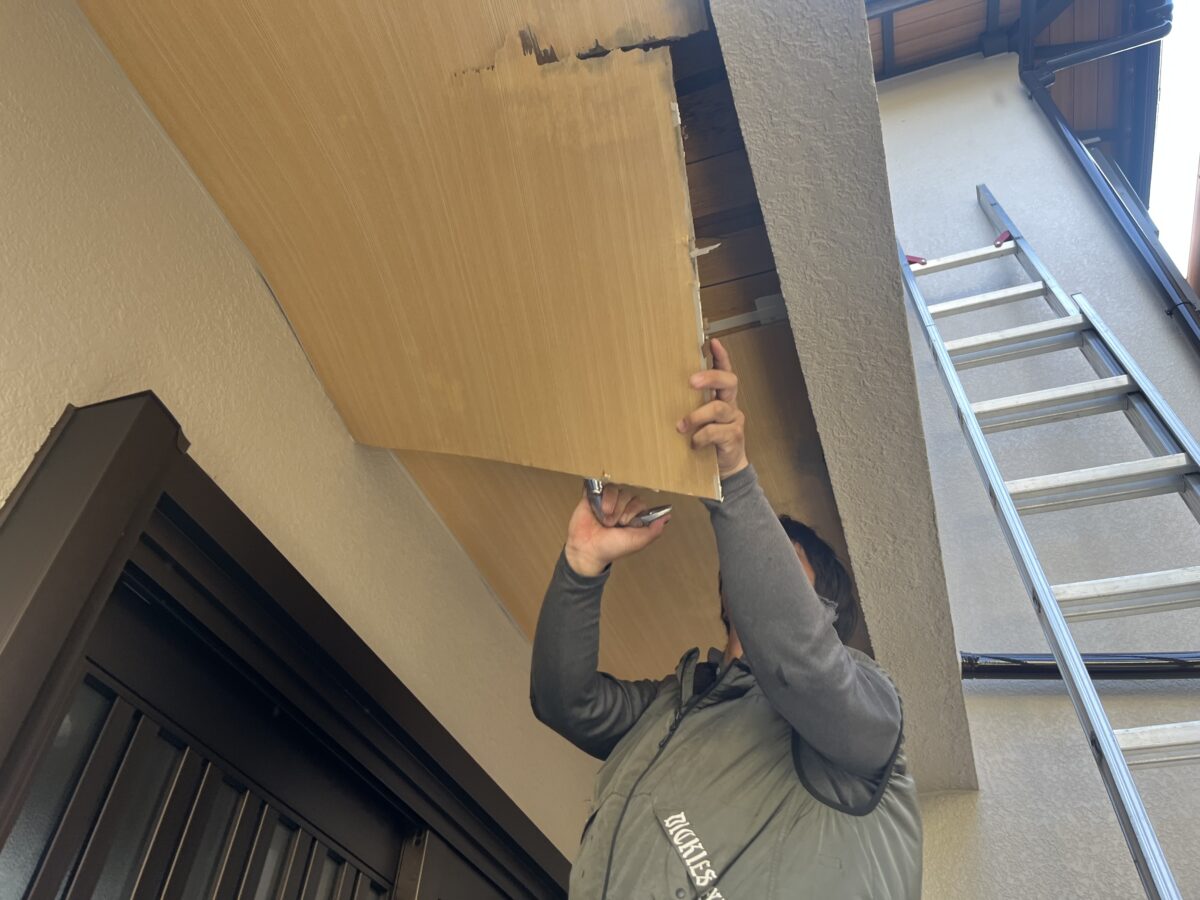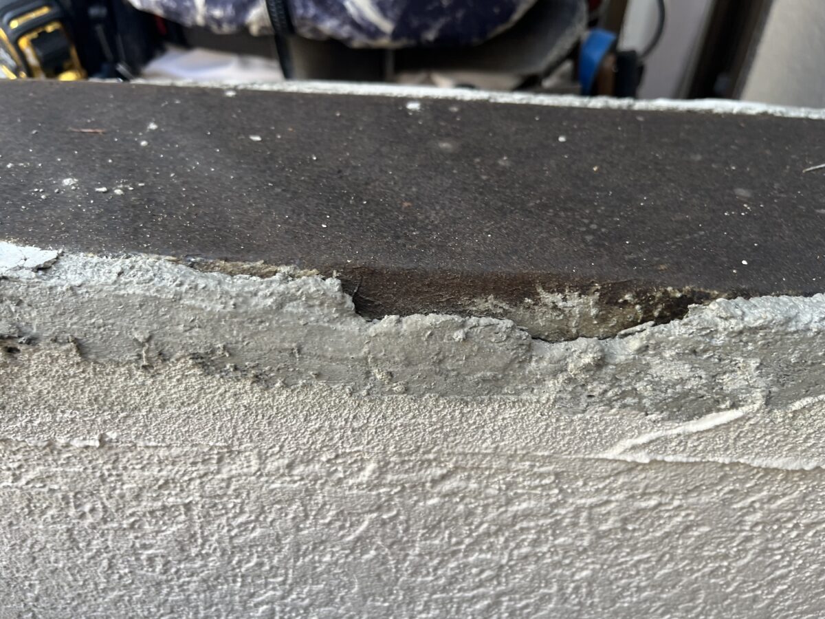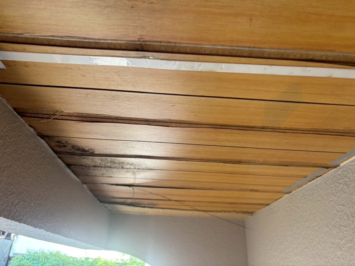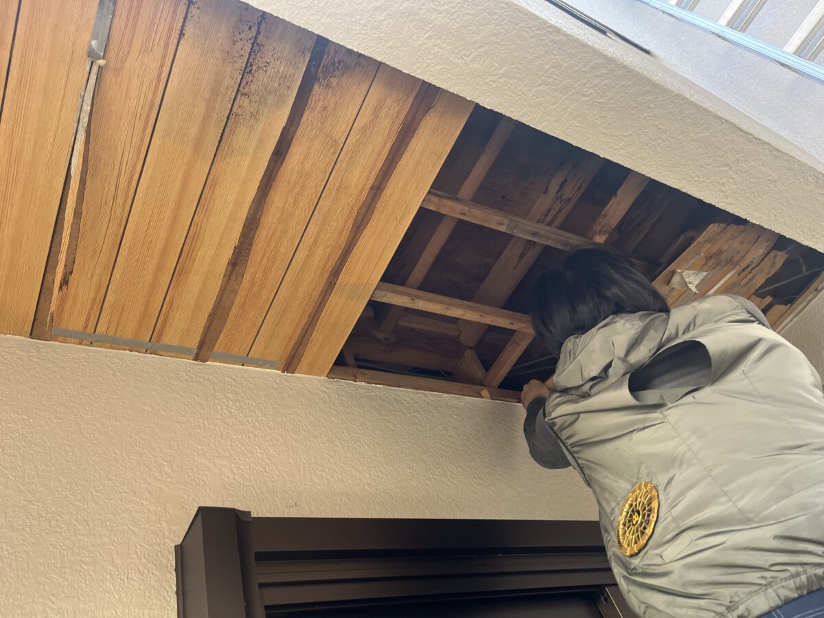 軒天をバラすと古い軒天が出て来ました施工方法は古い軒天に両面テープで貼り付けて廻りをコーキングで隠すと言う感じです、雨漏りを直さずにコレをやると雨水の逃げ場が無くなり中身が余計に腐ってしまいます、中身の雨漏り原因の画像が無いのですが、原因は防水方法に有りました、床を見ると保護モルタルでしたので、普通は合板などの床材がありゴムシートで防水してそれをモルタルで保護する流れなのですが軒天をバラして見えたのは部分的に腐った床の合板から見えた防水材はゴムシートでは無く屋根の下地材のルーフィングでした、コレは手抜き工事となります。