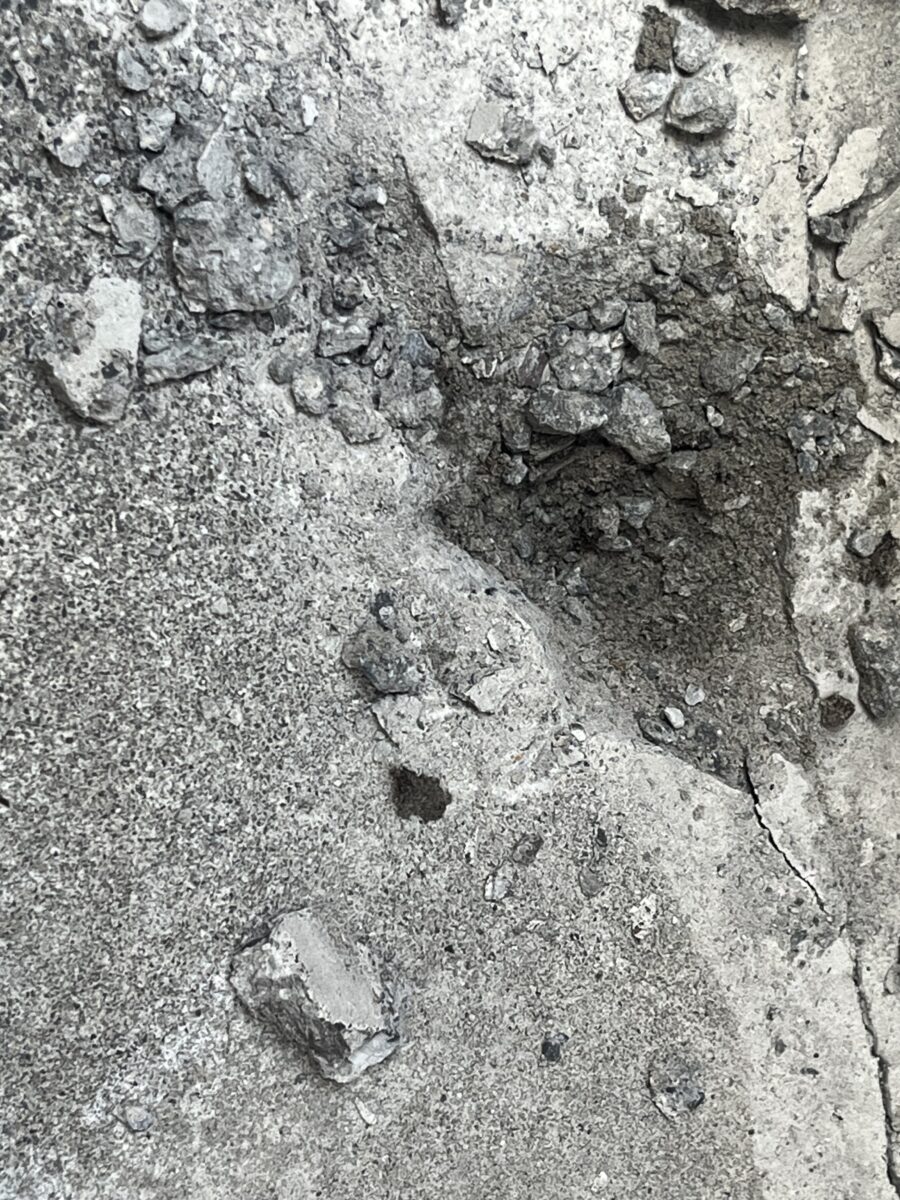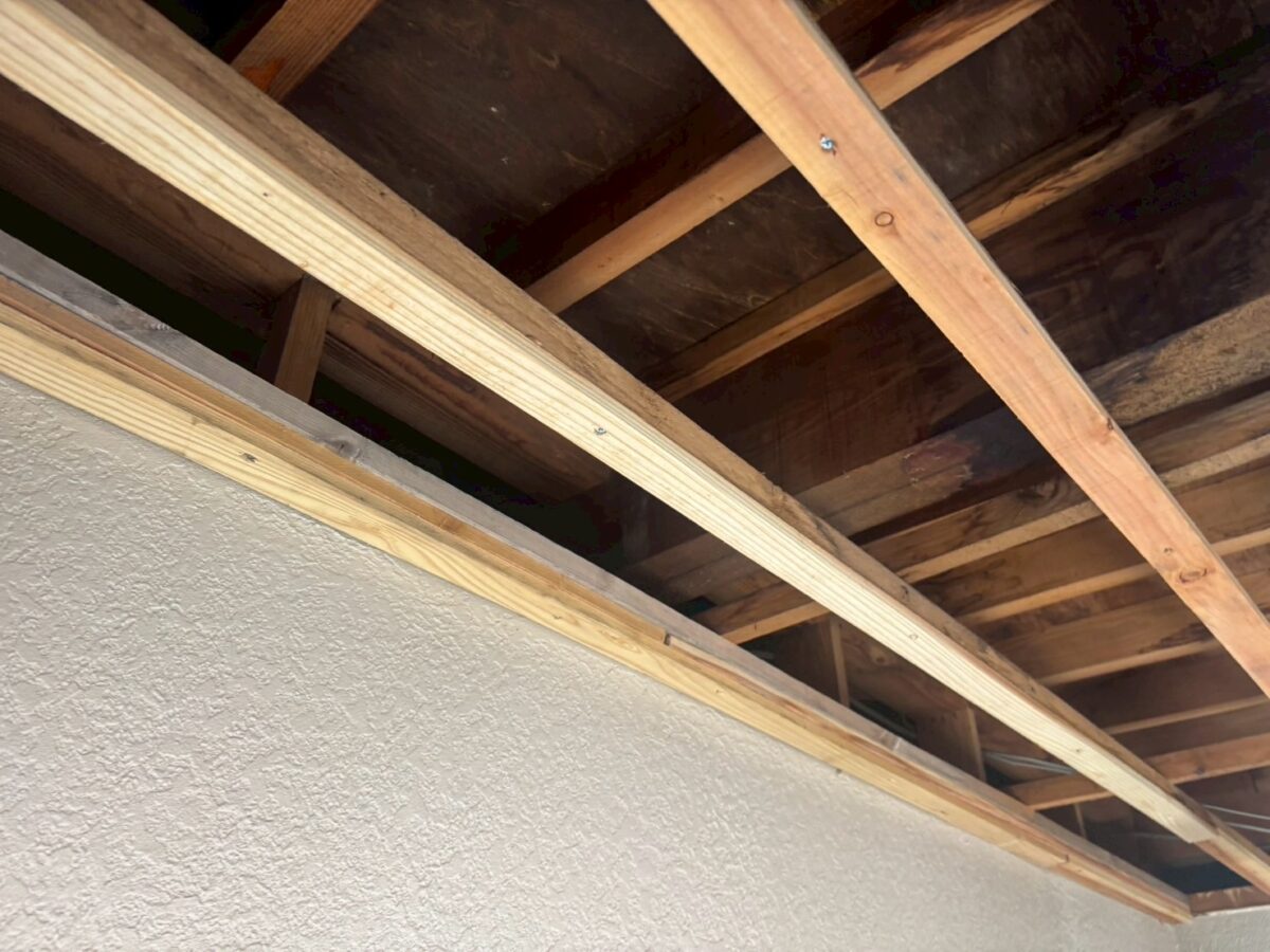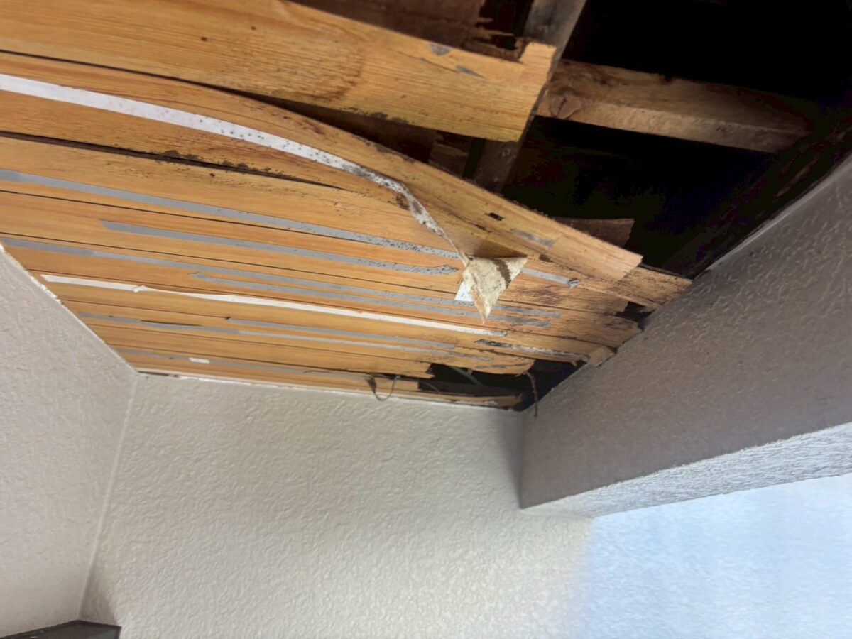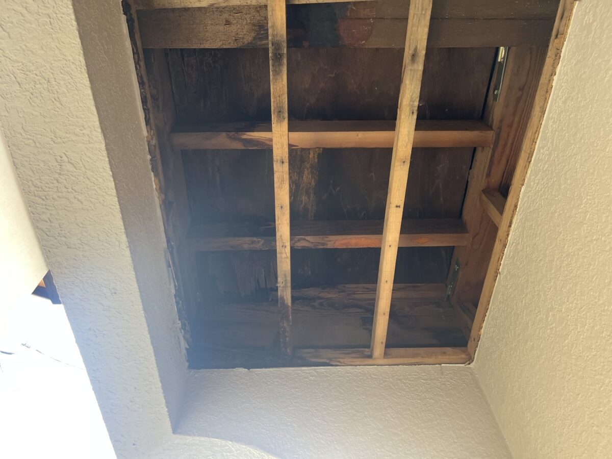 軒天をバラすと古い軒天が出て来ました施工方法は古い軒天に両面テープで貼り付けて廻りをコーキングで隠すと言う感じです、雨漏りを直さずにコレをやると雨水の逃げ場が無くなり中身が余計に腐ってしまいます、中身の雨漏り原因の画像が無いのですが、原因は防水方法に有りました、床を見ると保護モルタルでしたので、普通は合板などの床材がありゴムシートで防水してそれをモルタルで保護する流れなのですが軒天をバラして見えたのは部分的に腐った床の合板から見えた防水材はゴムシートでは無く屋根の下地材のルーフィングでした、コレは手抜き工事となります。