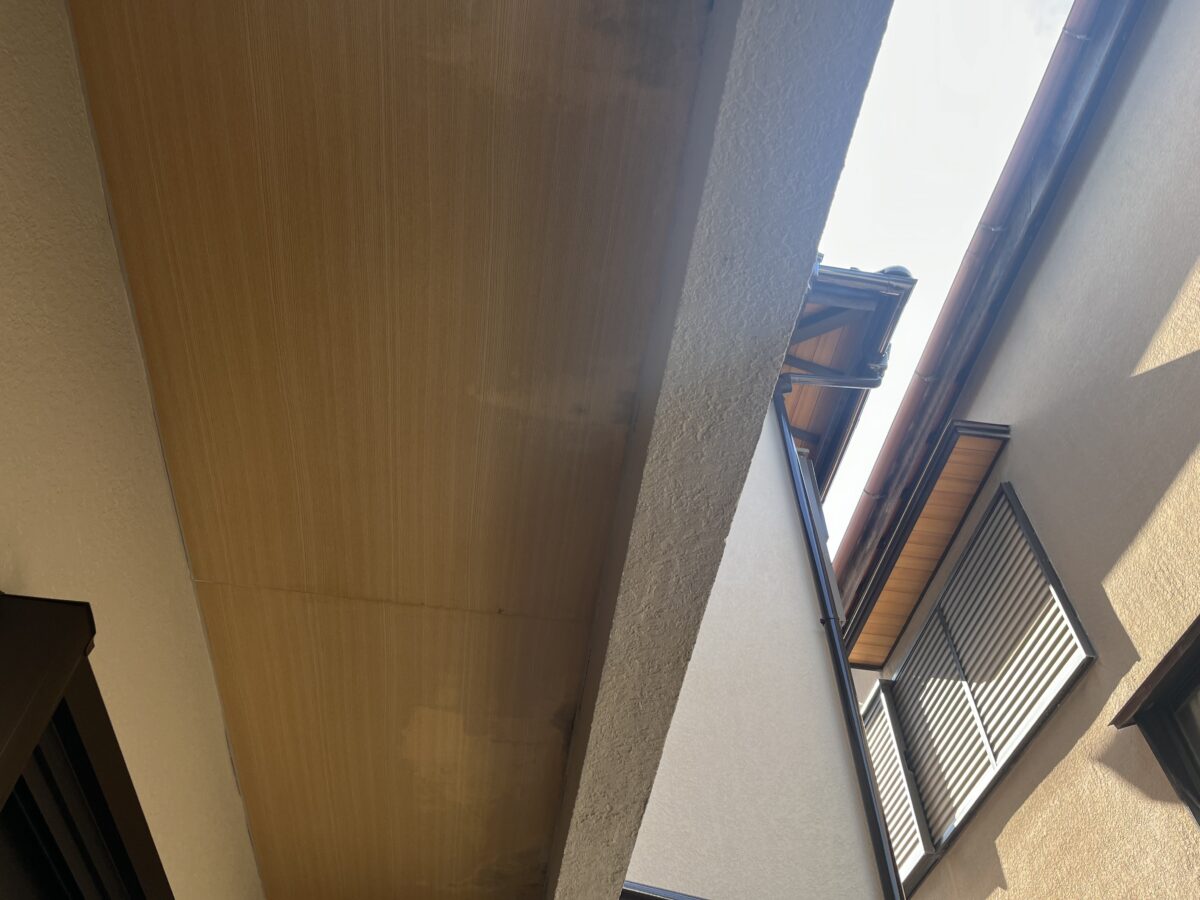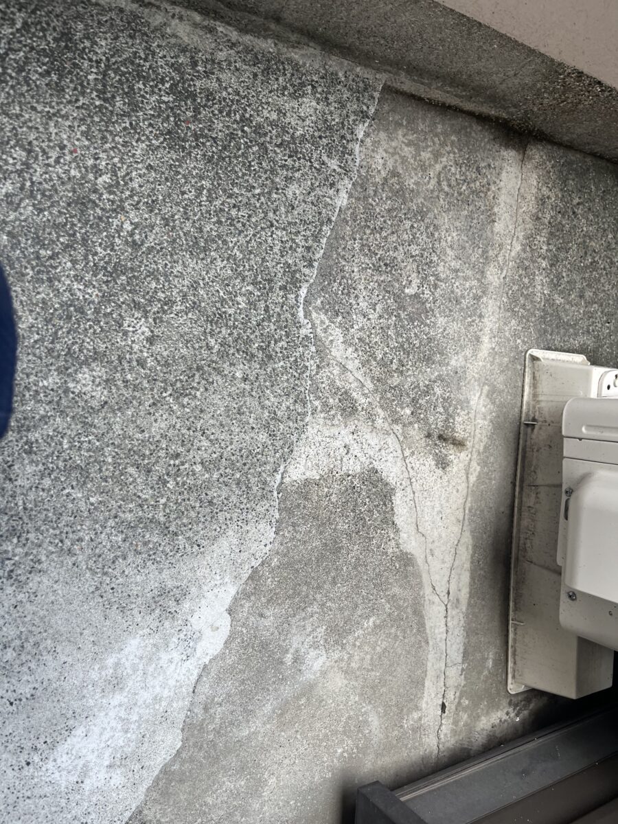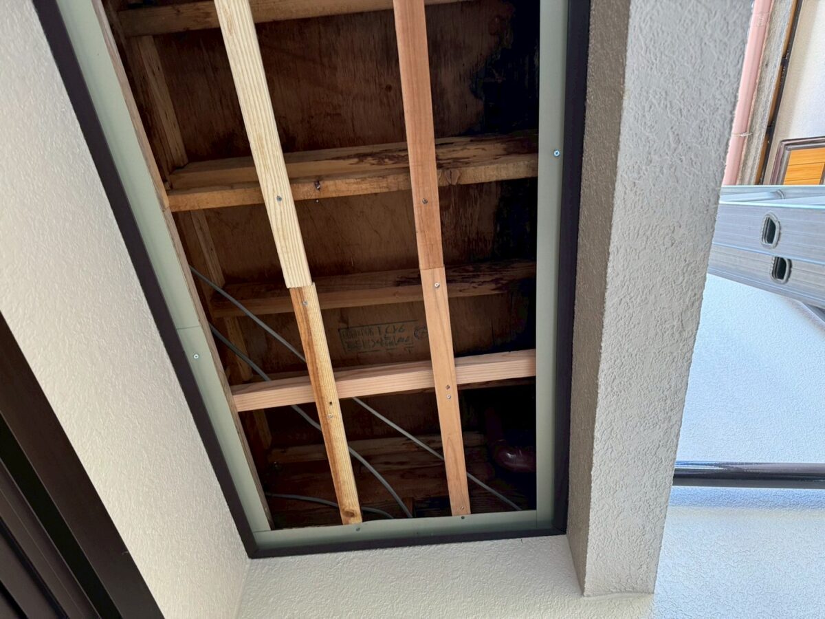 玄関上のバルコニーの軒天から雨が降ると水漏れし雨染みが出来てしまったので修理の見積もりをして下さいとの事でしたが、前回大工さんに見てもらった時には何処を直したか分からないのですが、軒天だけを綺麗に貼り結局は雨漏り自体は直らなかったので、ご自分でバルコニーにモルタルを買って来て塗ったそうですが、水が溜まる様になり余計に雨漏りが酷くなってしまったと言う現場となります。