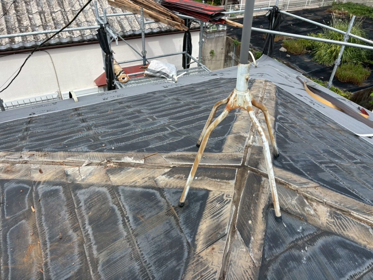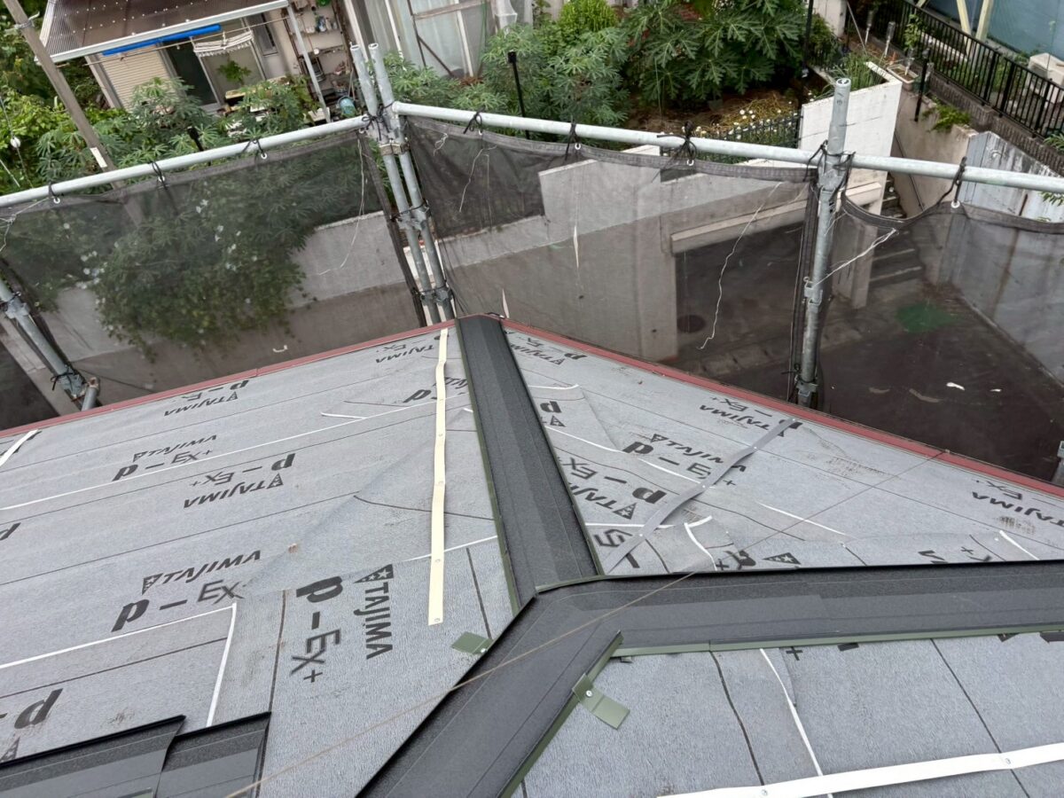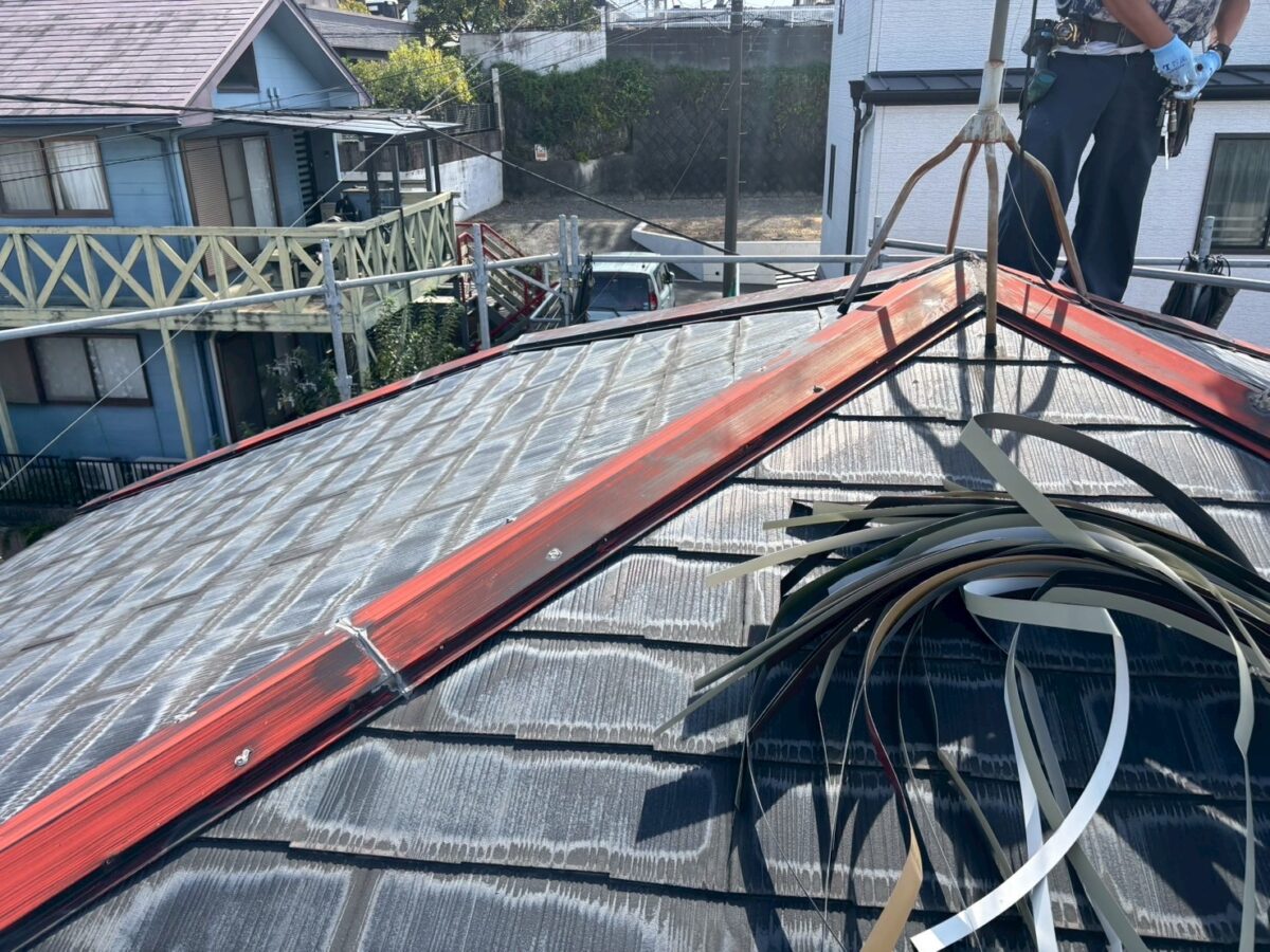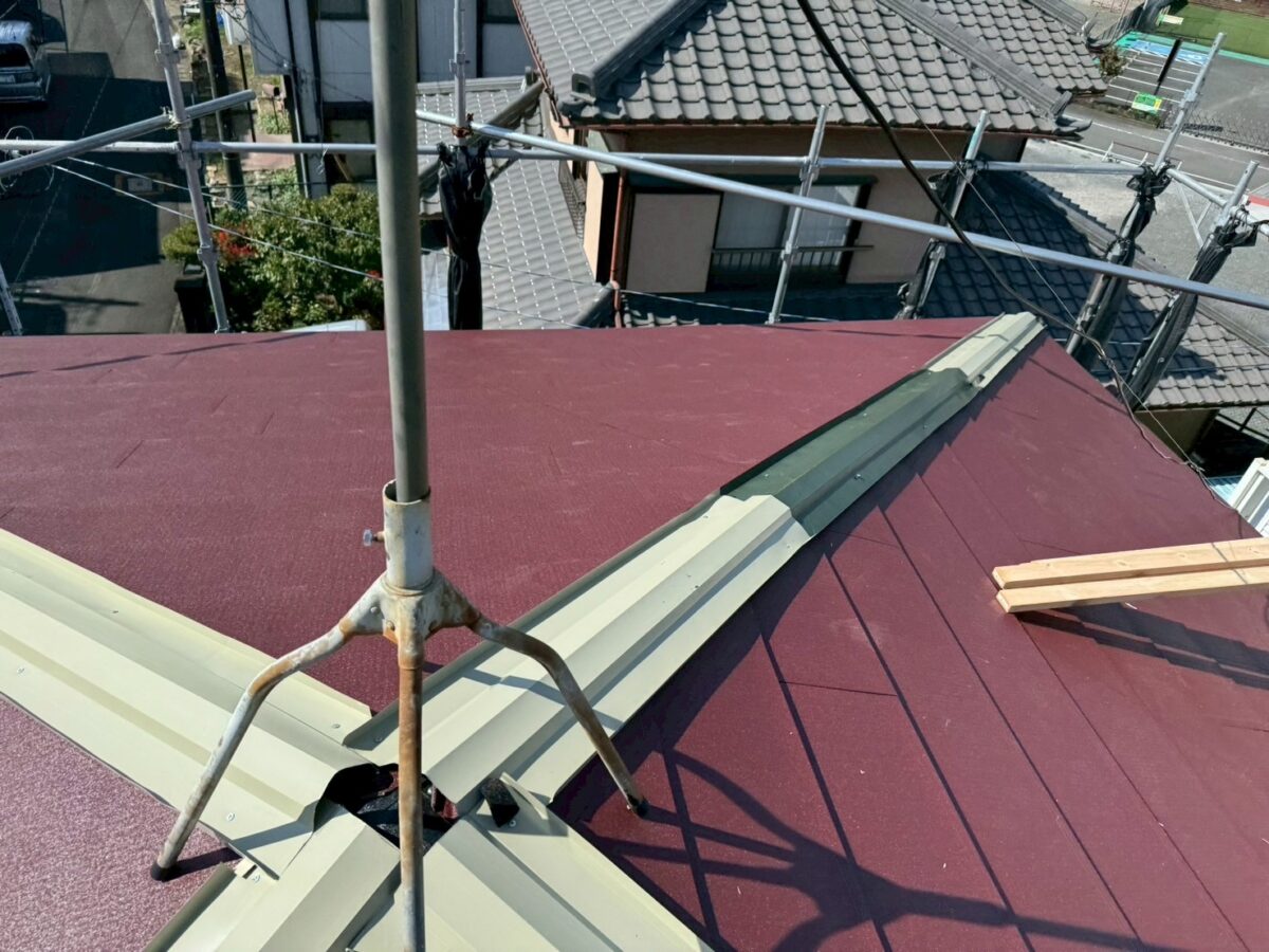 今回のお客様は常に雨漏りする訳では無いですが、一年に一度位の大雨の時には少しだけ雨漏りしてきてしまうので、屋根塗装をしたいと言うご相談でした、一年に一度位の雨漏りなので下地の状態は悪くないのですが、さすがに塗装で雨漏りを直すことは出来ませんので、しっかりとご説明しまして屋根カバー工事となりました、棟板金を外してルーフィングをはれば、もう雨漏りとは関係ないです。