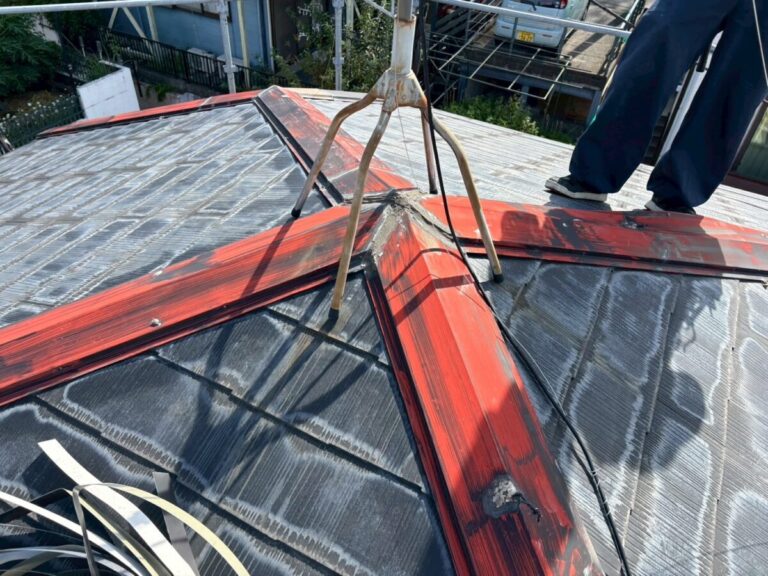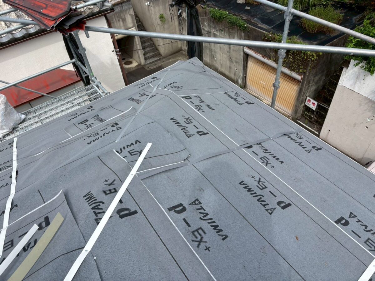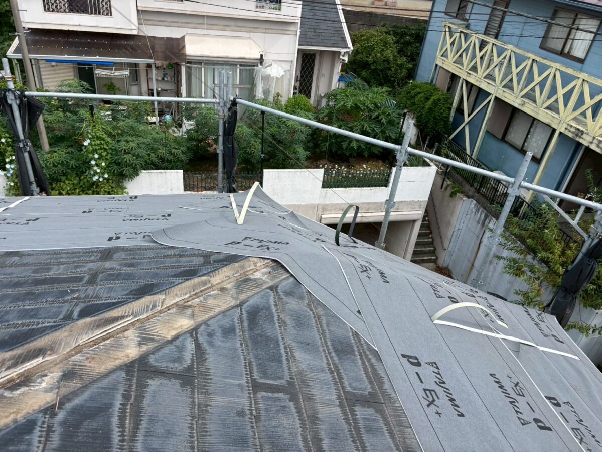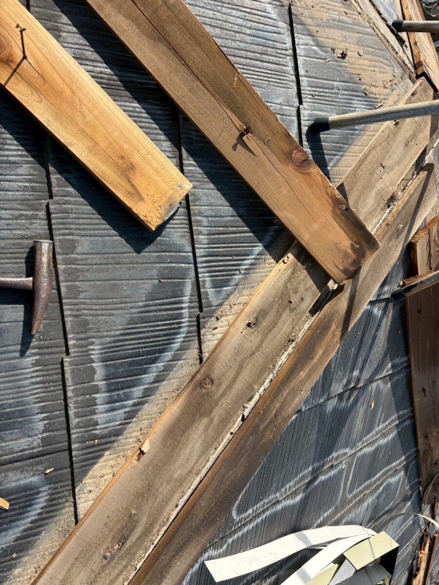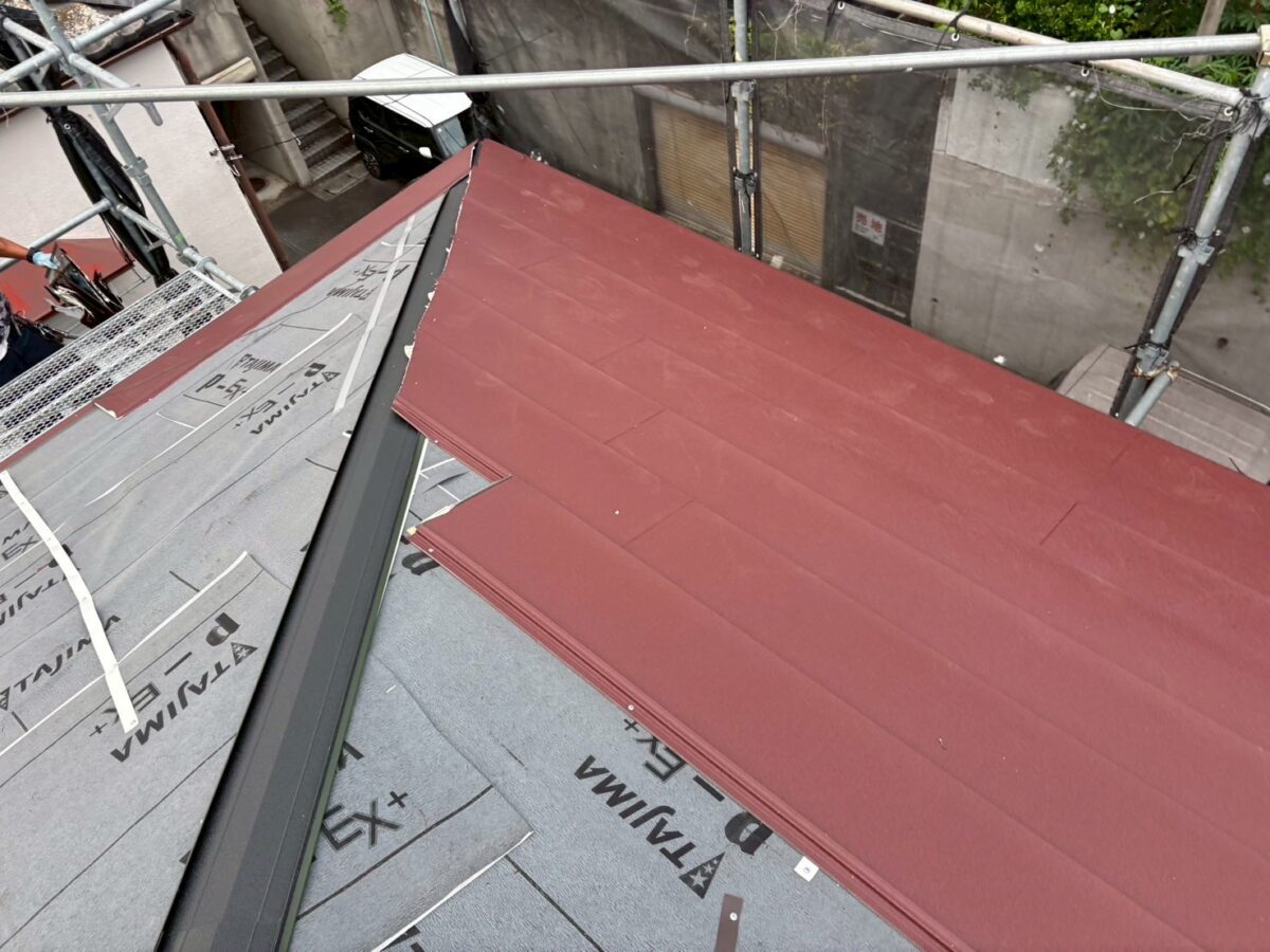 今回のお客様は常に雨漏りする訳では無いですが、一年に一度位の大雨の時には少しだけ雨漏りしてきてしまうので、屋根塗装をしたいと言うご相談でした、一年に一度位の雨漏りなので下地の状態は悪くないのですが、さすがに塗装で雨漏りを直すことは出来ませんので、しっかりとご説明しまして屋根カバー工事となりました、棟板金を外してルーフィングをはれば、もう雨漏りとは関係ないです。
