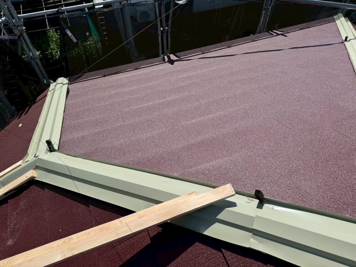 降り棟の下敷きを取り付けシルキーG2を施工します、色は鮮やかなワインレッドです、金属の横葺きは雨水が本体の引っ掛かり部材に入り込み横走りして降り棟の内部に入り込み易いので、この下敷き板金はとても重要になります。
