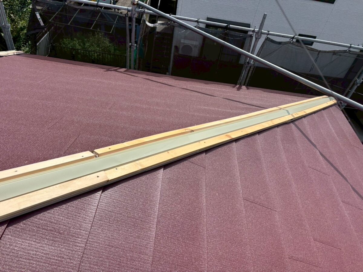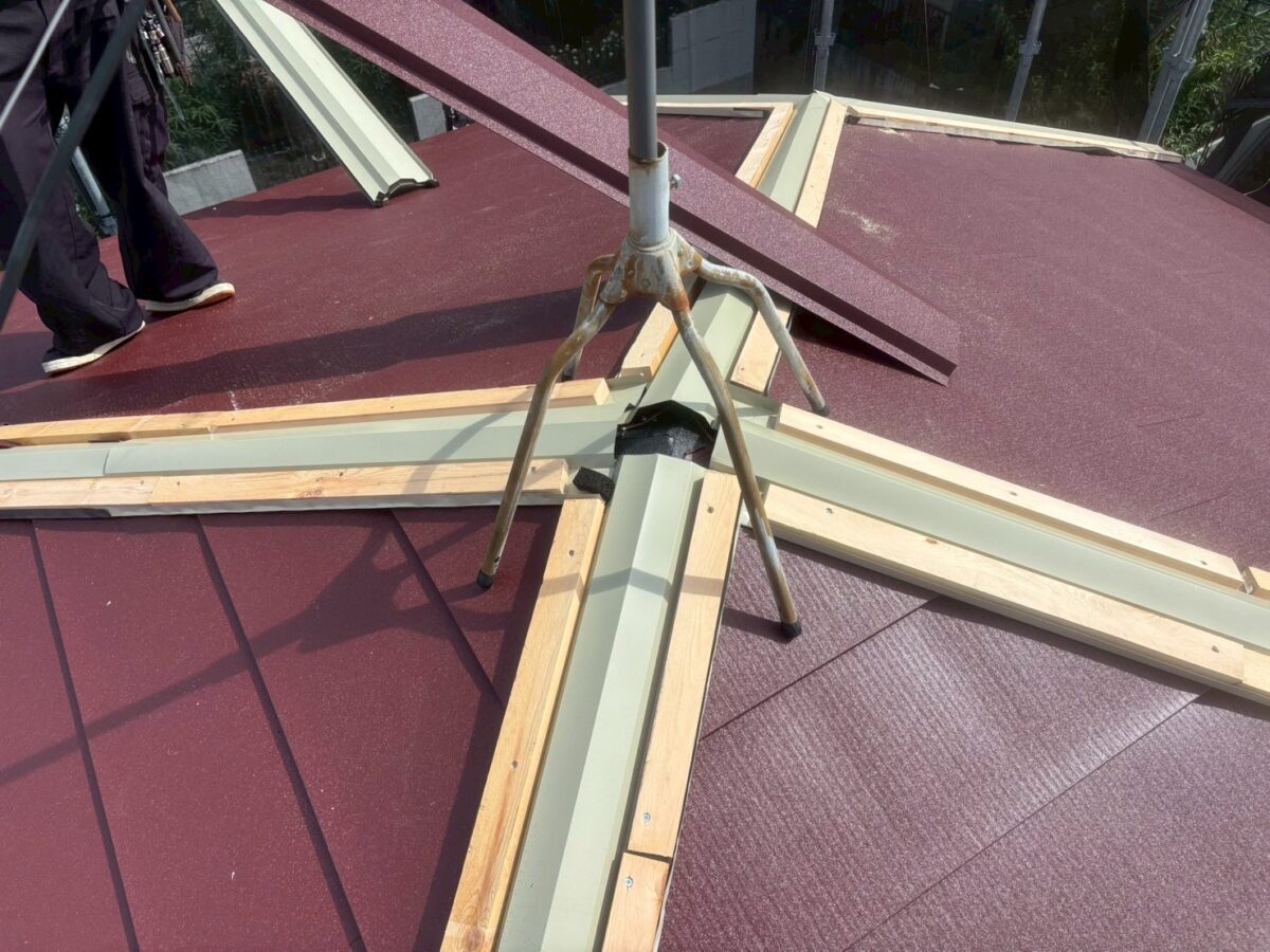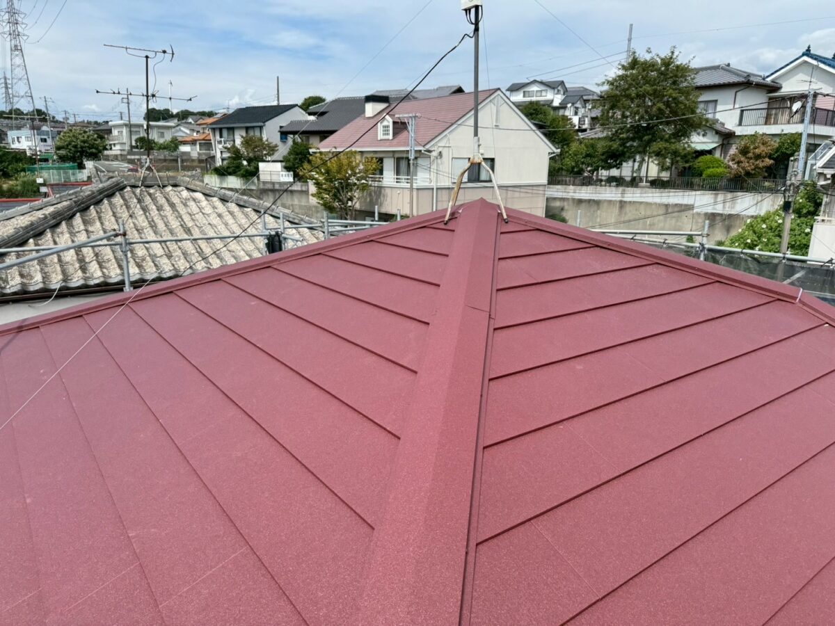 私達が独自で考えた非常に腐り難い仕様の棟下地を取り付け棟板金を取り付け屋根カバー工事は完成です。