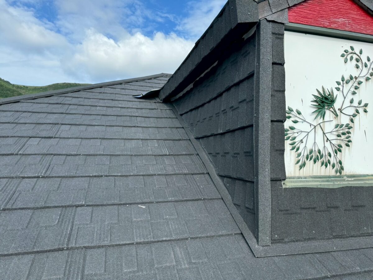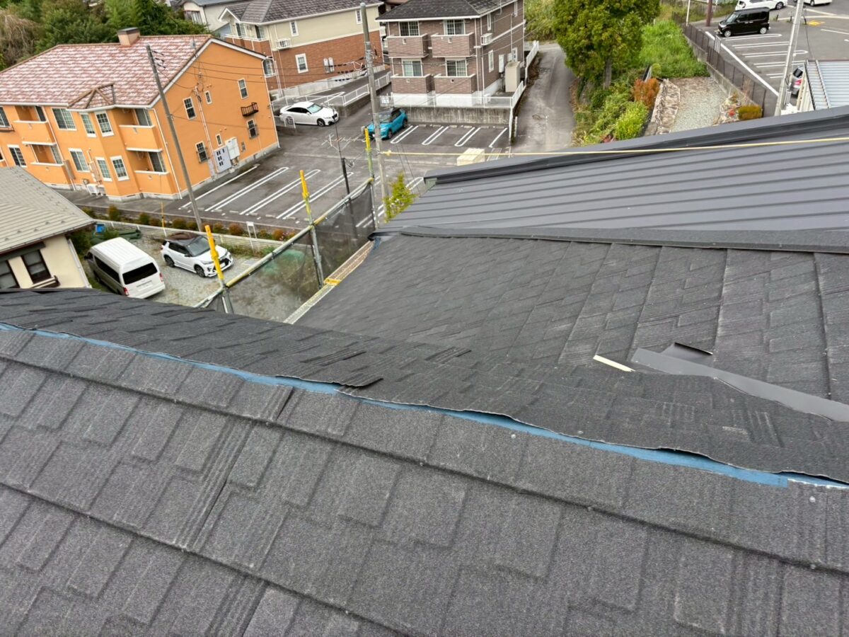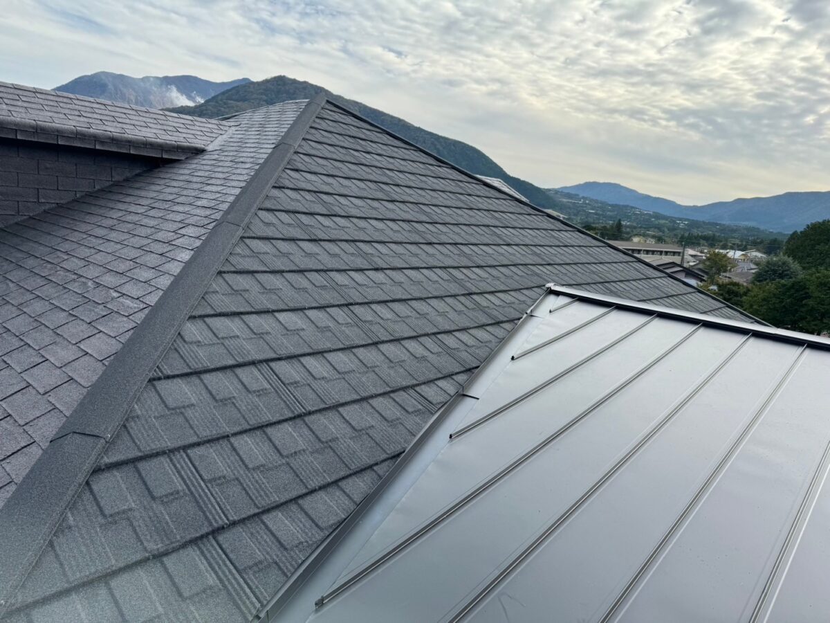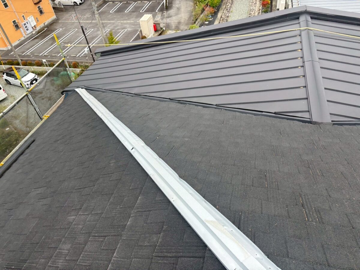 実は一年前に雨漏りがあり工事をさせていただきましたお宅です、上の画像は前回工事の画像となります、この時は増築部分の勾配不良の為に縦葺きに変更したのと屋根を継いだ一面が雨漏りしていたので、既存のシングル葺きに似た屋根材のリクシルTルーフモダンと致しました、その他の部分も実は雨漏りしていたのですが事前に他社で修理してとりあえず止まってるとの事でしたが、直し方が私から見て再発する直し方なので一緒にやった方がお得ですと伝えましたが、様子を見ると言う事で部分工事で終わりました、それから一年足らずで大雨が降り5箇所位から雨漏りしたそうで、やっぱり他の3面もやって下さいとのご依頼をいただき工事に至りました。