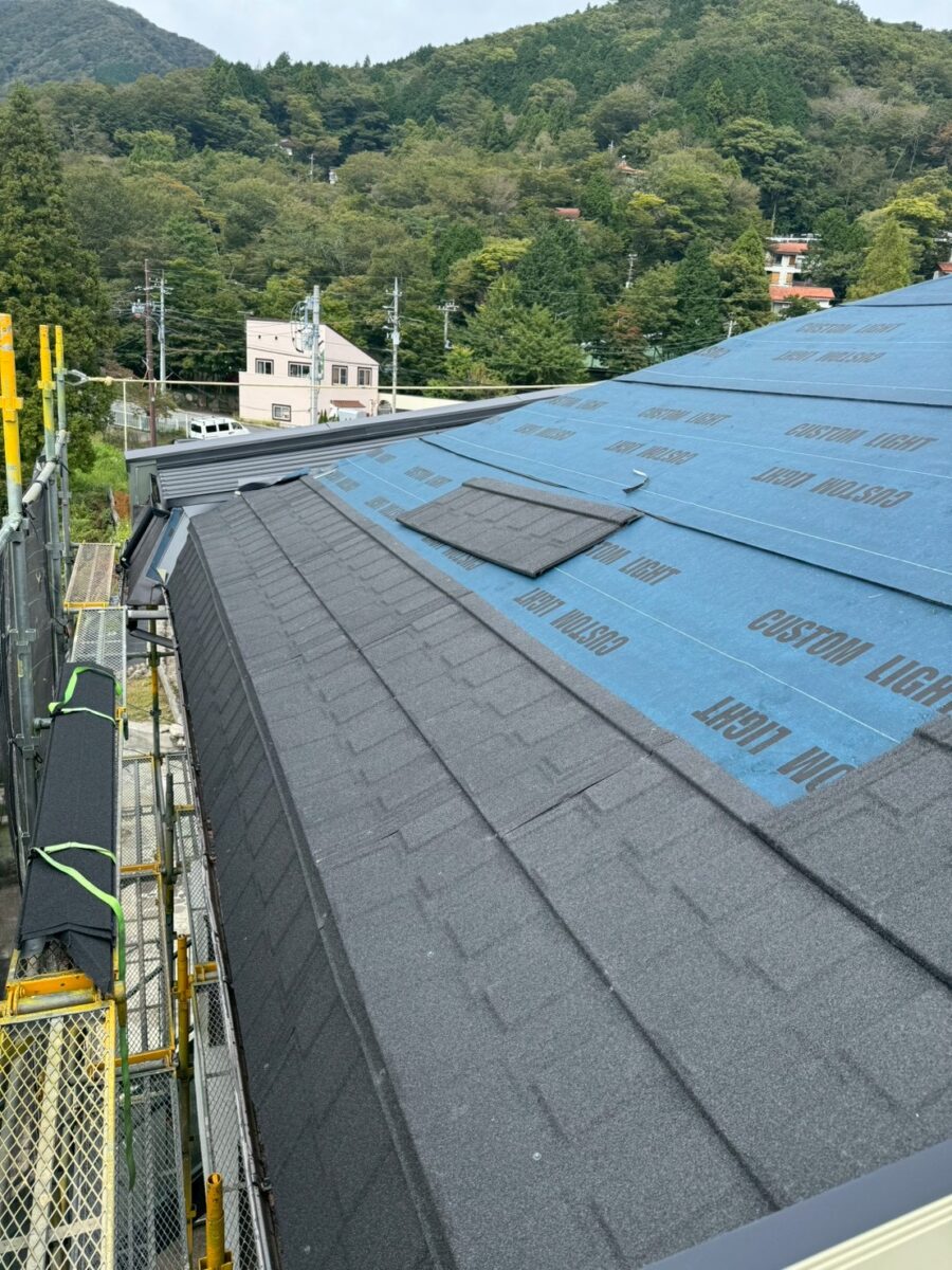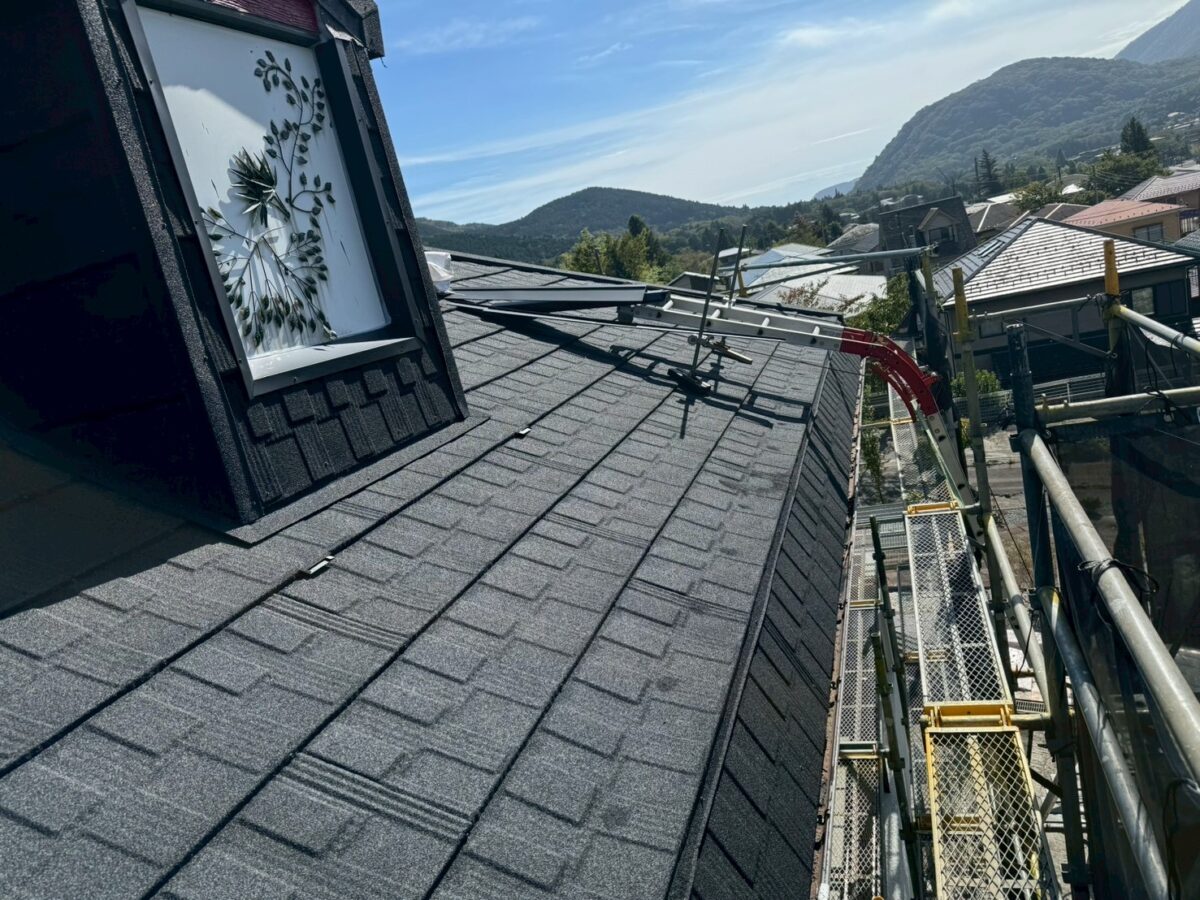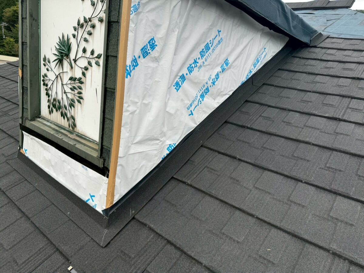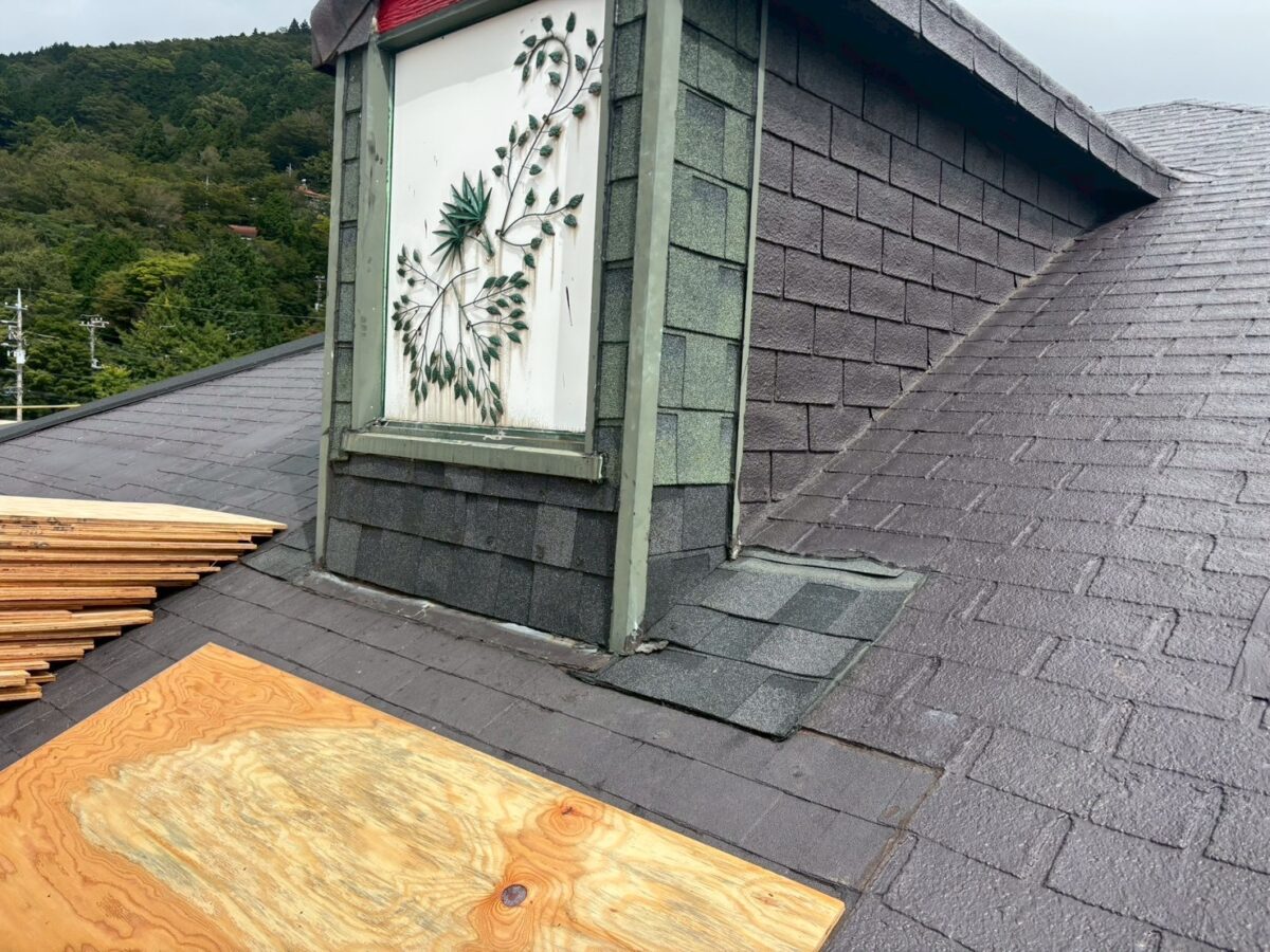 実は一年前に雨漏りがあり工事をさせていただきましたお宅です、上の画像は前回工事の画像となります、この時は増築部分の勾配不良の為に縦葺きに変更したのと屋根を継いだ一面が雨漏りしていたので、既存のシングル葺きに似た屋根材のリクシルTルーフモダンと致しました、その他の部分も実は雨漏りしていたのですが事前に他社で修理してとりあえず止まってるとの事でしたが、直し方が私から見て再発する直し方なので一緒にやった方がお得ですと伝えましたが、様子を見ると言う事で部分工事で終わりました、それから一年足らずで大雨が降り5箇所位から雨漏りしたそうで、やっぱり他の3面もやって下さいとのご依頼をいただき工事に至りました。