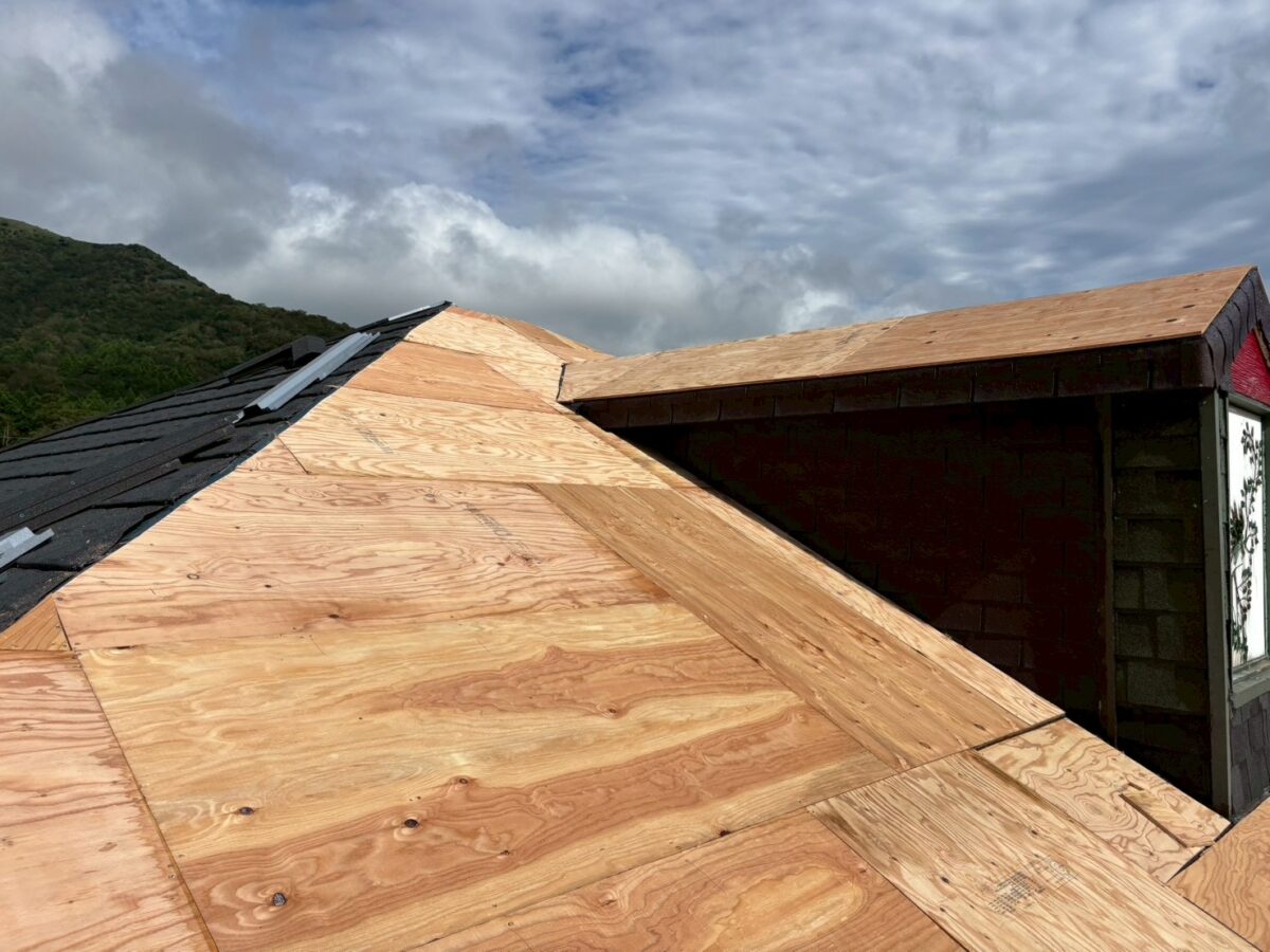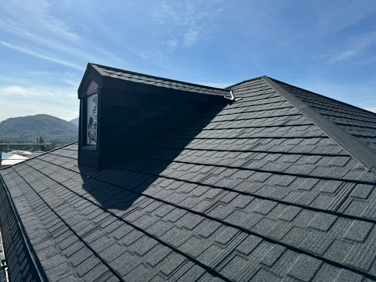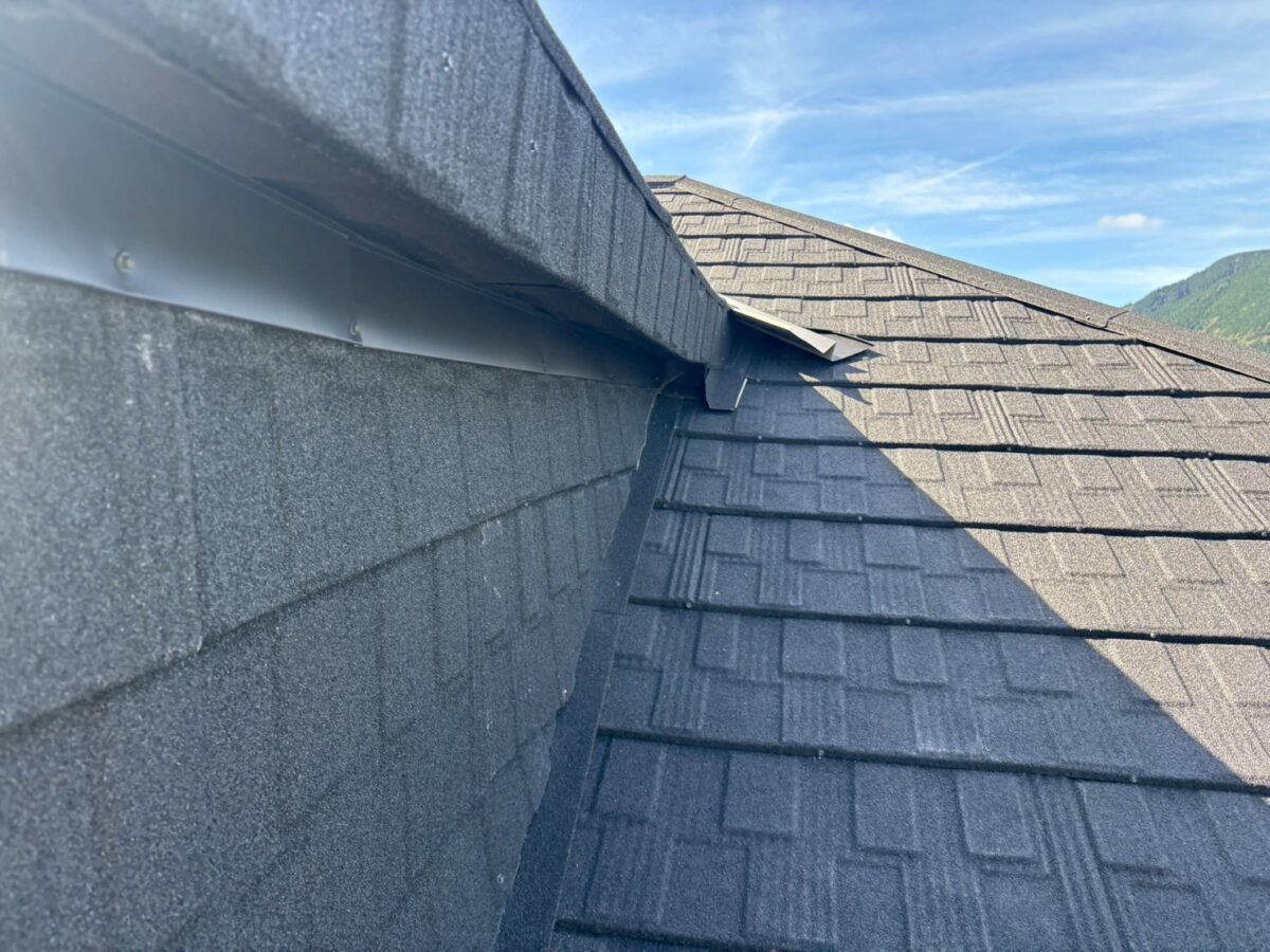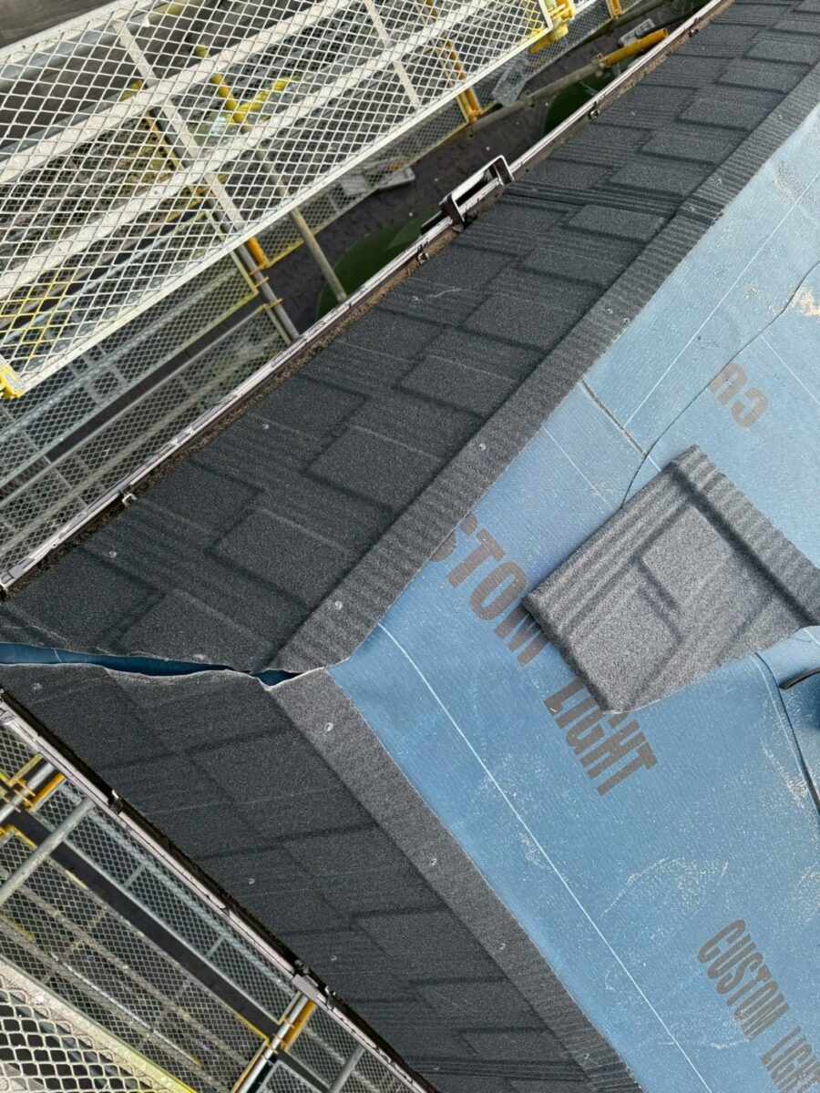 実は一年前に雨漏りがあり工事をさせていただきましたお宅です、上の画像は前回工事の画像となります、この時は増築部分の勾配不良の為に縦葺きに変更したのと屋根を継いだ一面が雨漏りしていたので、既存のシングル葺きに似た屋根材のリクシルTルーフモダンと致しました、その他の部分も実は雨漏りしていたのですが事前に他社で修理してとりあえず止まってるとの事でしたが、直し方が私から見て再発する直し方なので一緒にやった方がお得ですと伝えましたが、様子を見ると言う事で部分工事で終わりました、それから一年足らずで大雨が降り5箇所位から雨漏りしたそうで、やっぱり他の3面もやって下さいとのご依頼をいただき工事に至りました。