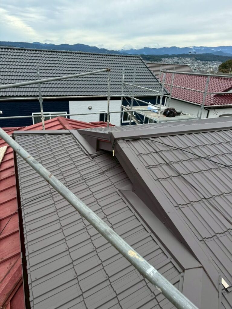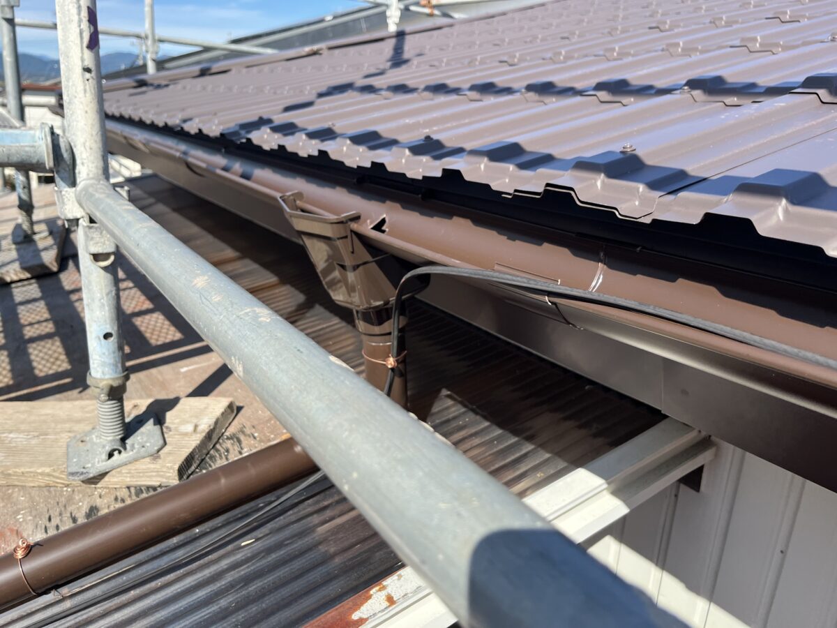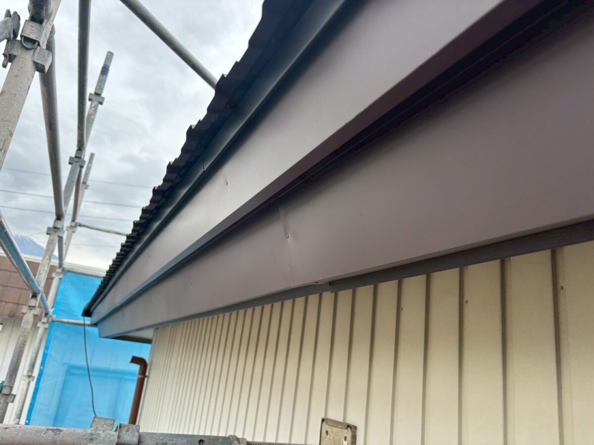 鼻隠し板金を加工し取り付け、雨樋を取り付けて完成しました屋根を嵩上げした分鼻隠し板金の幅も75mm位増えたので重量感が大幅に増しました!でも中は空気層なので重さは無く断熱効果だけが増す形となっています、最近遮熱塗装で涼しくと言うフレーズが流行っていますが、こちらは断熱なので遮熱性も何倍も有りますし冬も断熱で暖かさをキープしますので、そこの効果の違いは計り知れないです!