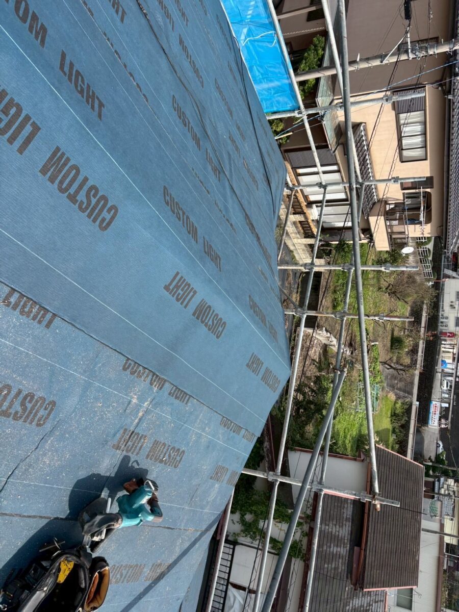 合板を木ビスでしっかりと絡ませて粘着層付きルーフィングを貼ります、勾配が2寸なので今回施工するレクトプルーフは一寸五分から対応可能なので大丈夫なのですが、適応勾配との差が五分しかないので念のため粘着層付きルーフィングを貼ります。