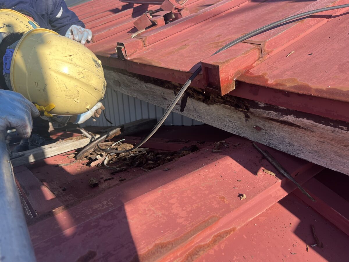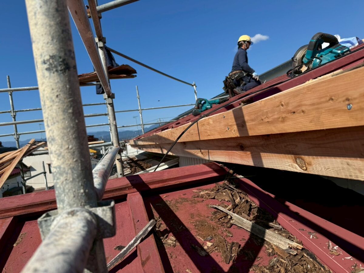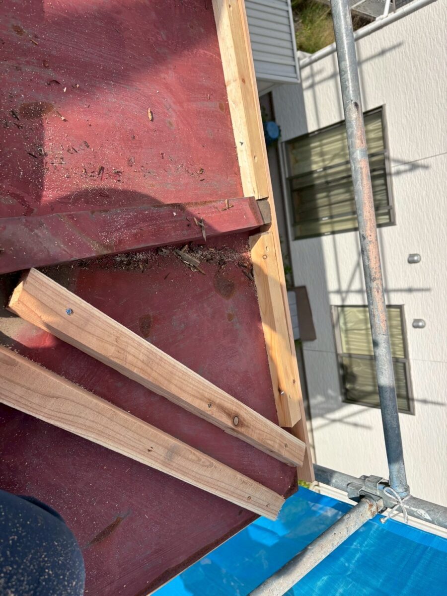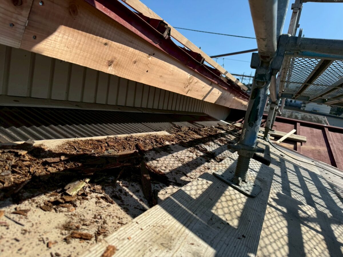 雨樋を取り外し鼻隠し板を新しく取り替えていきます、今回は雨樋を取り替えるので屋根の瓦棒を取り外しせずに嵩上げした感じで鼻隠しも二段にして、二段にした方に軒樋を付けると言うマックス建材さんの施工書通りにやる事としました、いつもは屋根の凹凸になっている桟を外してフラットにして合板を貼るので、解体の手間は省けるのですが逆に増える作業もあり、何方が良いかは微妙ですが空気層がより多く儲けられるのは確実に今回のやり方です。