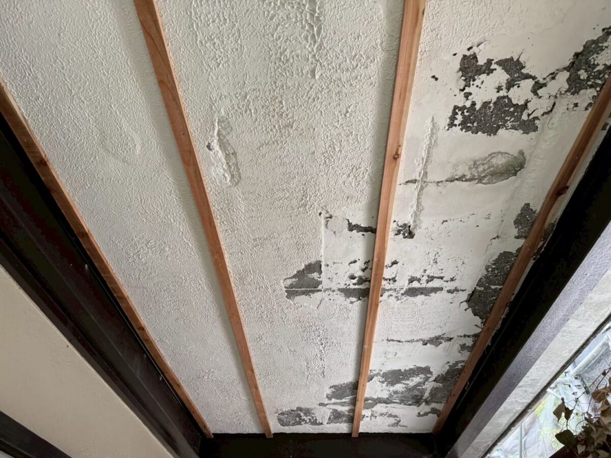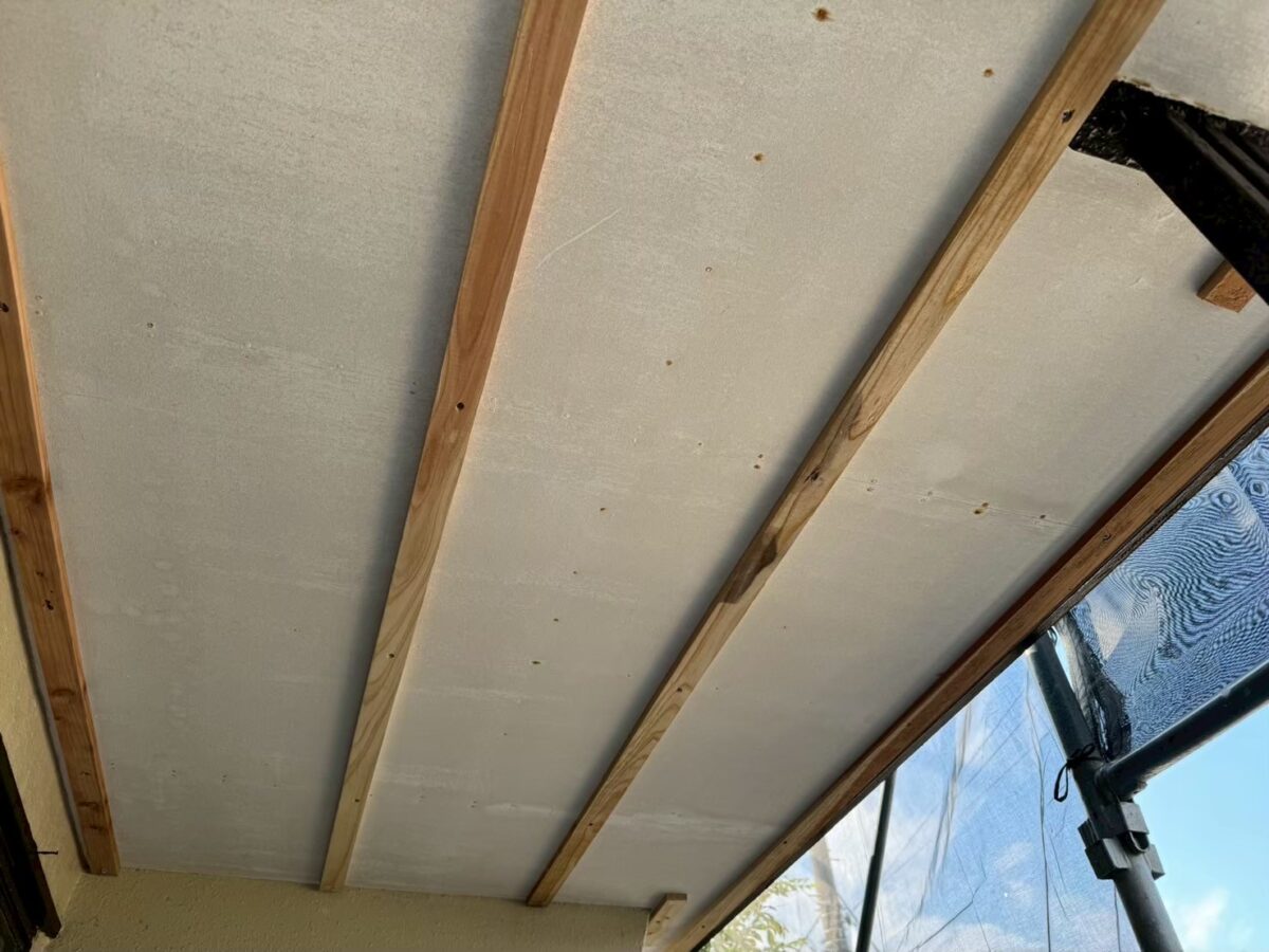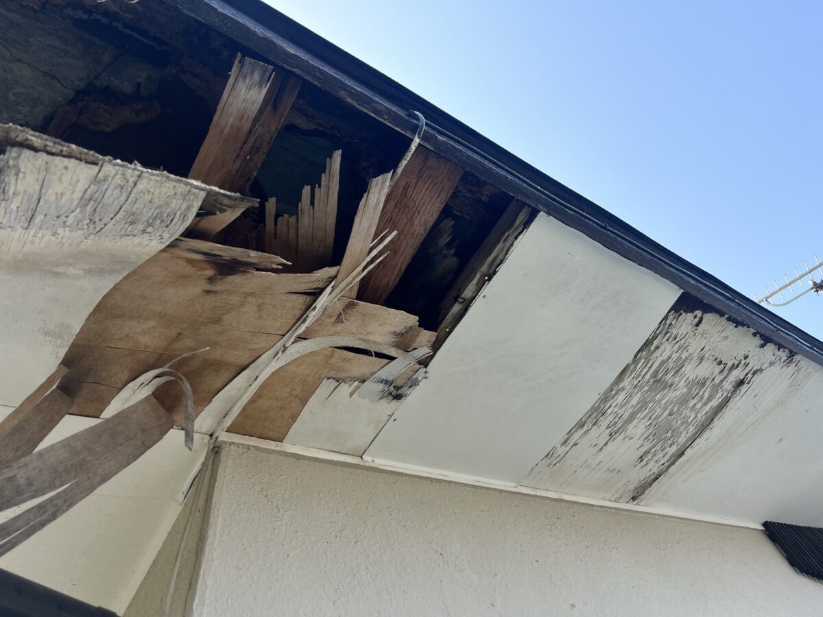今回の現場はお隣の別宅にお施主様がお住いで、コチラの物件は暫く使っておらず空家になっていたそうで、この度また利用すると言う事で外装から内装まで大規模に改修されると言う事で私達は外装リフォームの担当となりました、屋根が雨漏りしていまして軒天が部分的に破損しています。