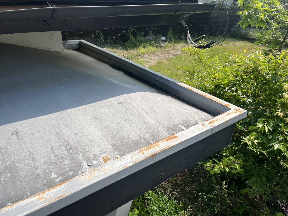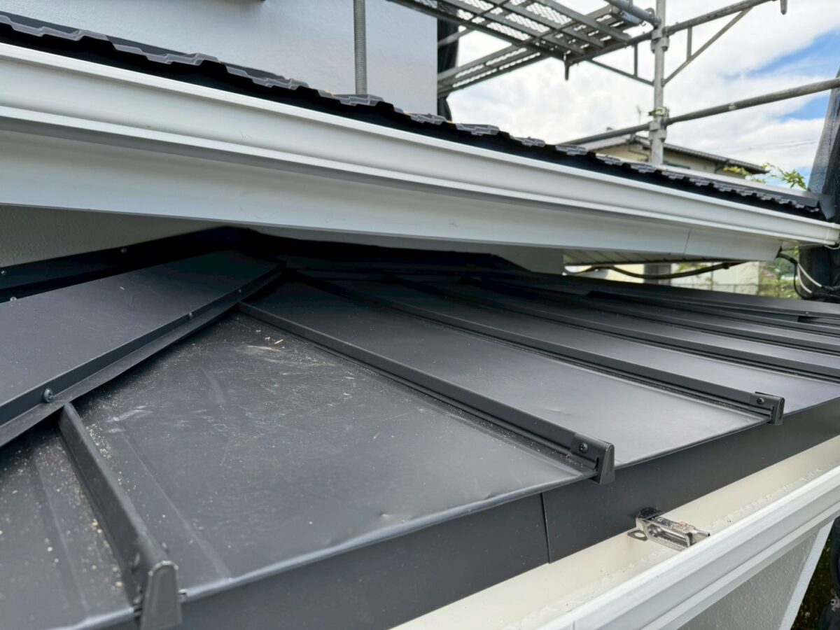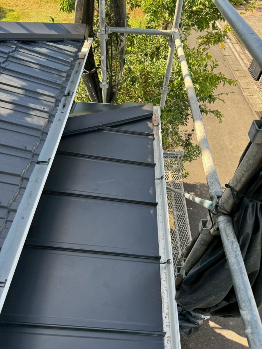 玄関ポーチは元々、内樋といってパラペットの中に板金で箱樋を作っているタイプでした、これは雨漏りやゴミの詰まりが起こり易いので、屋根の形を替えて外側に雨樋を取り付けるやり方に変更致しました、屋根材は同じレクトプルーフを使いたかったのですが勾配が低いので立て葺きを施工いたしました。
